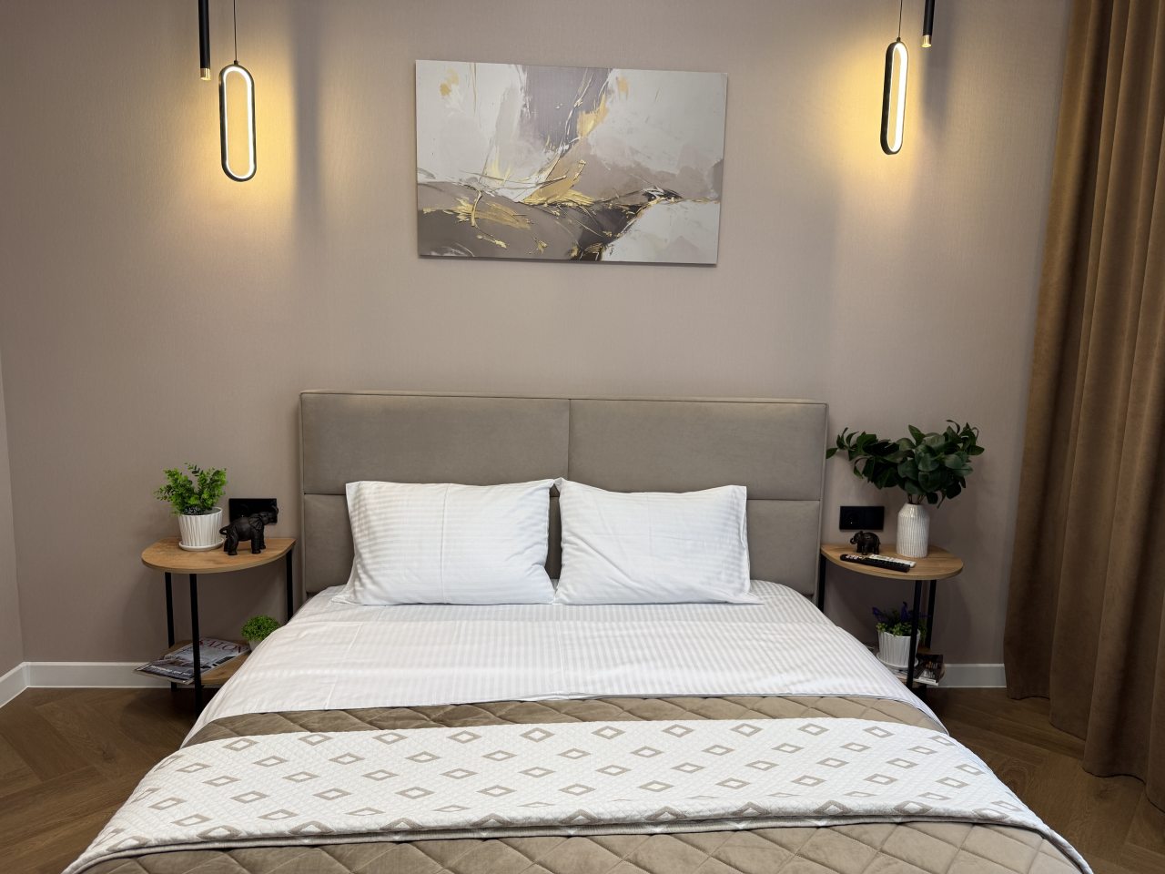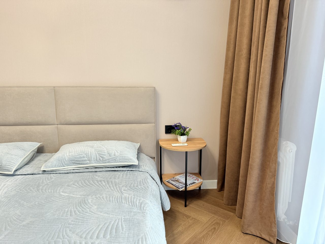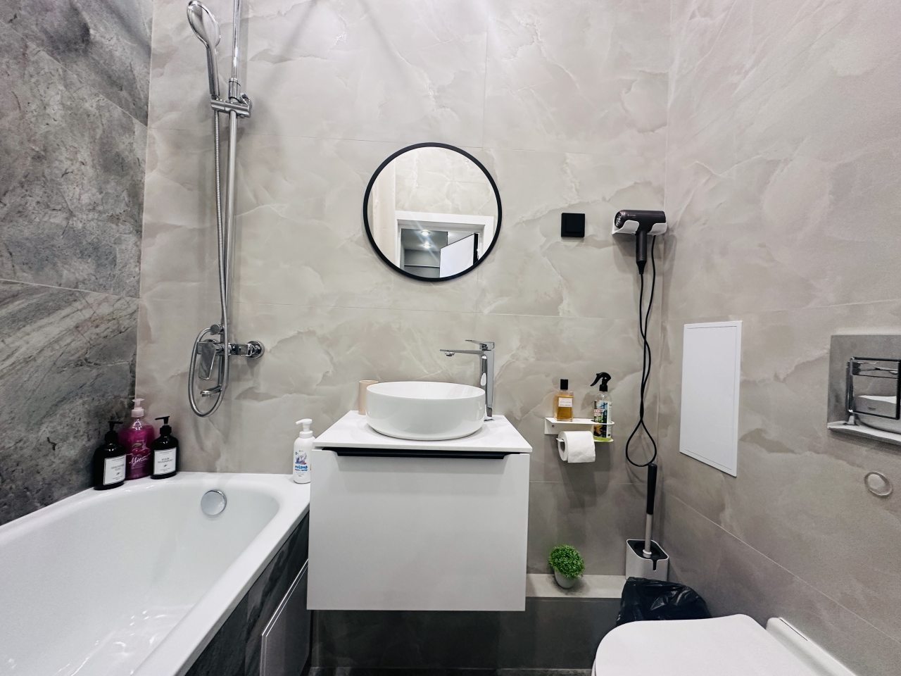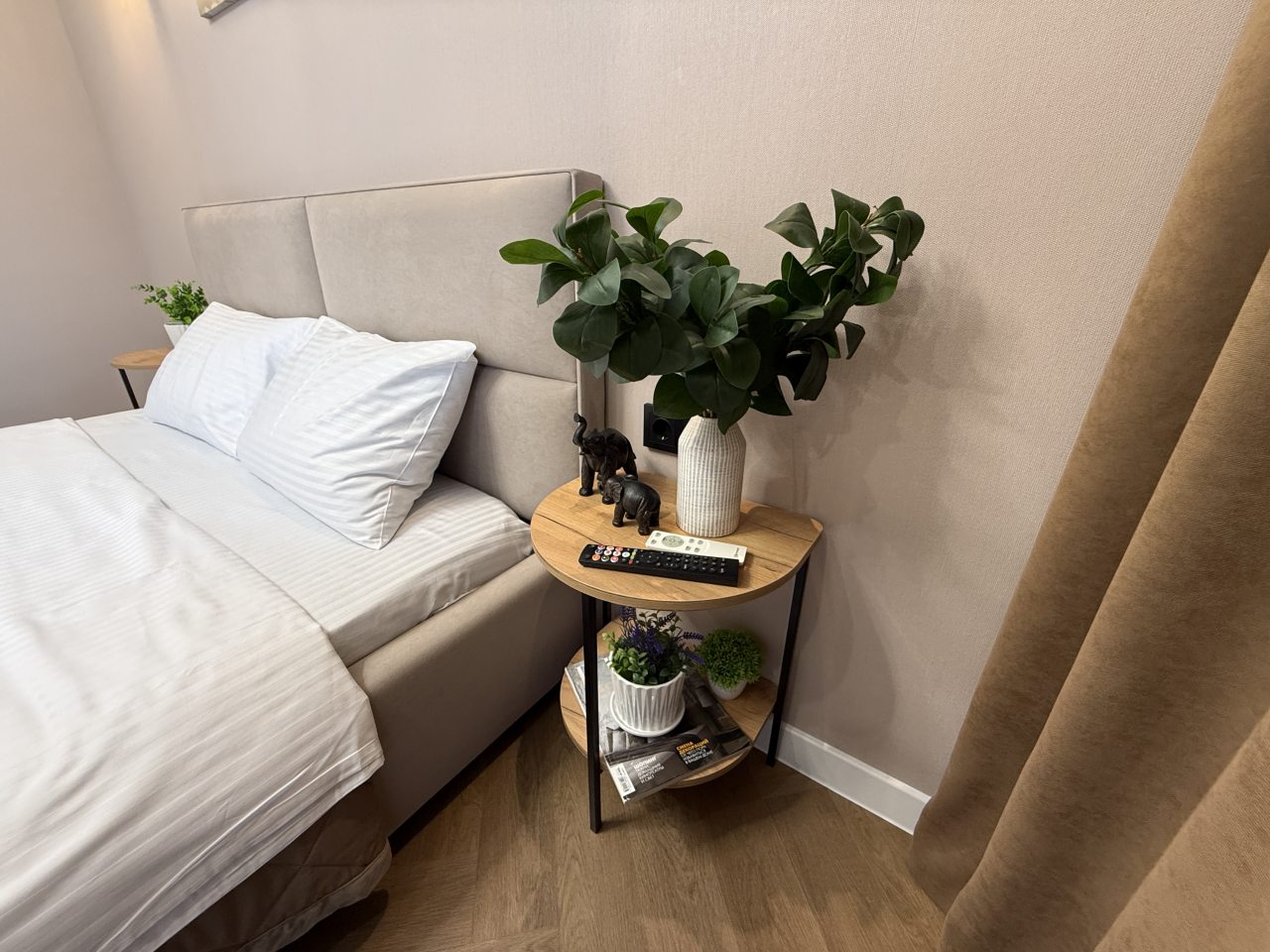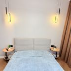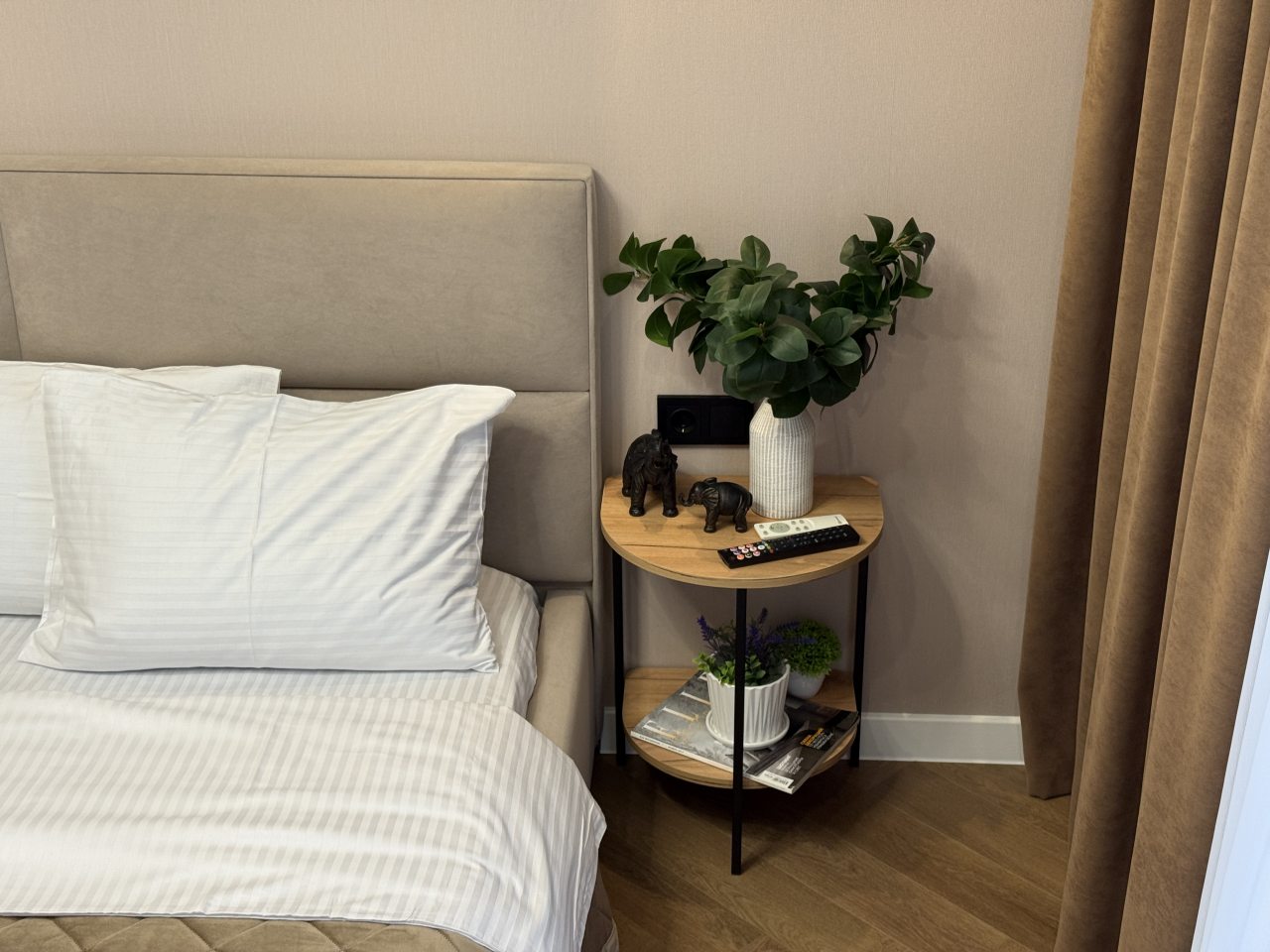 На просторной площади в 40 квадратных метров продумана каждая деталь для вашего удобства, включая кровать с мягким изголовьем, современные и стильные источники освещения, телевизор с различными онлайн-кинотеатрами, доступ в интернет, большой шкаф-купе с зеркалом в полный рост, стиральную машину и утюг с гладильной доской. В ванной вы найдете все необходимое: от фена до туалетно-косметических средств.