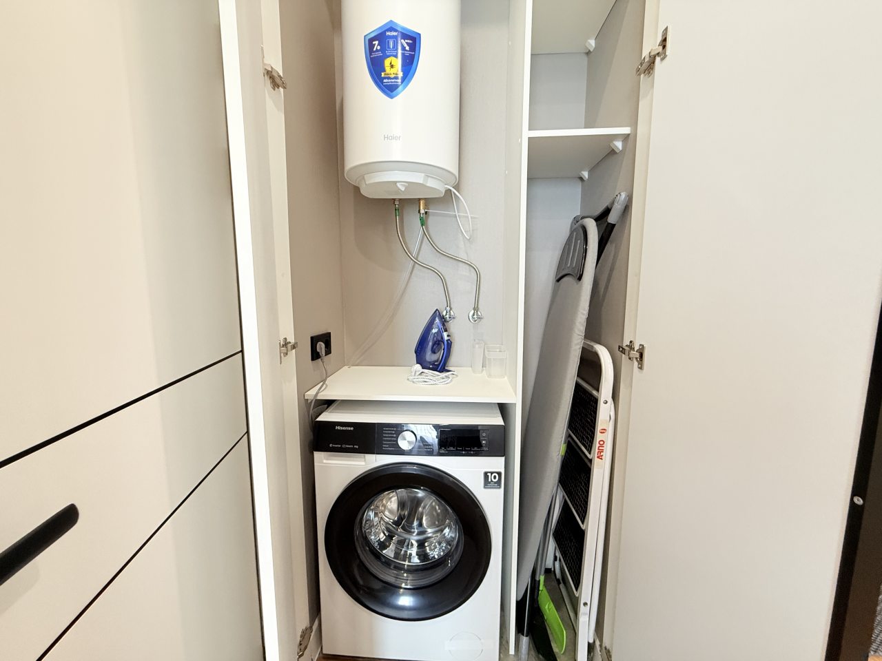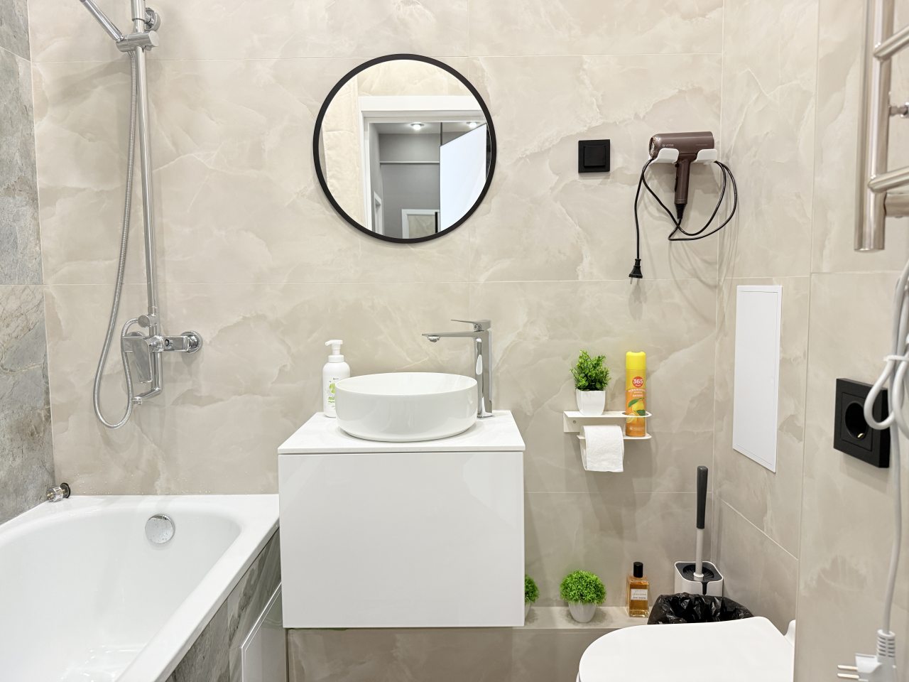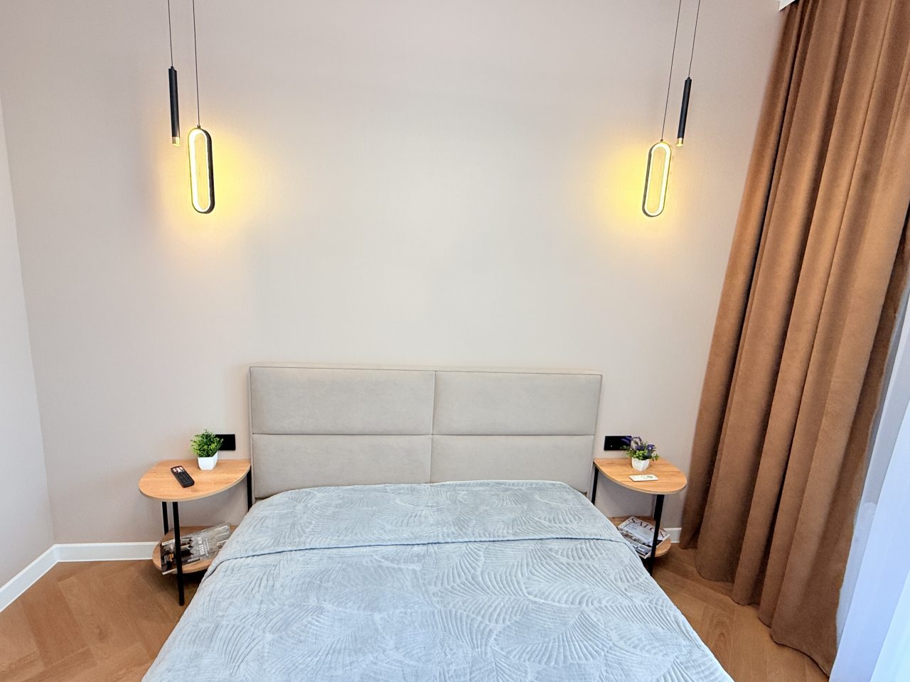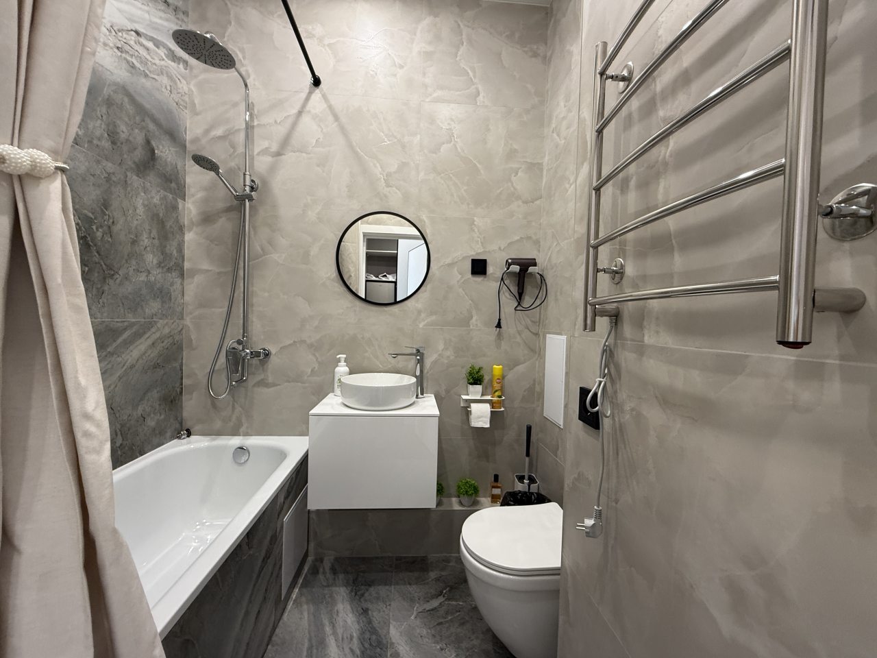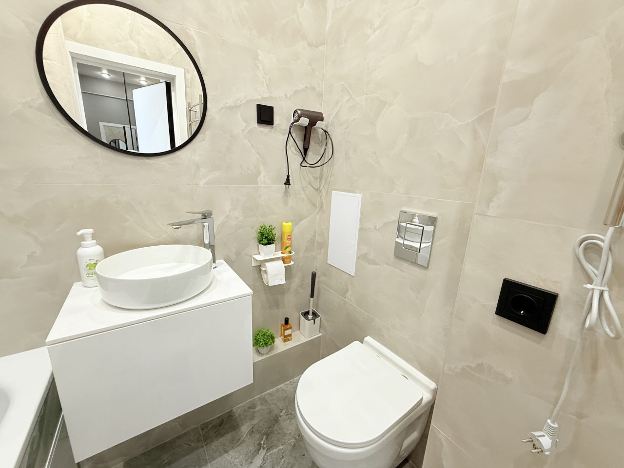 На просторной площади в 40 квадратных метров продумана каждая деталь для вашего удобства, включая кровать с мягким изголовьем, современные и стильные источники освещения, телевизор с различными онлайн-кинотеатрами, доступ в интернет, большой шкаф-купе с зеркалом в полный рост, стиральную машину и утюг с гладильной доской. В ванной вы найдете все необходимое: от фена до туалетно-косметических средств.
