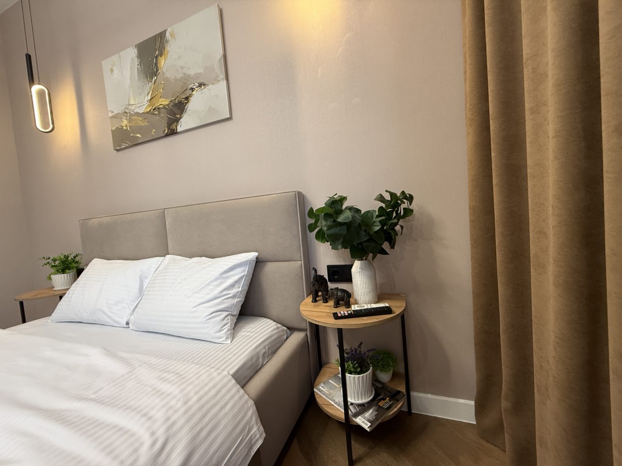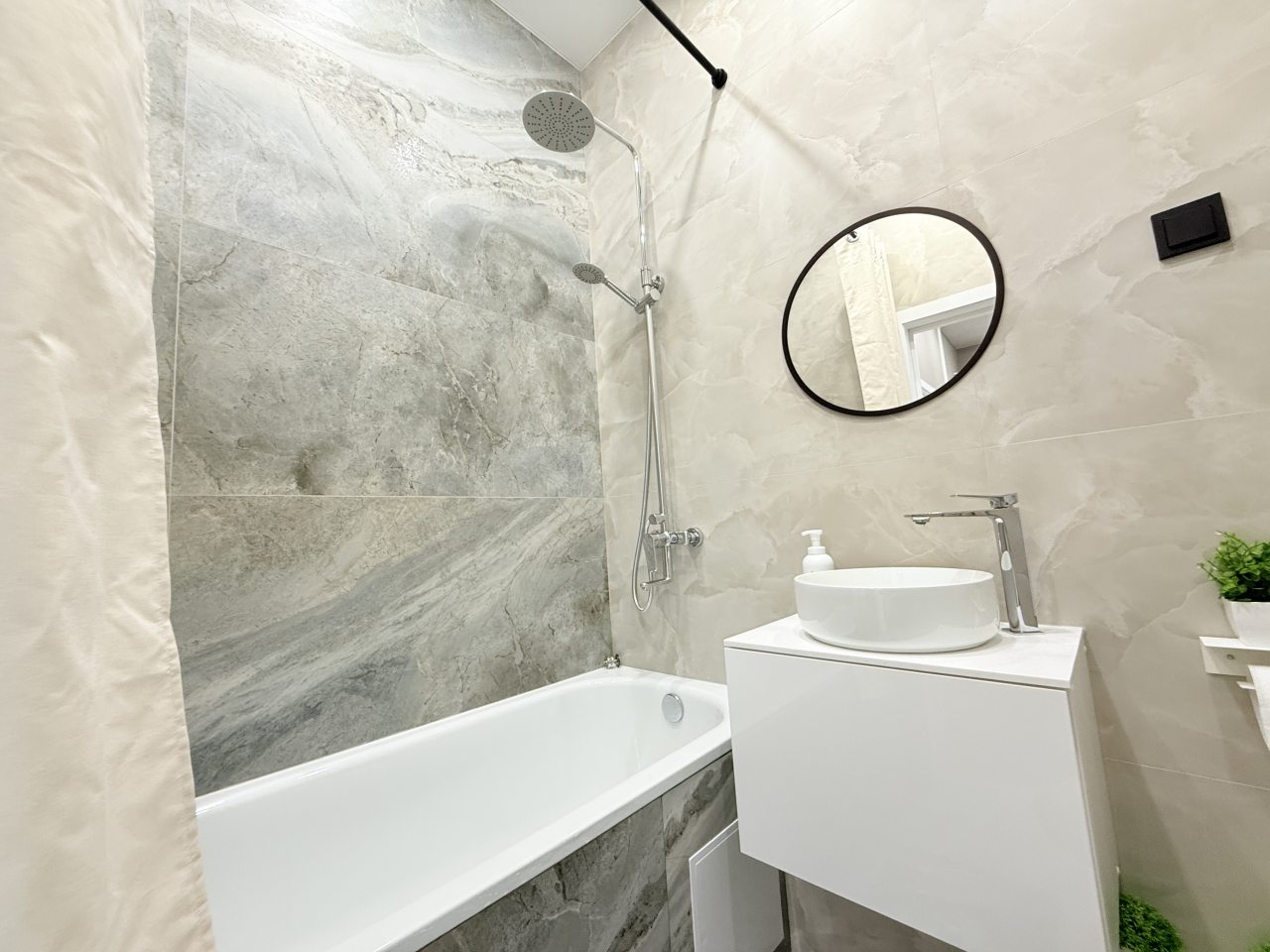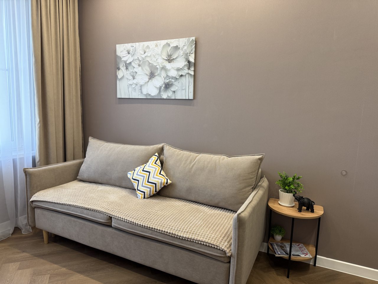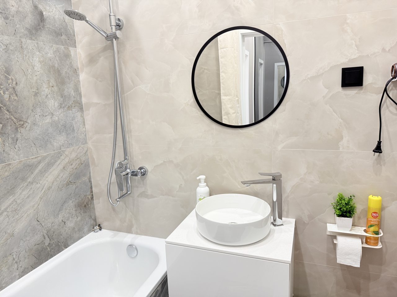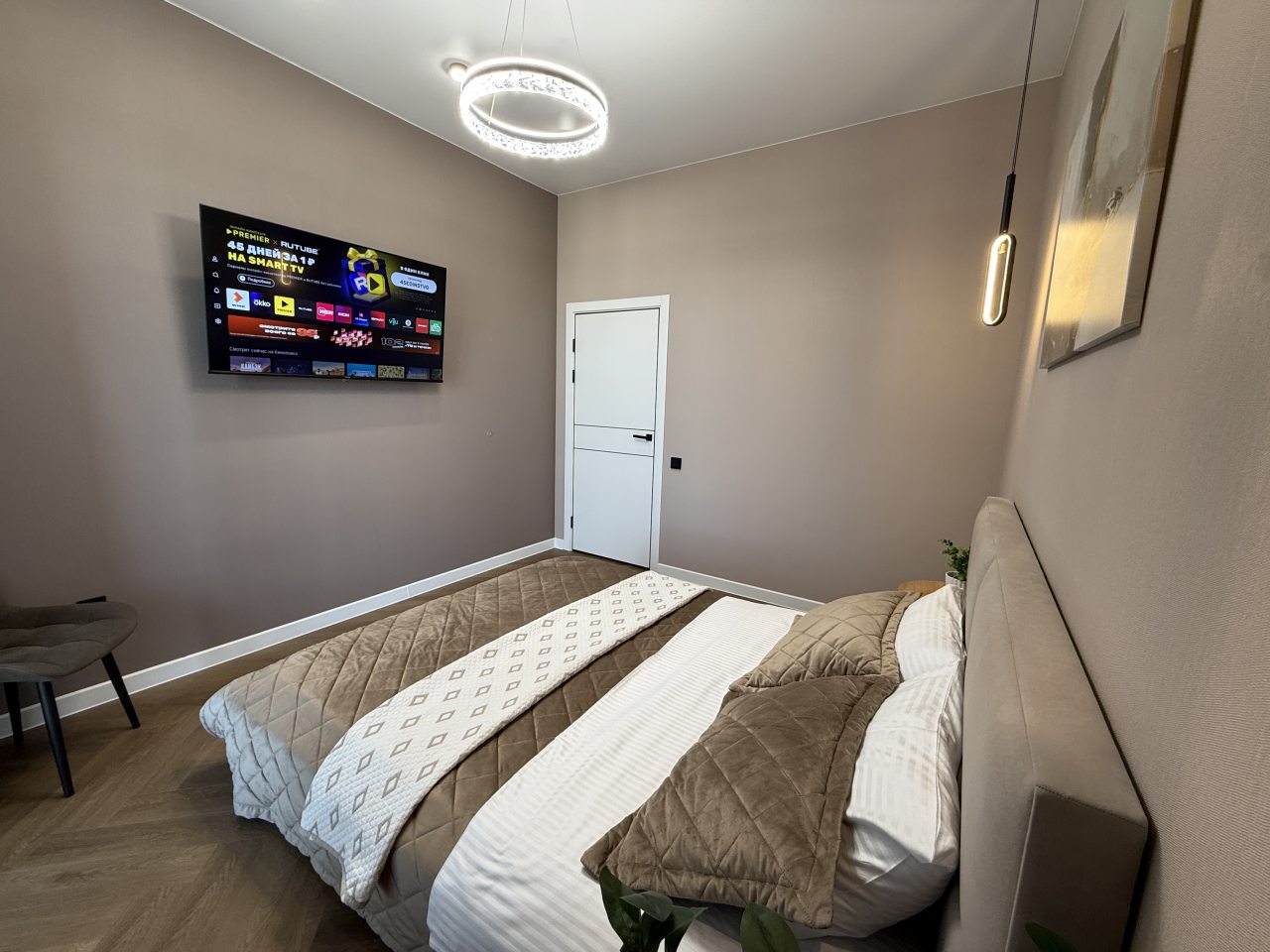 На просторной площади в 40 квадратных метров продумана каждая деталь для вашего удобства, включая кровать с мягким изголовьем, современные и стильные источники освещения, телевизор с различными онлайн-кинотеатрами, доступ в интернет, большой шкаф-купе с зеркалом в полный рост, стиральную машину и утюг с гладильной доской. В ванной вы найдете все необходимое: от фена до туалетно-косметических средств.