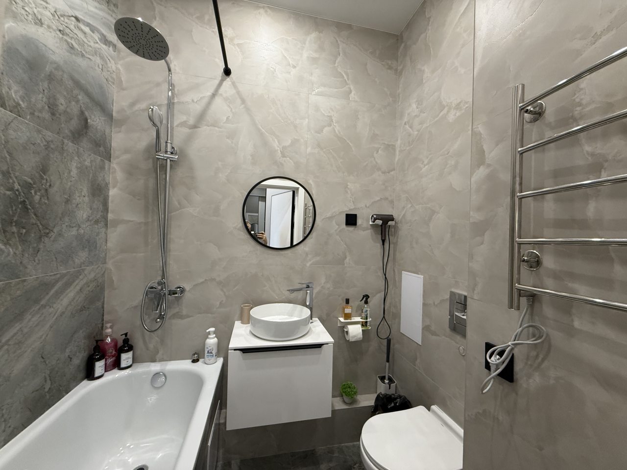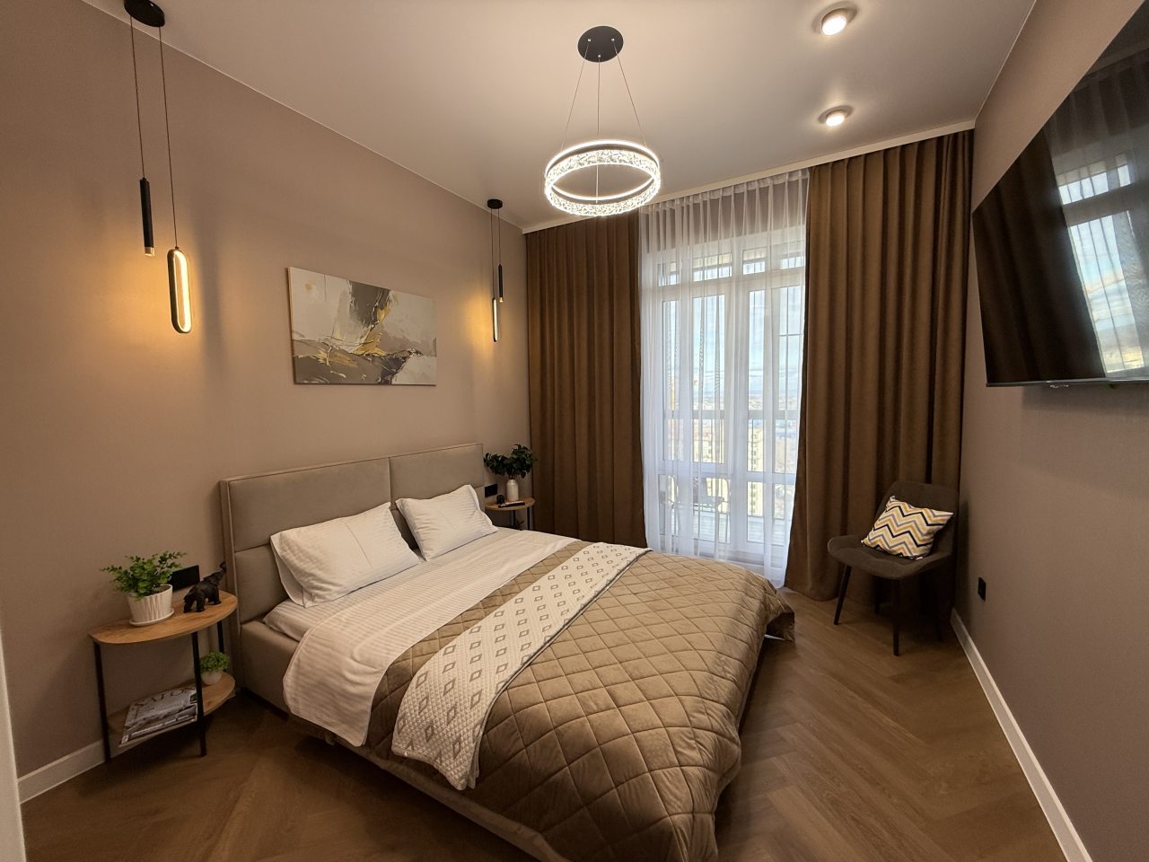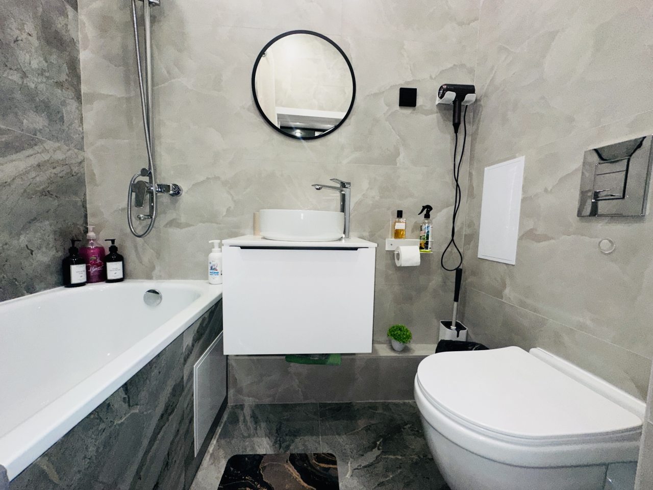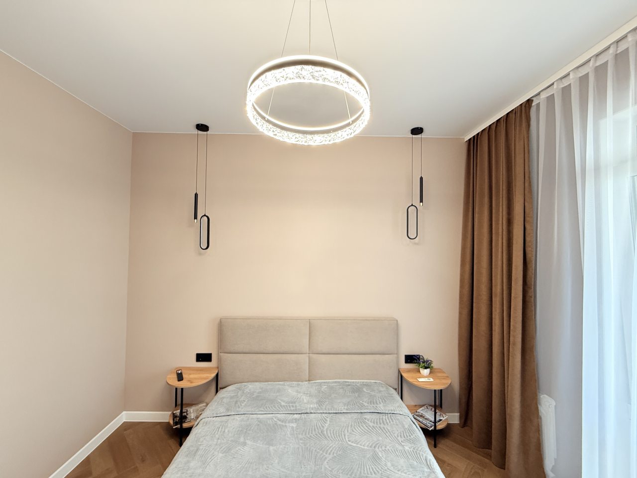 На просторной площади в 40 квадратных метров продумана каждая деталь для вашего удобства, включая кровать с мягким изголовьем, современные и стильные источники освещения, телевизор с различными онлайн-кинотеатрами, доступ в интернет, большой шкаф-купе с зеркалом в полный рост, стиральную машину и утюг с гладильной доской. В ванной вы найдете все необходимое: от фена до туалетно-косметических средств.