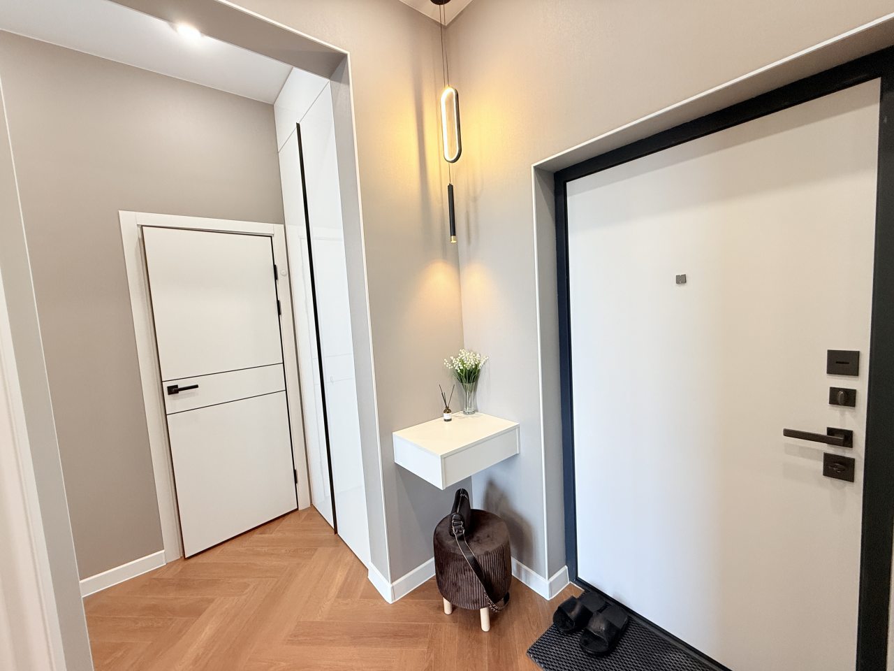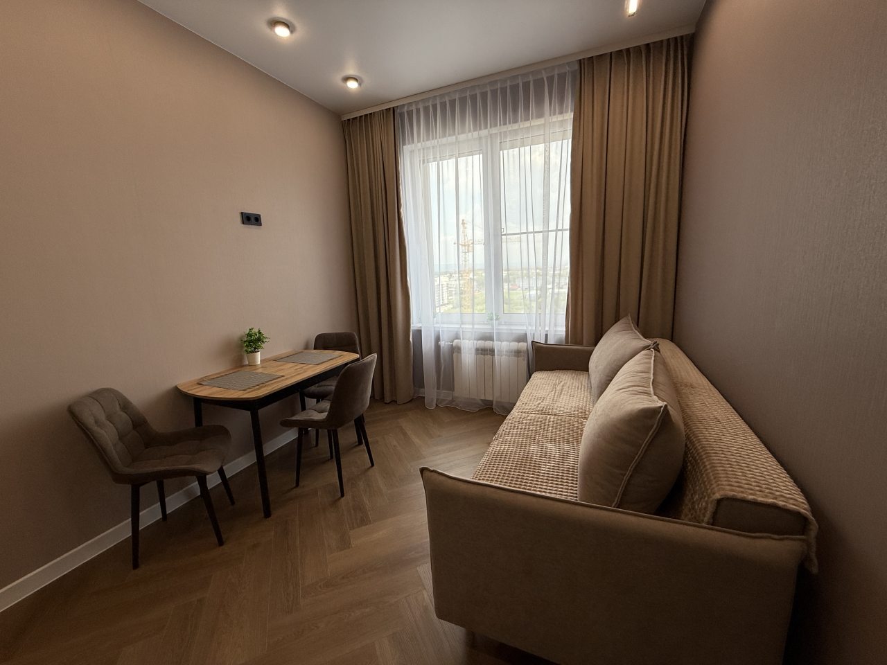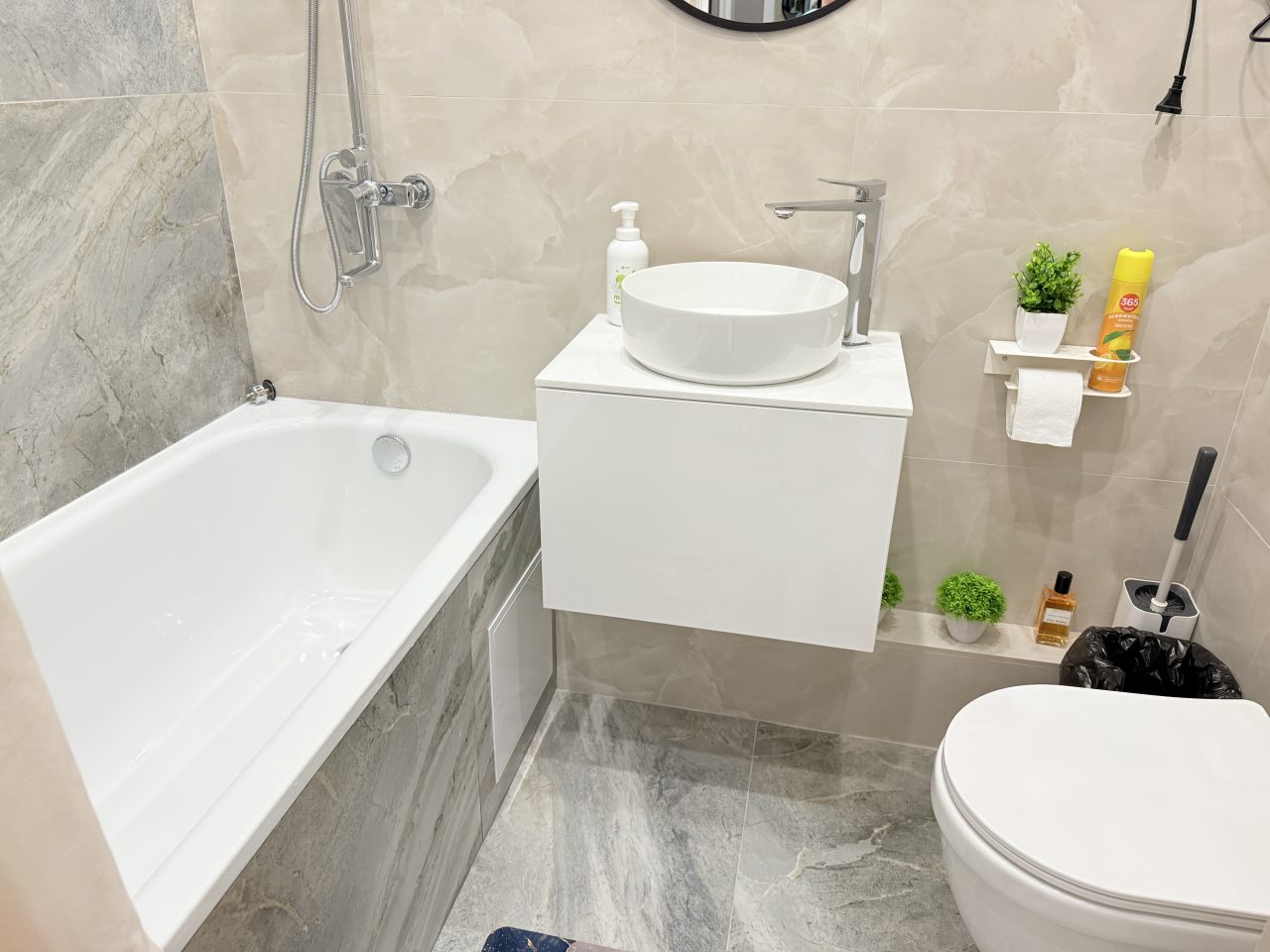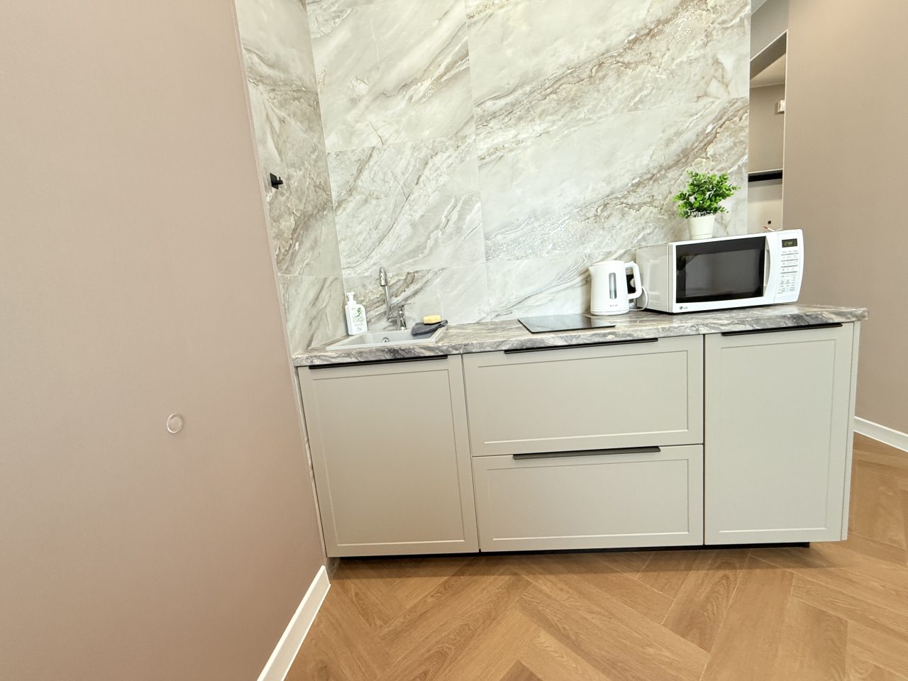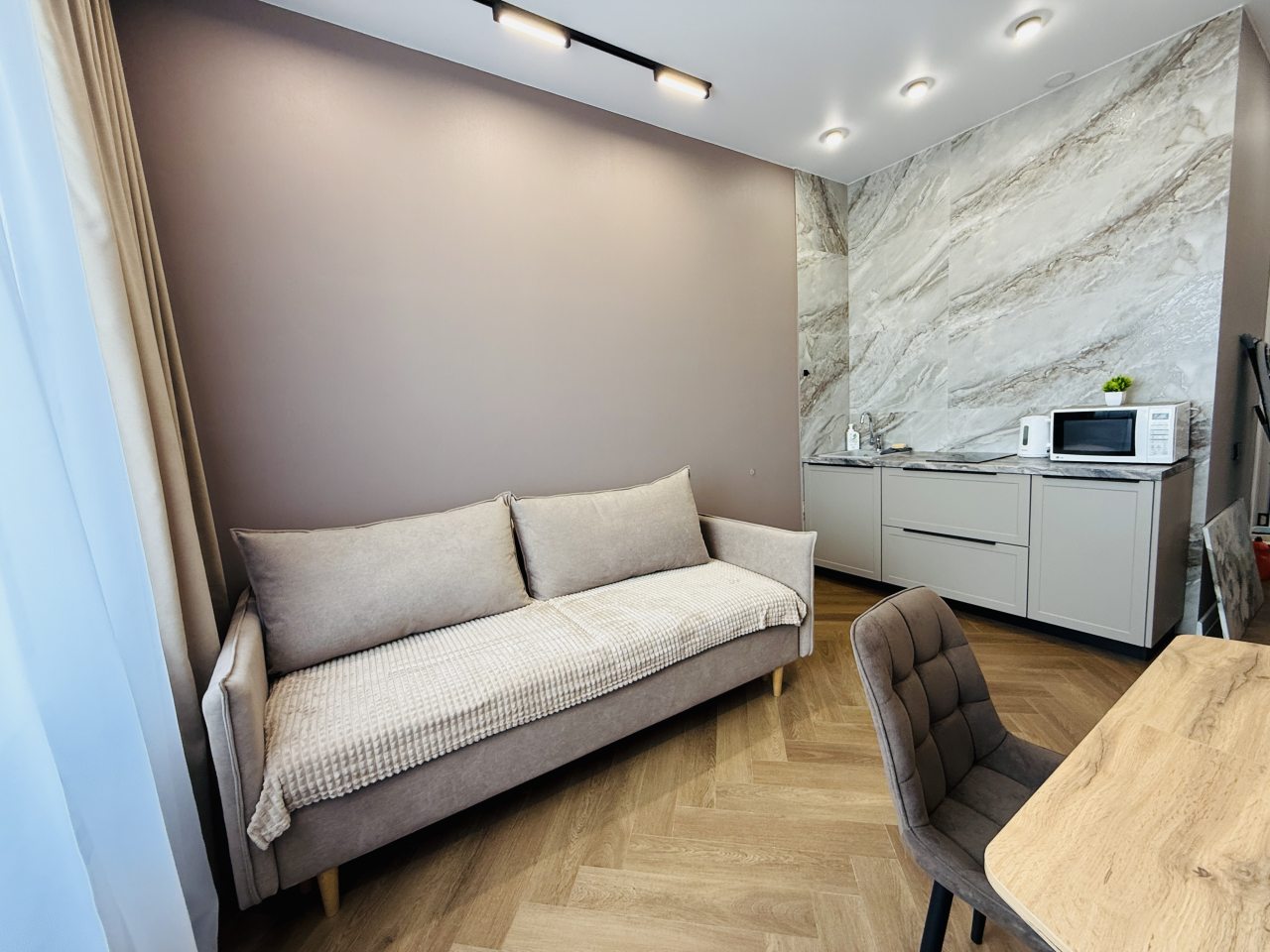 На просторной площади в 40 квадратных метров продумана каждая деталь для вашего удобства, включая кровать с мягким изголовьем, современные и стильные источники освещения, телевизор с различными онлайн-кинотеатрами, доступ в интернет, большой шкаф-купе с зеркалом в полный рост, стиральную машину и утюг с гладильной доской. В ванной вы найдете все необходимое: от фена до туалетно-косметических средств.