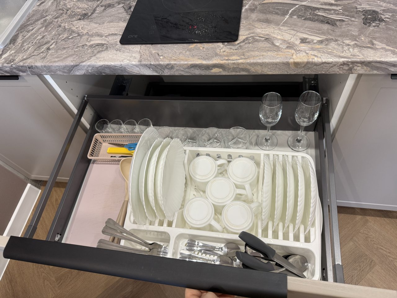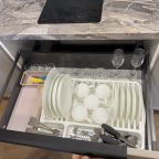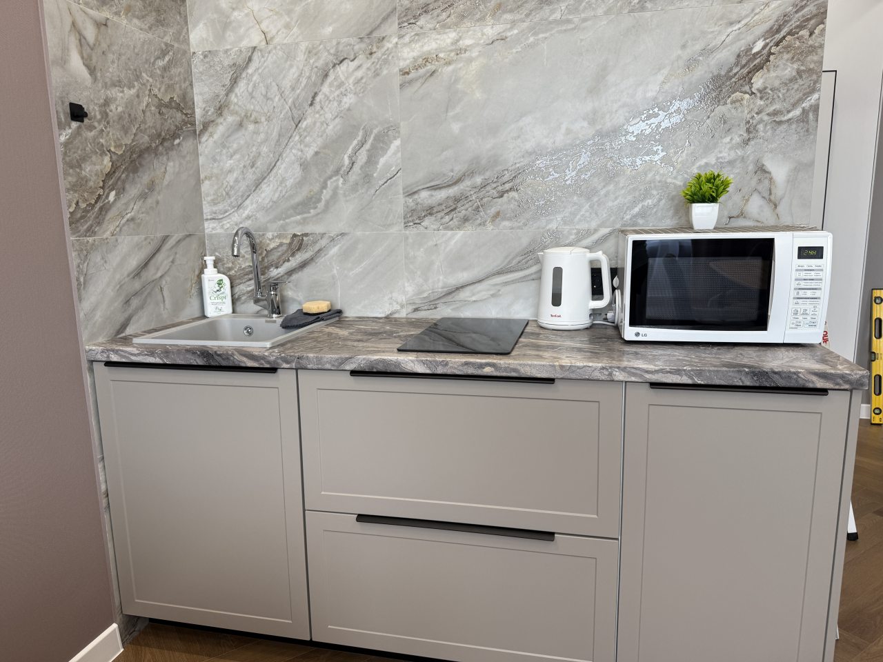 Обеденная зона есть как на кухне, так и на лоджии с панорамными окнами, откуда вы можете созерцать индустриальные пейзажи за чашкой чая или кофе. Для того, чтобы вы могли порадовать себя домашними блюдами, предусмотрены варочная панель, различная посуда и микроволновая печь.