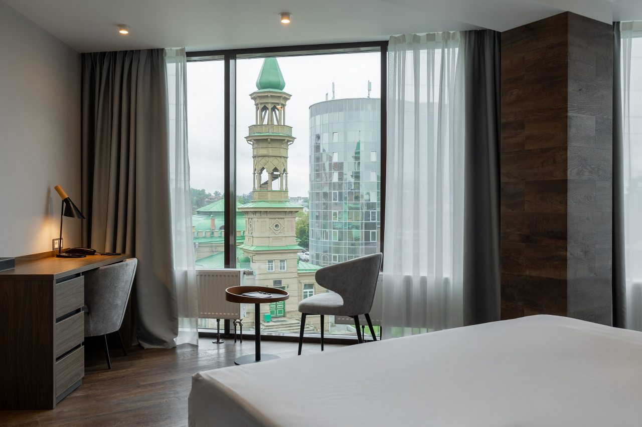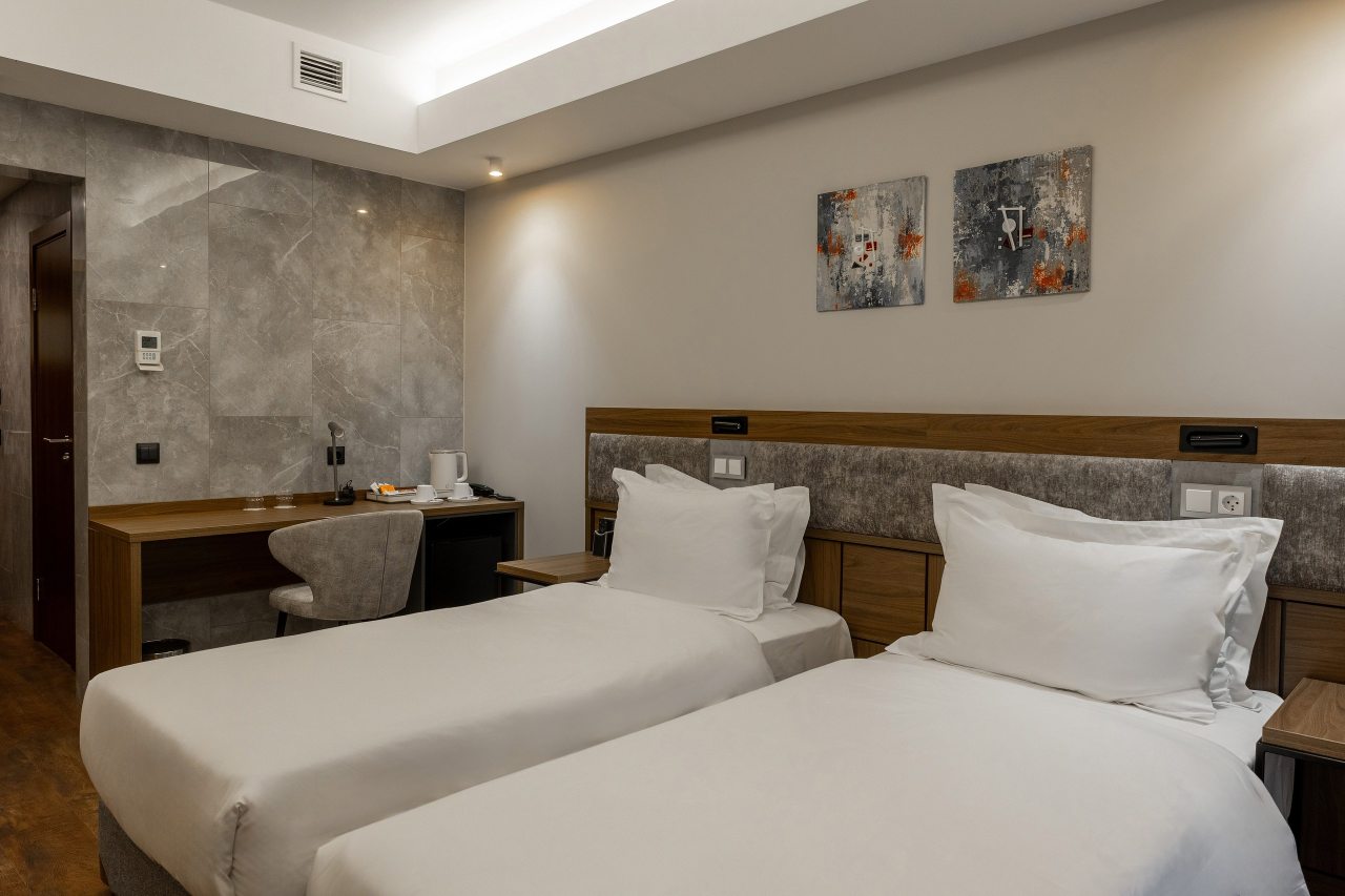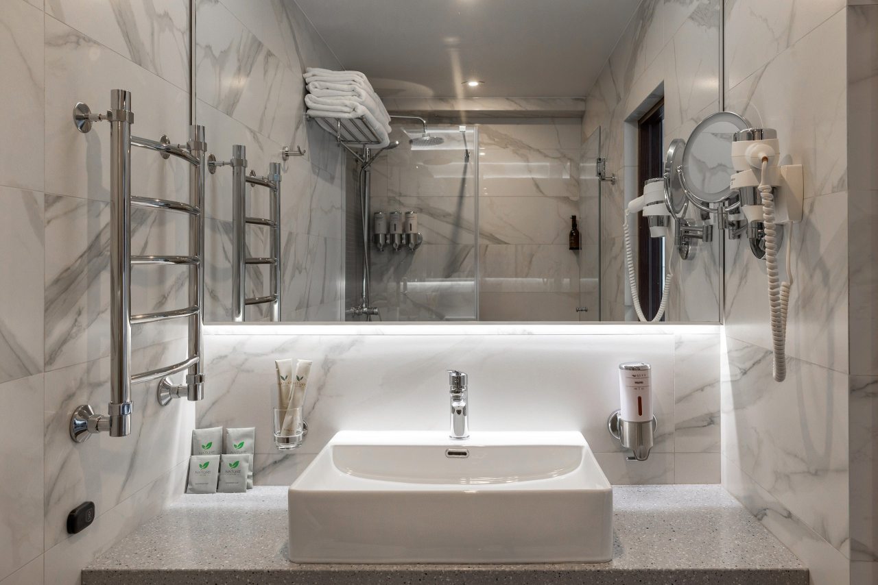 Номера выполнены в едином стиле, сочетающем элегантный и функциональный модерн и мягкий лофт. Из оснащения есть двуспальная или односпальная кровать с набором постельного белья, светильник, прикроватные тумбочки, рабочий стол. Чтобы быть на связи с родными и по различным деловым вопросам работает Wi-Fi. Затемнённые шторы помогут получить качественный сон. В ванной комнате есть вся необходимая сантехника, фен, средства личной гигиены, набор полотенец.