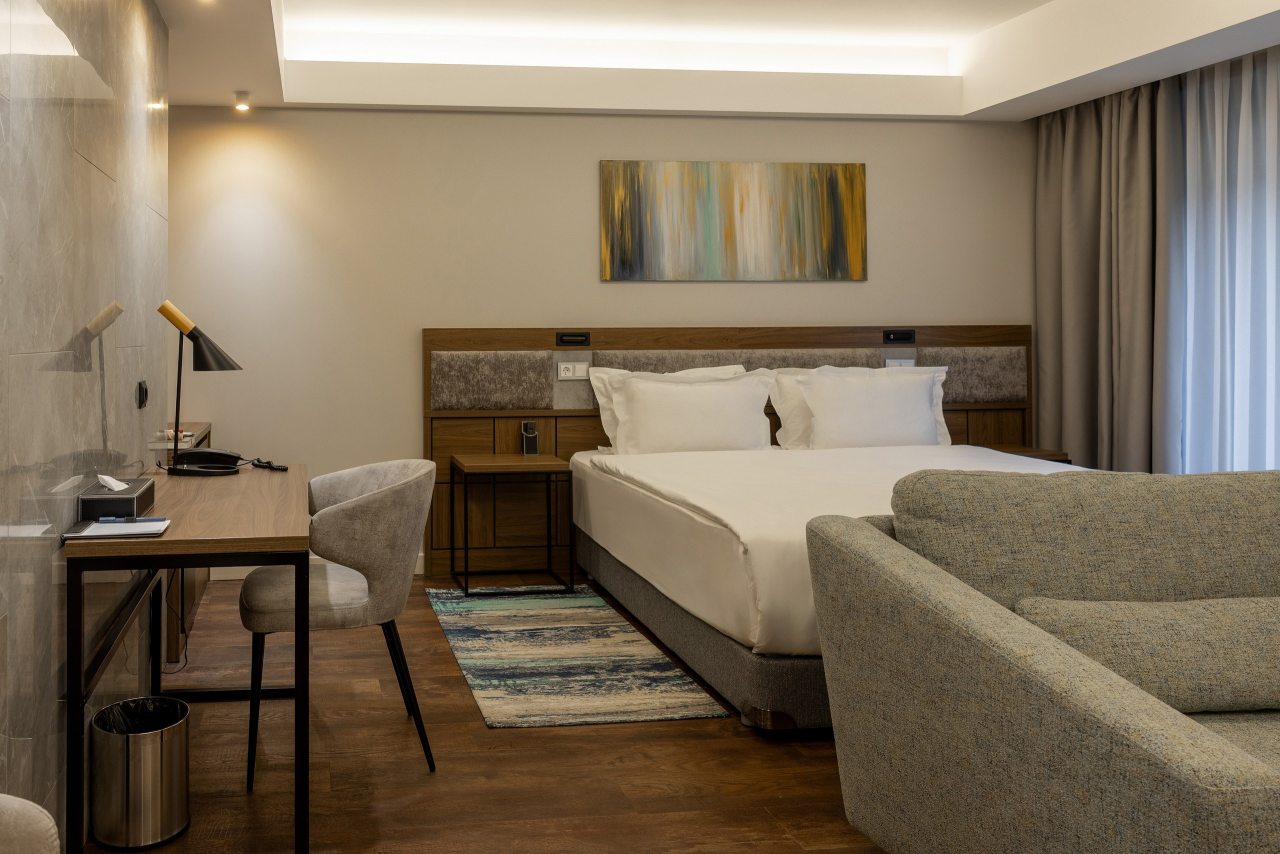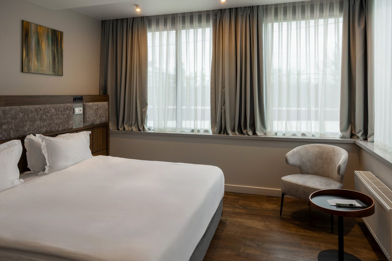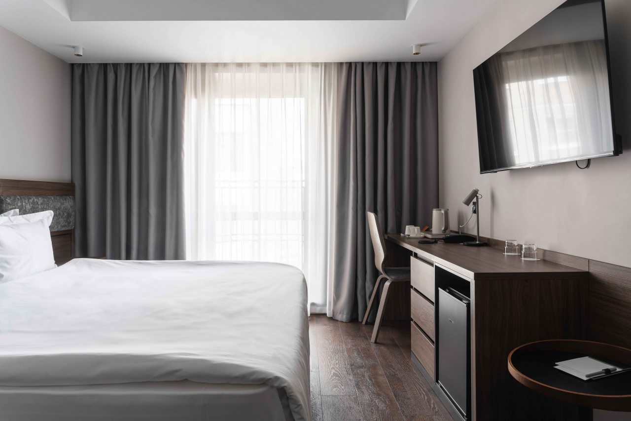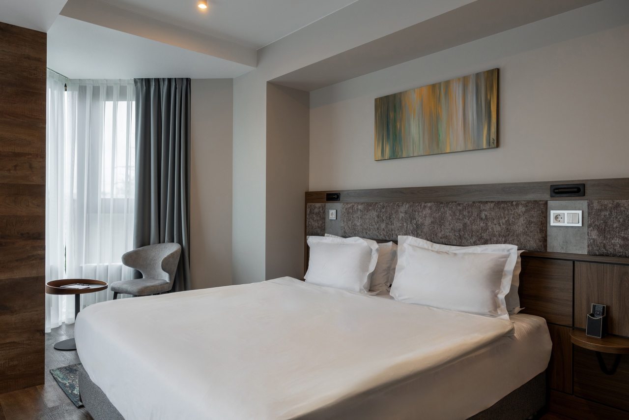 Номера выполнены в едином стиле, сочетающем элегантный и функциональный модерн и мягкий лофт. Из оснащения есть двуспальная или односпальная кровать с набором постельного белья, светильник, прикроватные тумбочки, рабочий стол. Чтобы быть на связи с родными и по различным деловым вопросам работает Wi-Fi. Затемнённые шторы помогут получить качественный сон. В ванной комнате есть вся необходимая сантехника, фен, средства личной гигиены, набор полотенец.