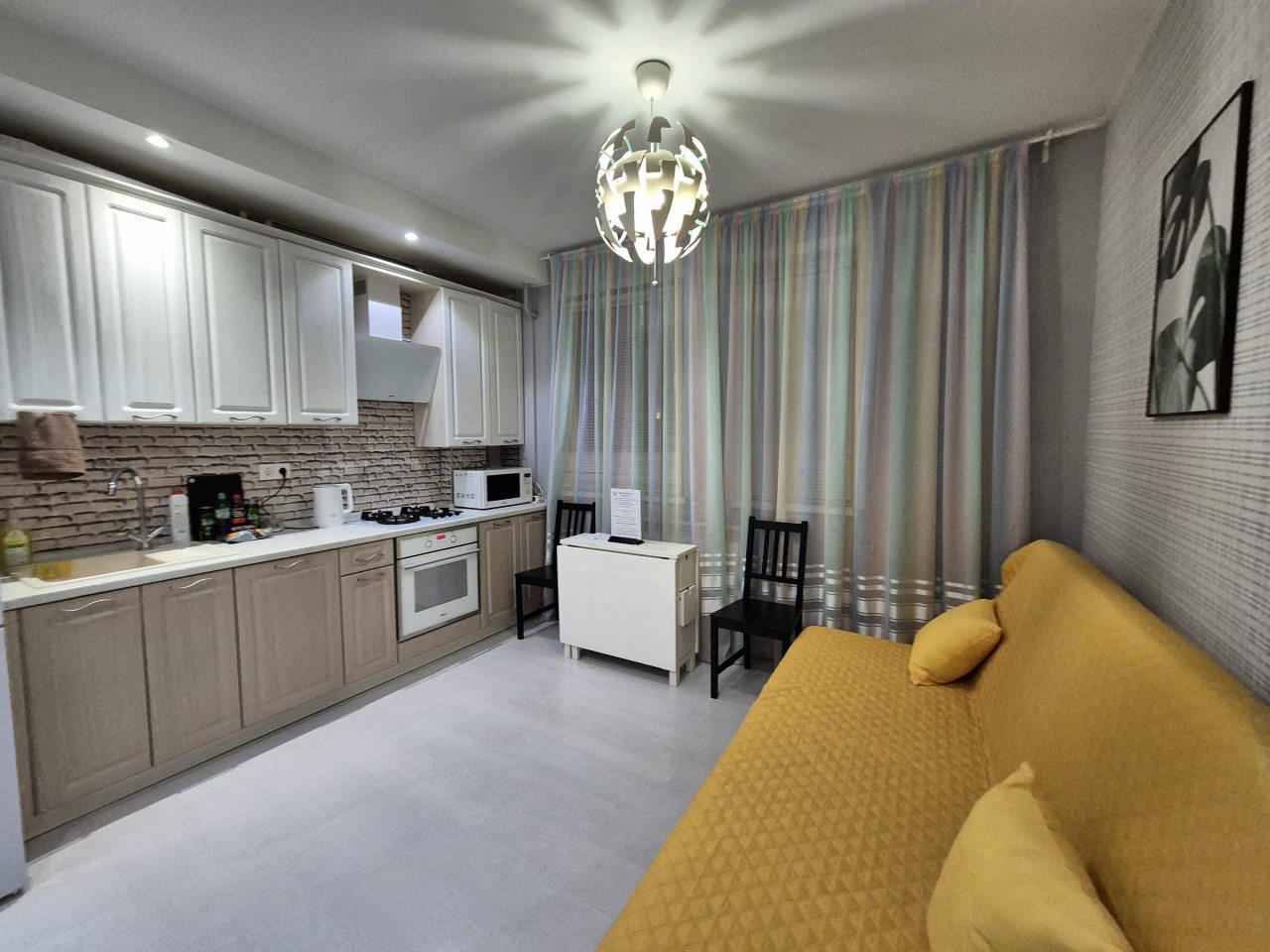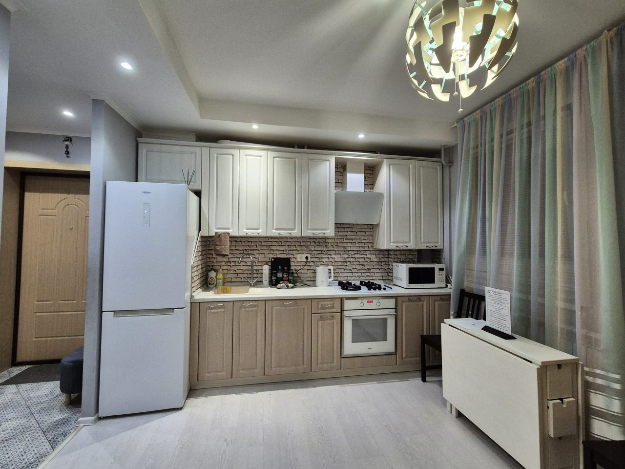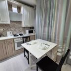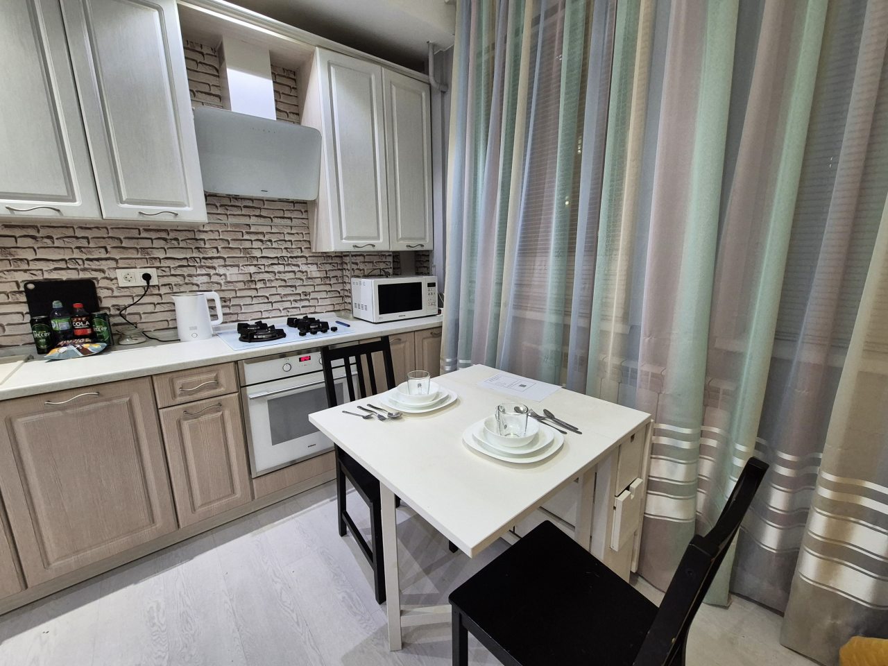 Просторная кухня укомплектована гарнитуром, газовой плитой, микроволновой печью, электрочайником, духовым шкафом, холодильником, чайным набором. В доступности продовольственный магазин.
