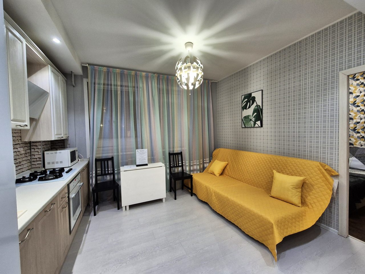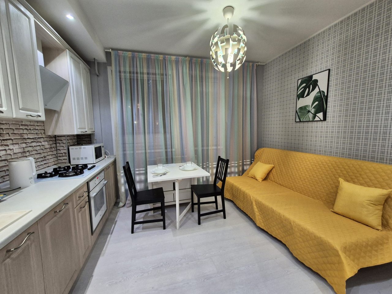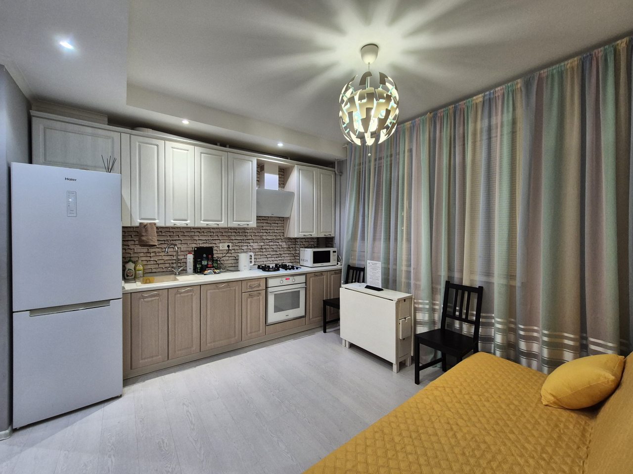 Просторная кухня укомплектована гарнитуром, газовой плитой, микроволновой печью, электрочайником, духовым шкафом, холодильником, чайным набором. В доступности продовольственный магазин.