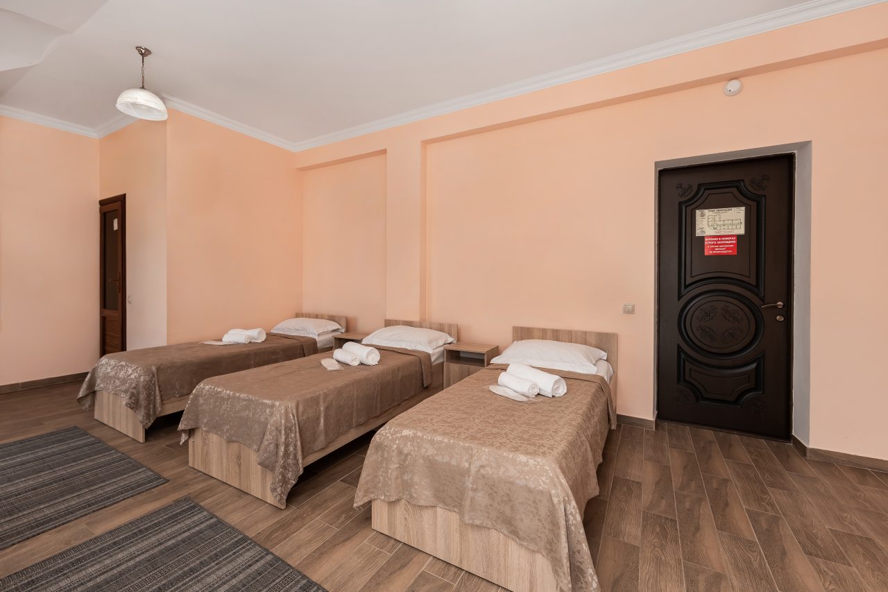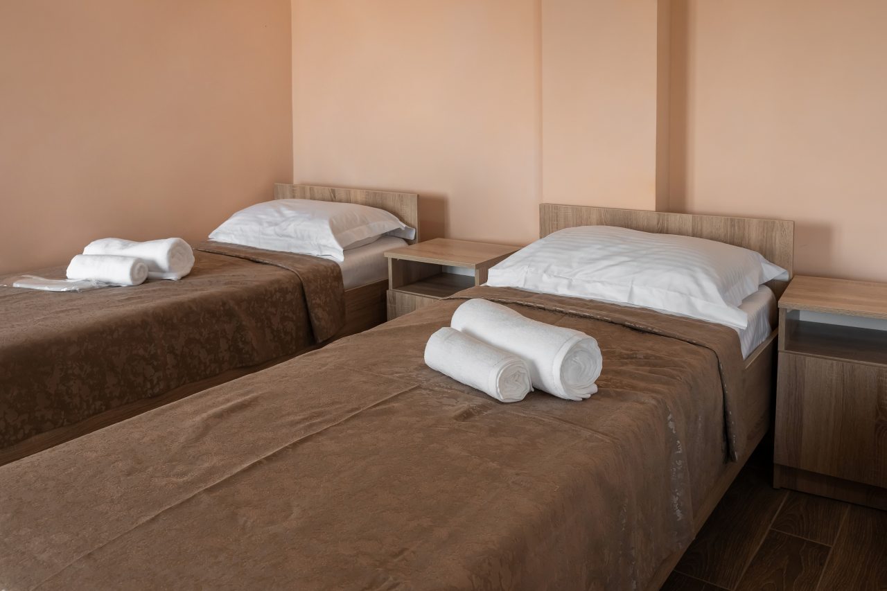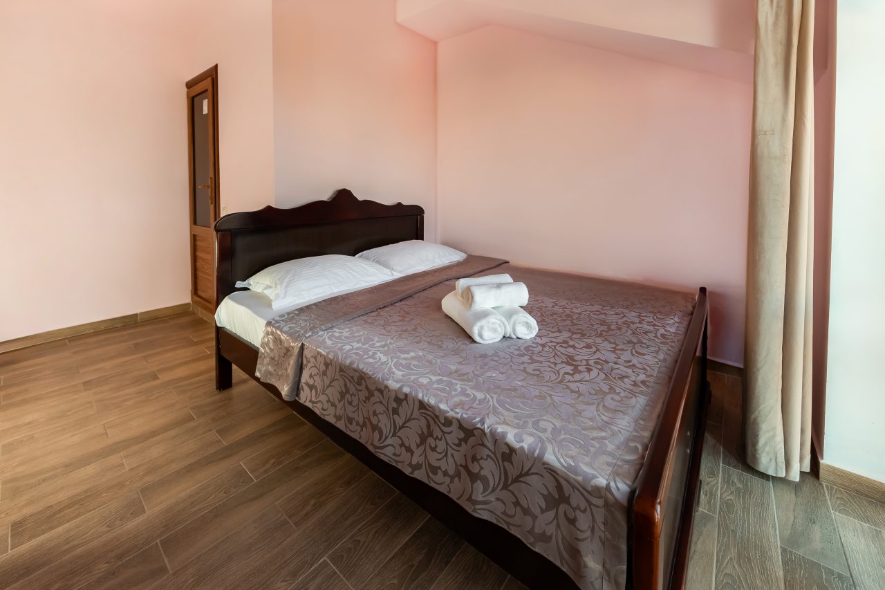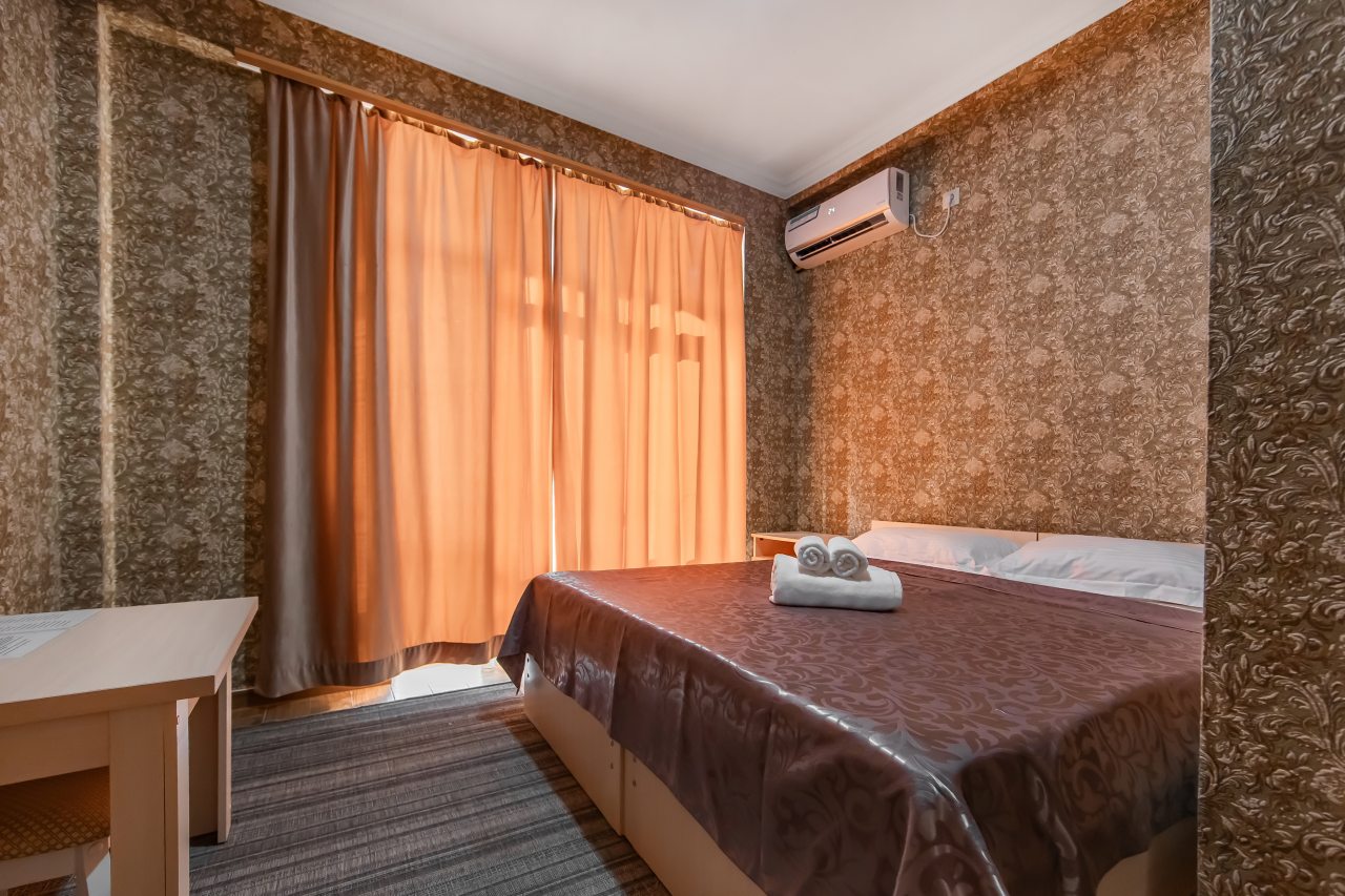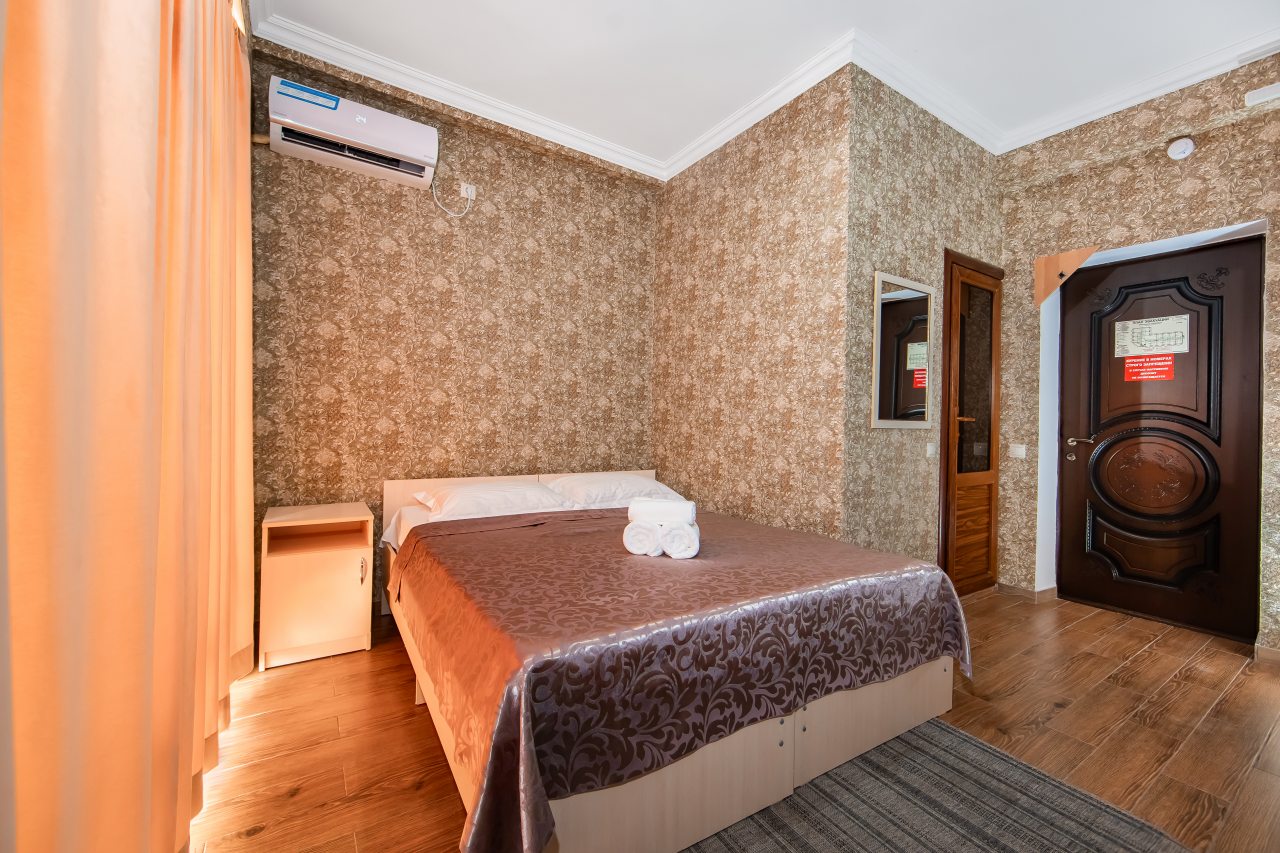 В этой гостинице мы оформляли бронь на двухместный стандартный номер. Общее впечатление у нас неплохое. Чистота здесь поддерживается, самый необходимый минимум присутствует, сплит-система работает. Санузел свой в номерах. Мы брали вариант с большой двуспальной кроватью. Неподалеку от гостиницы есть рестораны, парки. До пляжа от гостиницы минут 10-15, в зависимости от темпа шага.