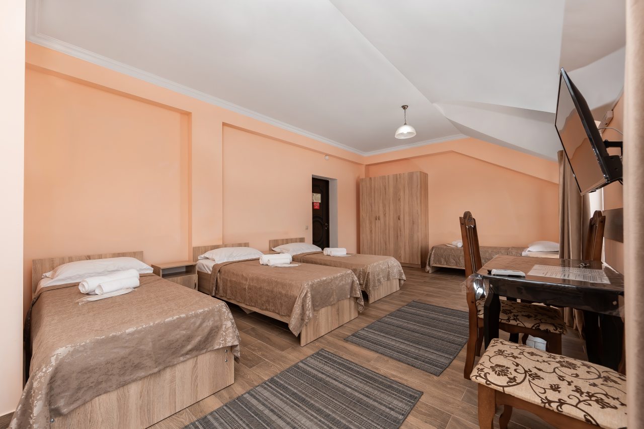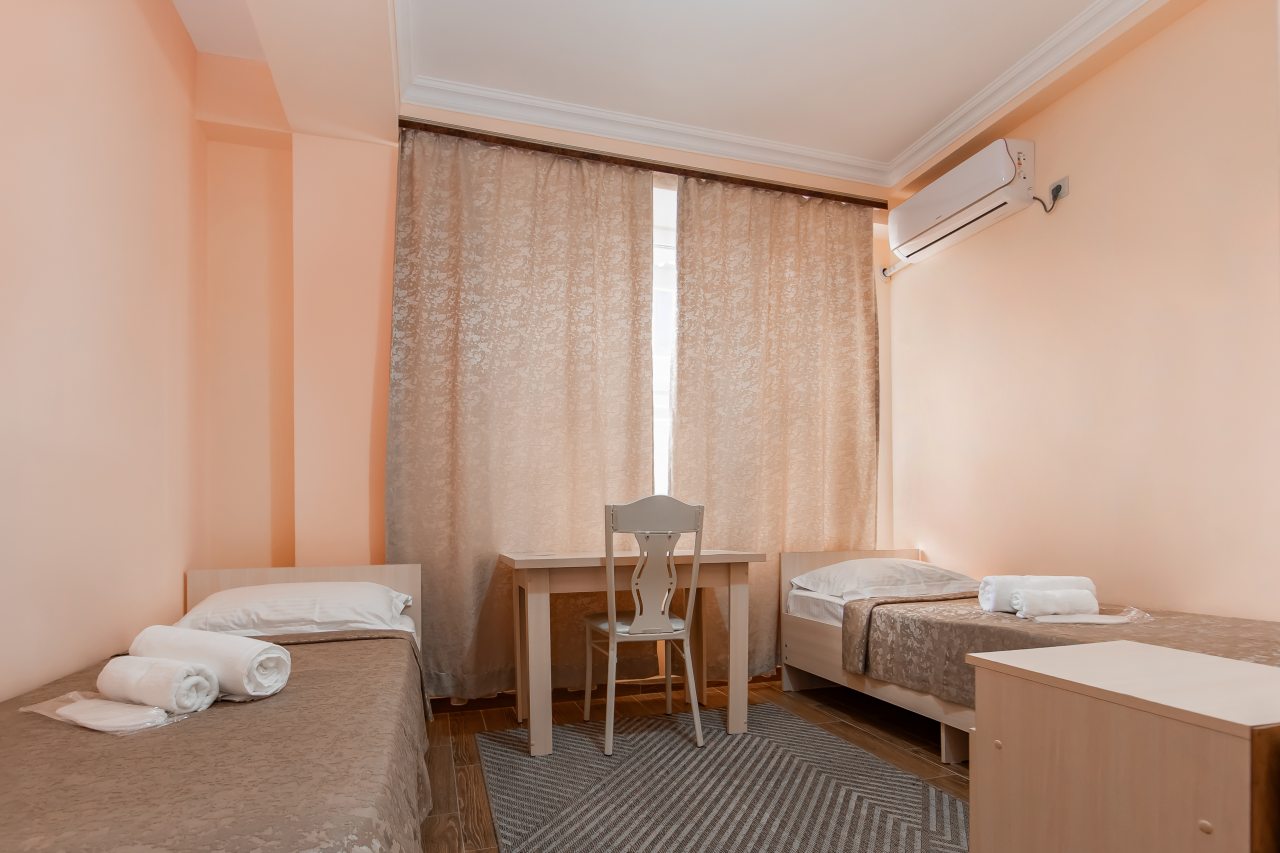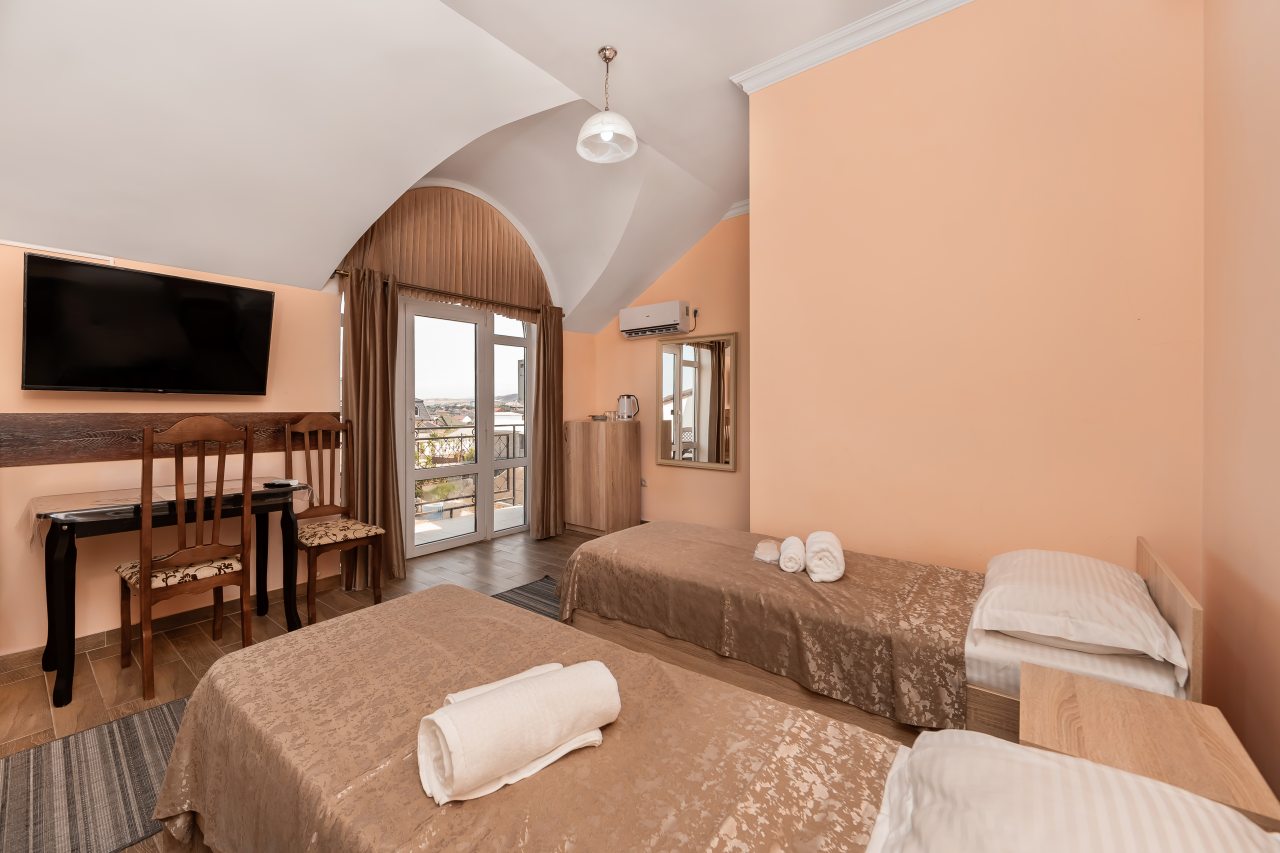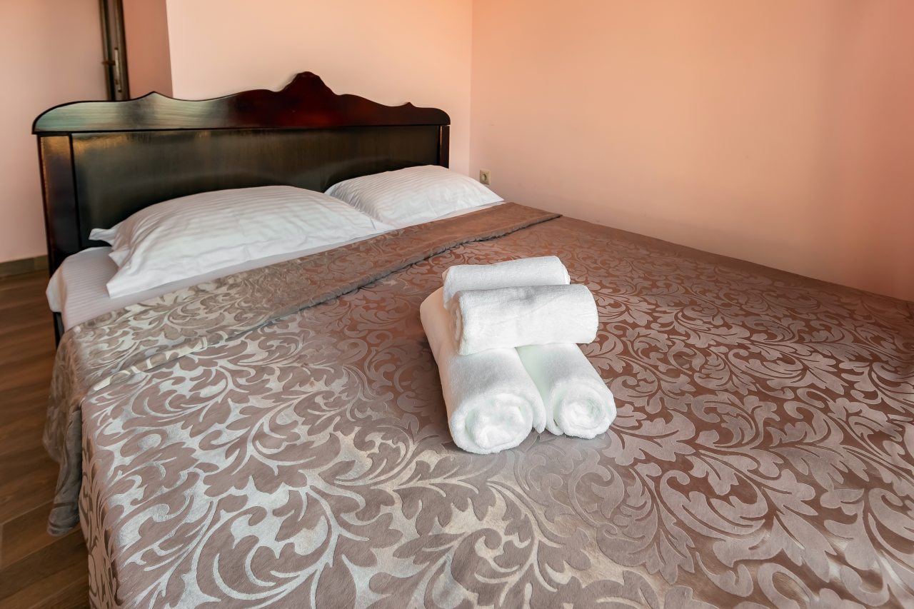 В этой гостинице мы оформляли бронь на двухместный стандартный номер. Общее впечатление у нас неплохое. Чистота здесь поддерживается, самый необходимый минимум присутствует, сплит-система работает. Санузел свой в номерах. Мы брали вариант с большой двуспальной кроватью. Неподалеку от гостиницы есть рестораны, парки. До пляжа от гостиницы минут 10-15, в зависимости от темпа шага.