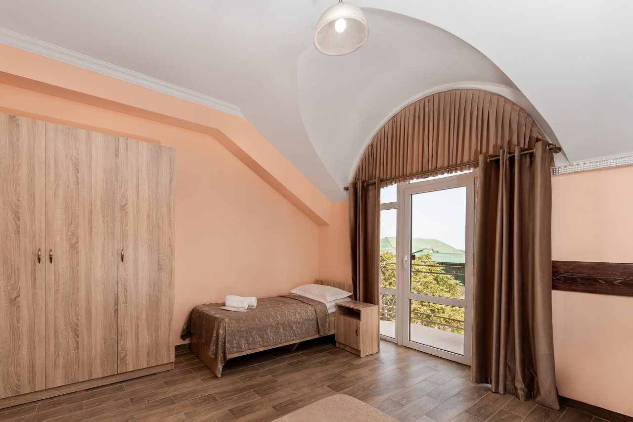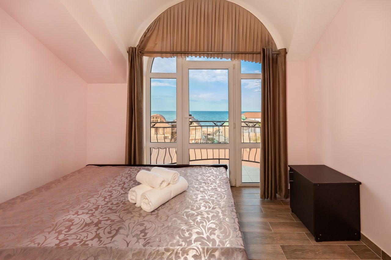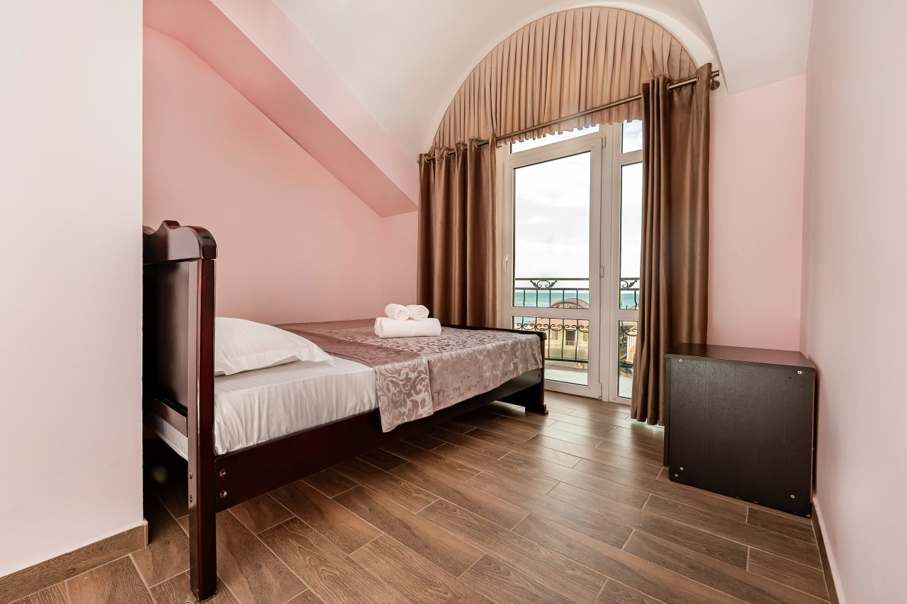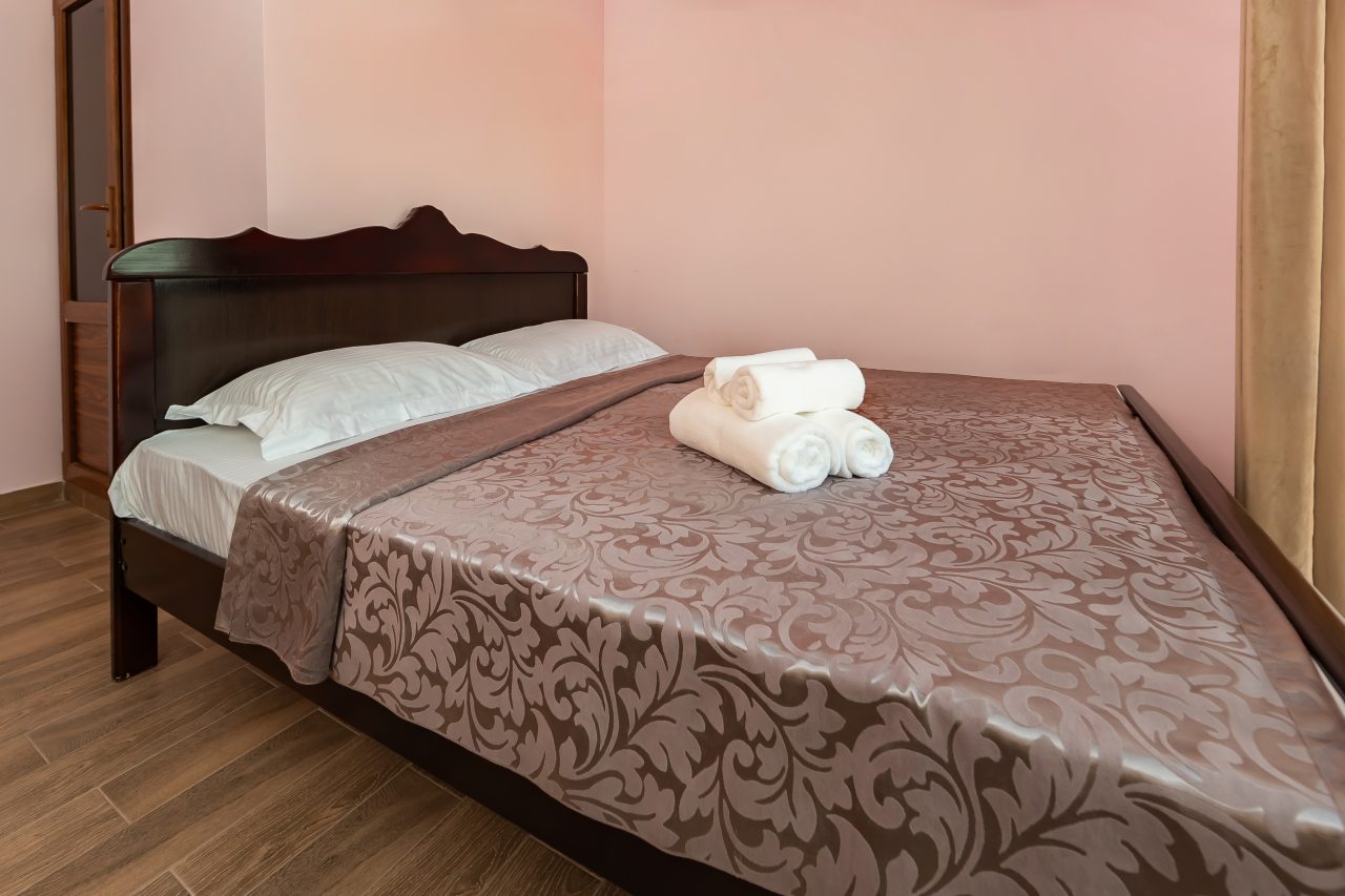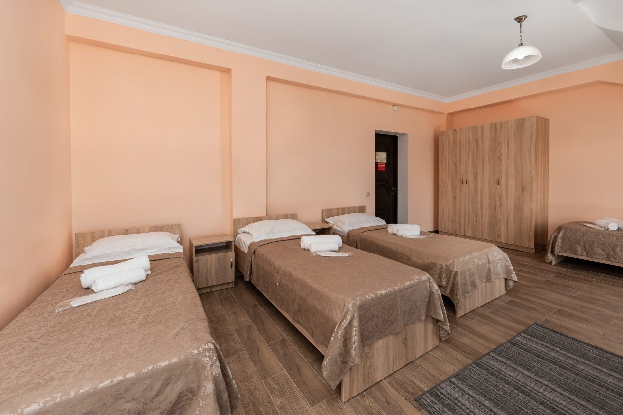 В этой гостинице мы оформляли бронь на двухместный стандартный номер. Общее впечатление у нас неплохое. Чистота здесь поддерживается, самый необходимый минимум присутствует, сплит-система работает. Санузел свой в номерах. Мы брали вариант с большой двуспальной кроватью. Неподалеку от гостиницы есть рестораны, парки. До пляжа от гостиницы минут 10-15, в зависимости от темпа шага.