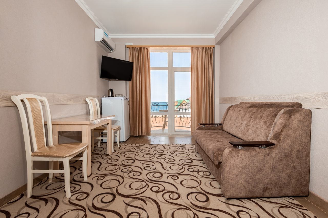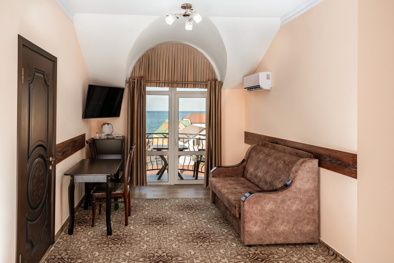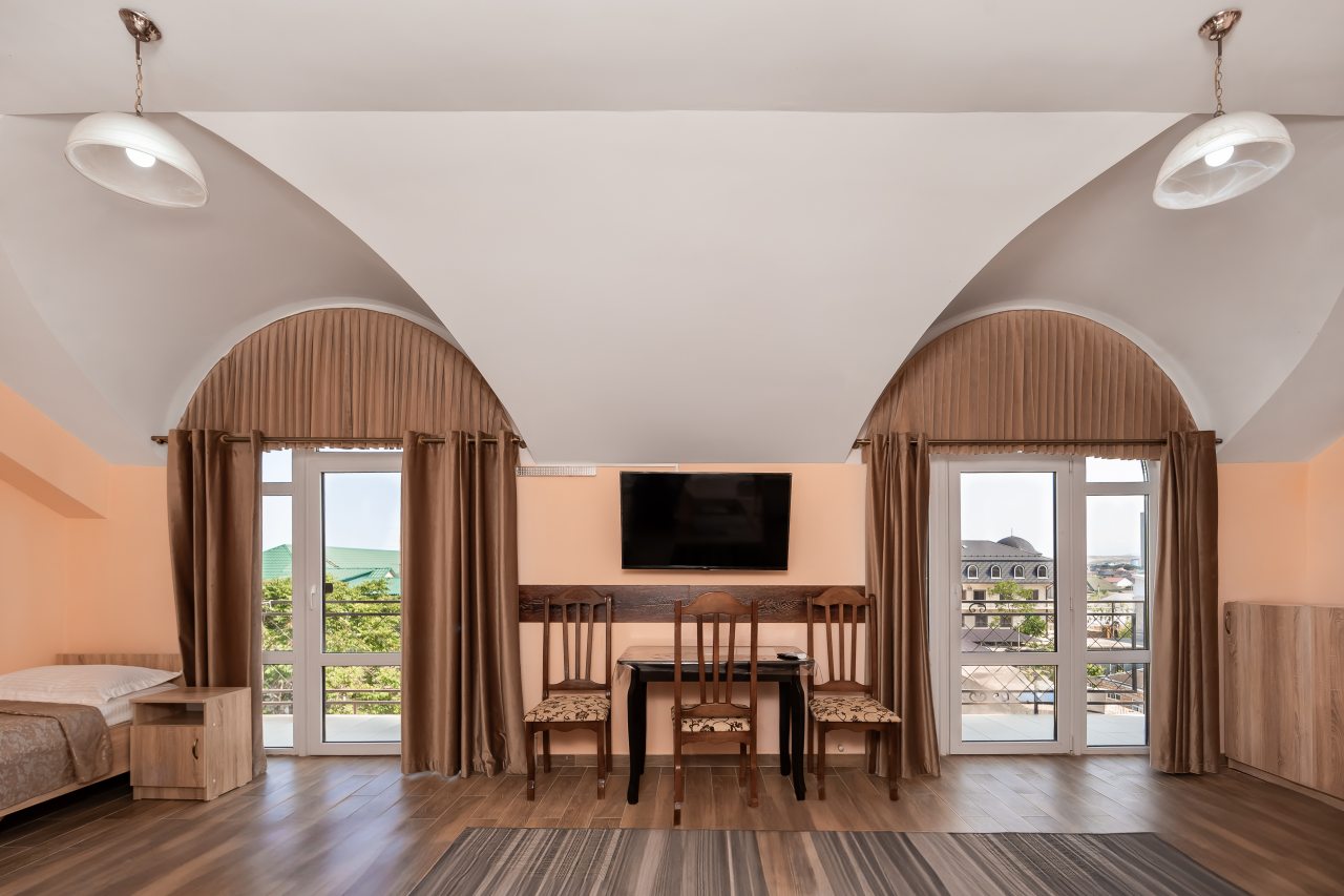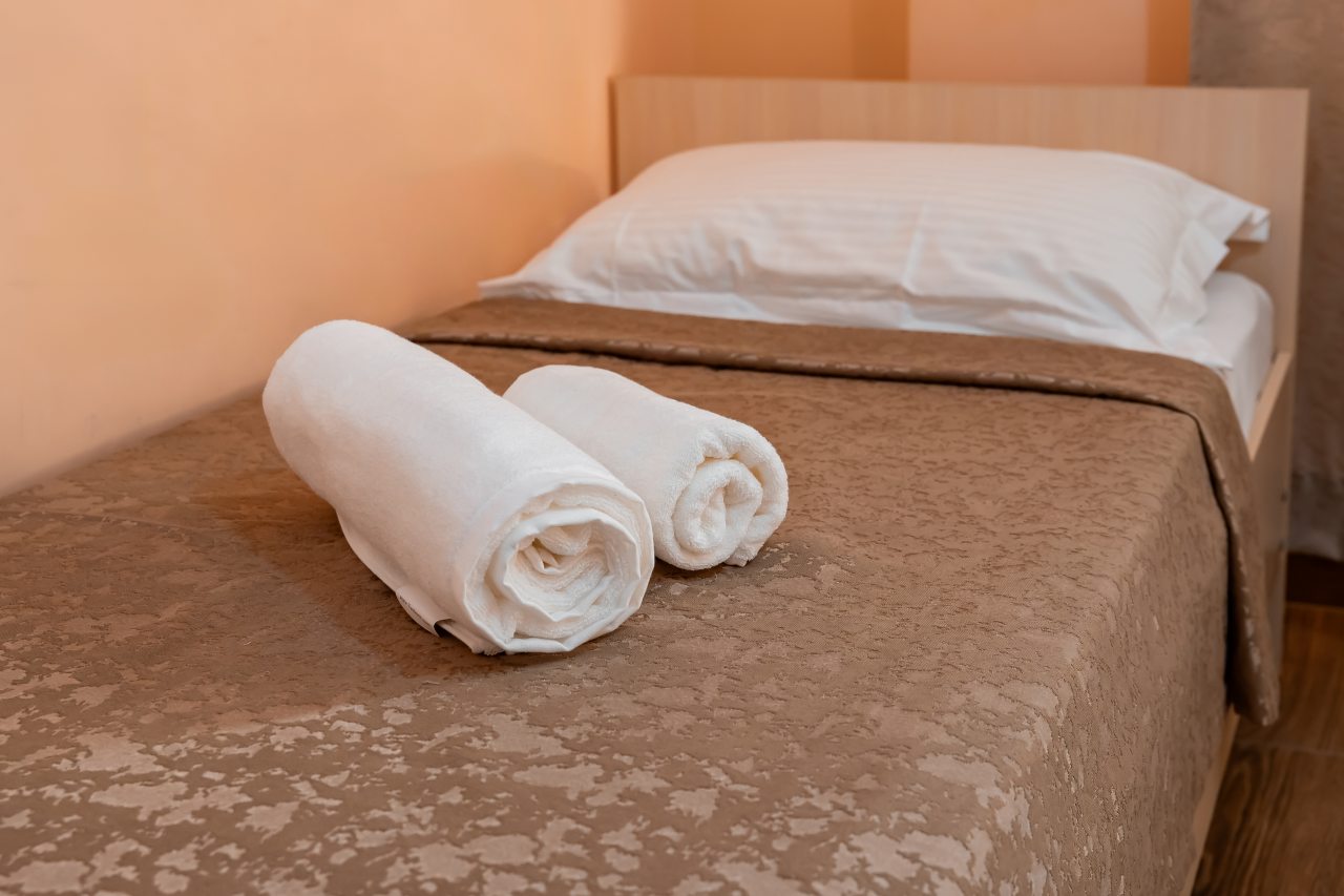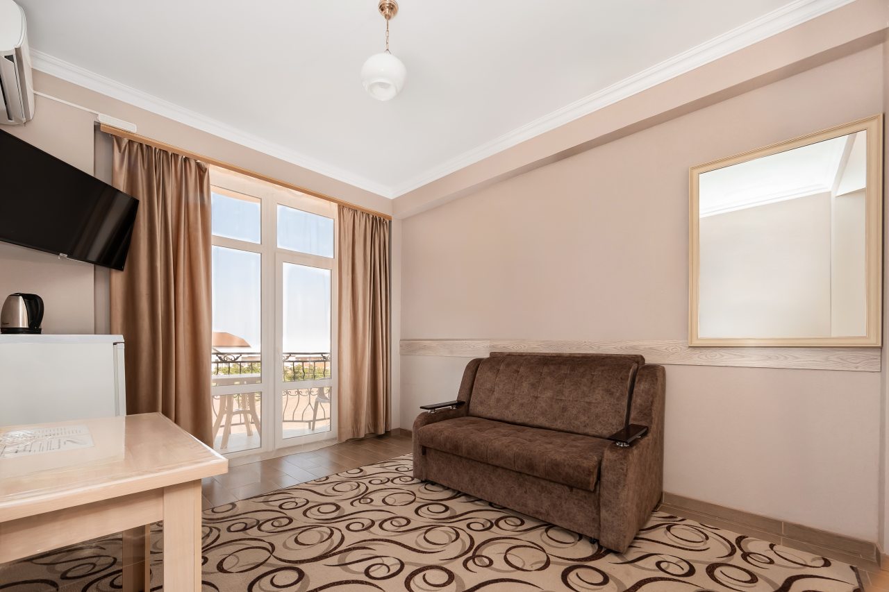 В этой гостинице мы оформляли бронь на двухместный стандартный номер. Общее впечатление у нас неплохое. Чистота здесь поддерживается, самый необходимый минимум присутствует, сплит-система работает. Санузел свой в номерах. Мы брали вариант с большой двуспальной кроватью. Неподалеку от гостиницы есть рестораны, парки. До пляжа от гостиницы минут 10-15, в зависимости от темпа шага.