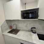 Кухня включает в себя всё необходимое для приготовления любимых напитков и блюд, в том числе индукционную плиту, чайник, СВЧ, холодильник, обеденный стол и стулья.