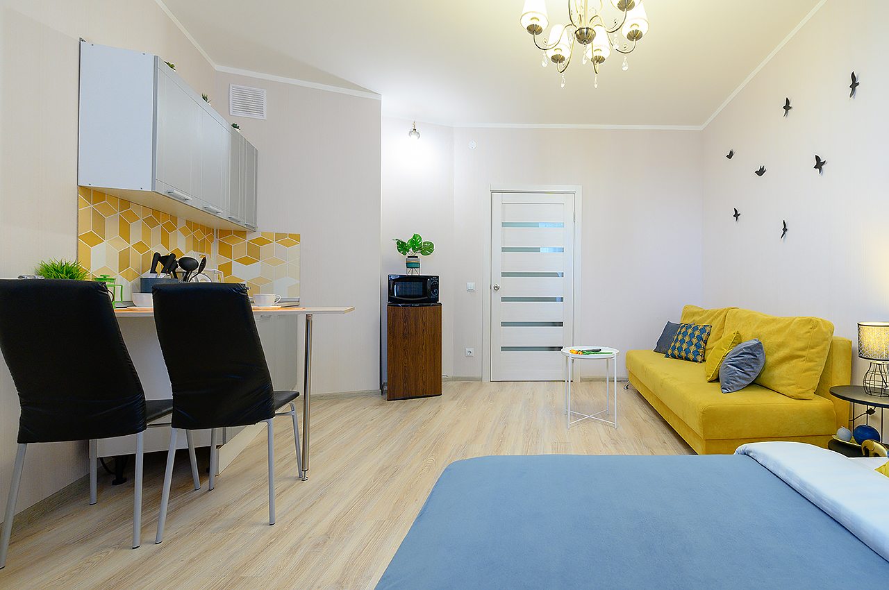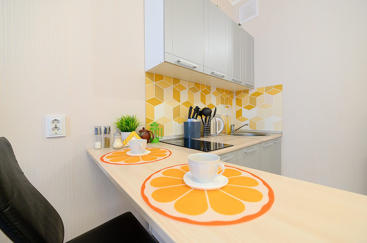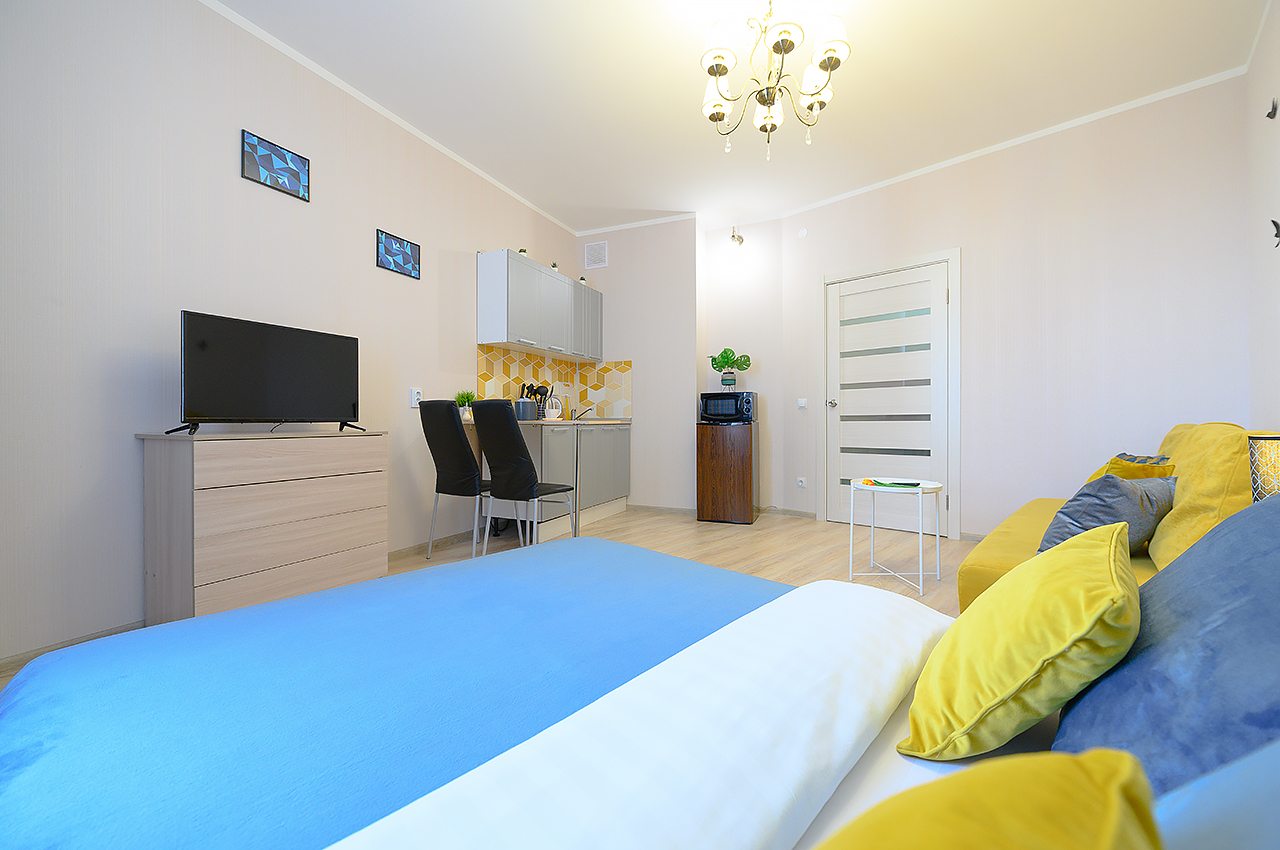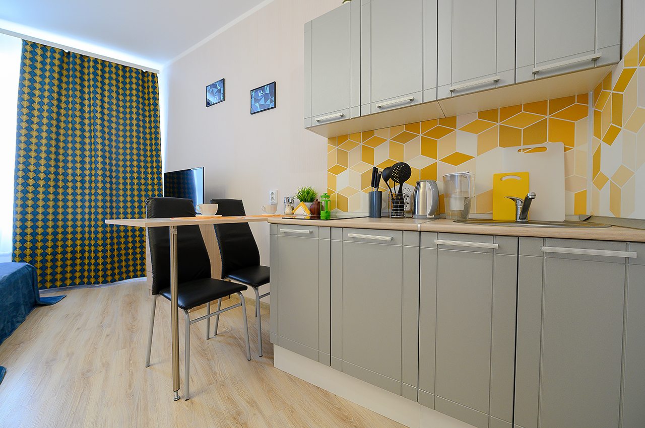 Яркий дизайн. Достаточное свободное пространство, качественная мебель. Особых претензий не возникло, хорошо все прошло, жил здесь три дня, мне понравилось. Всем моим пожеланиям данный вариант соответствовал, необременительное максимально простое бронирование. Хорошая кухонная зона.