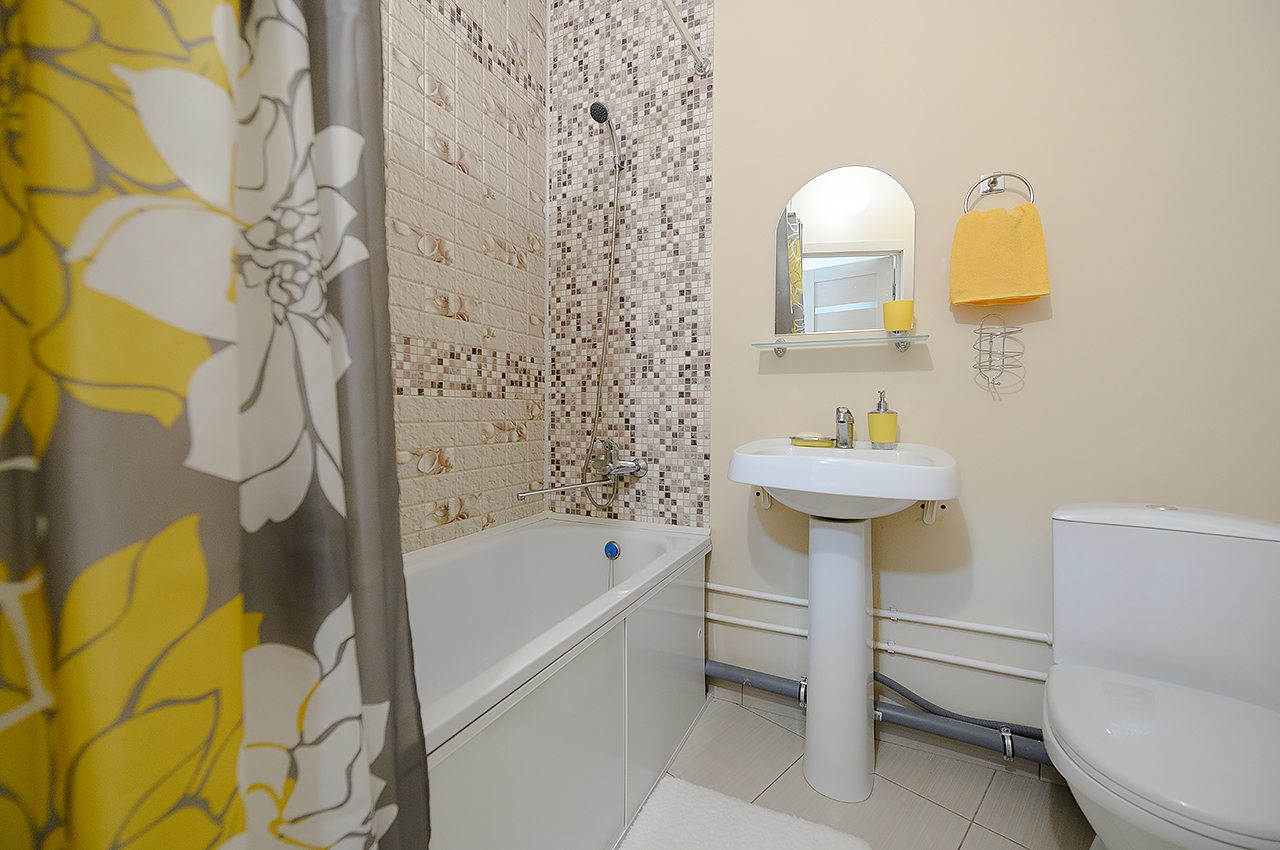 Апартаменты на Советской мы забронировали заблаговременно. Квартира хорошая, чистенькая, с необходимой мебелью. Совсем рядом находятся магазины, стадион. В ванной комнате обстановка поскромнее, чем в самой квартире. Кухонная зона находится прямо в жилом пространстве, но от этого было только удобнее.