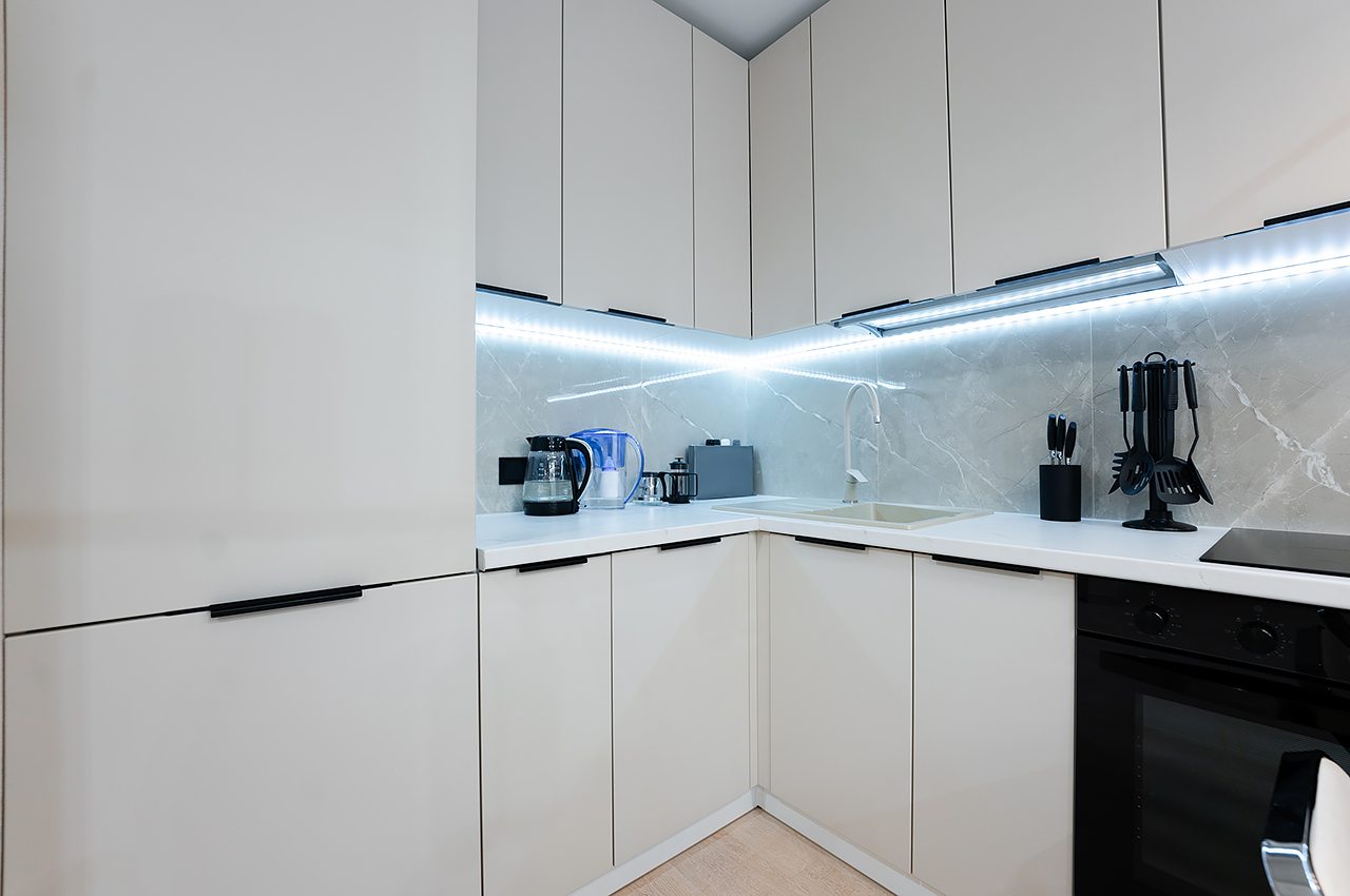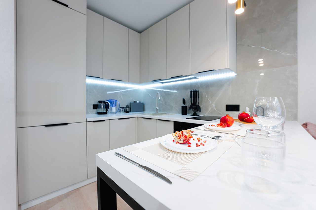 Кухня оснащена бытовой техникой, посудой и обеденной зоной. Рядом работает продуктовый магазин и различные заведения питания.