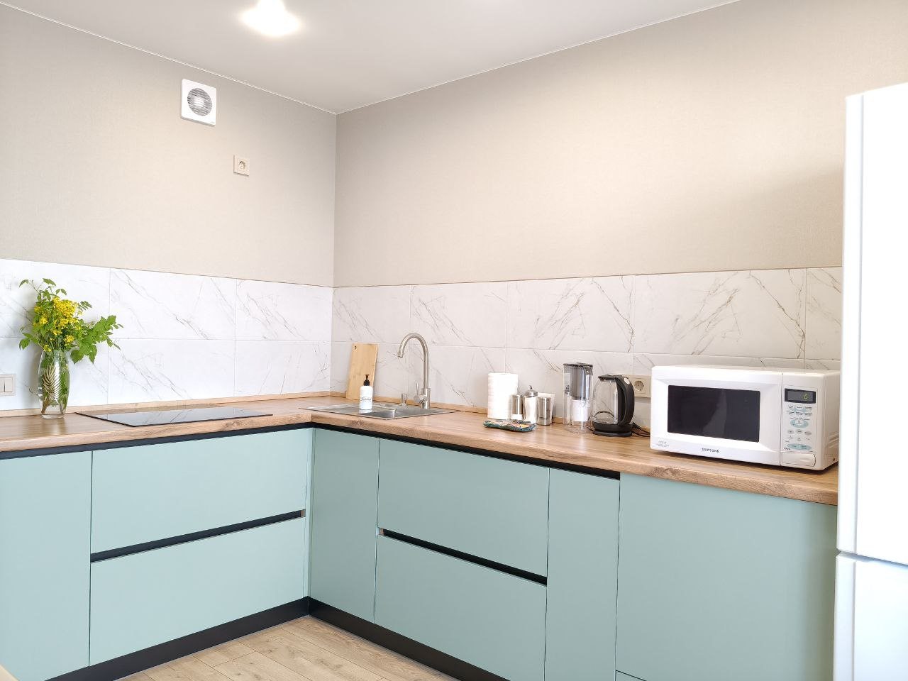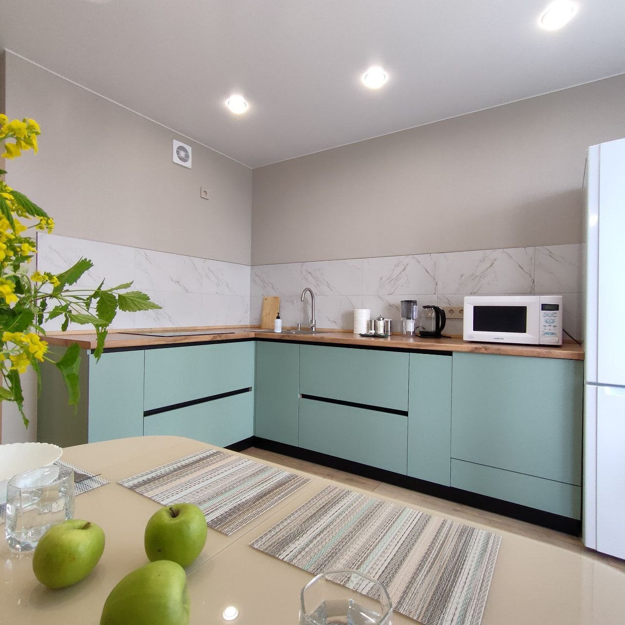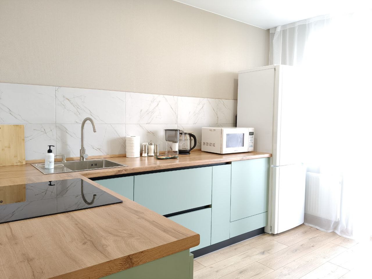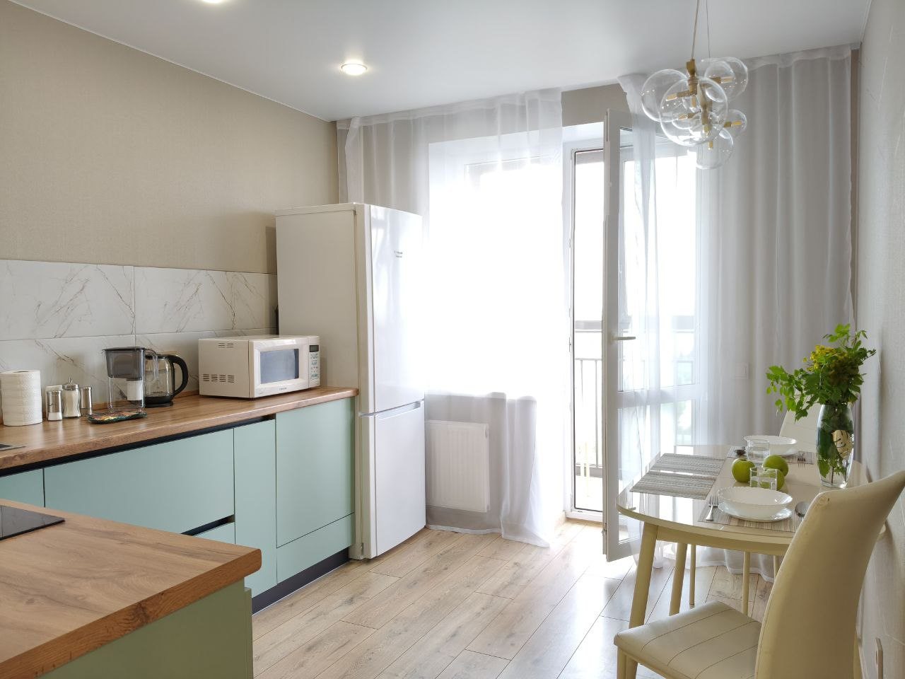 Светлая кухня будет отличным помощником для приготовления еды, там есть все самое нужное для этого: варочная панель, холодильник, набор посуды, электрический чайник. Для приема пищи имеется обеденный стол. На кухне — выход на лоджию, откуда открывается живописный вид на Ижевск. Также в соседнем доме имеется магазин «Пятерочка».