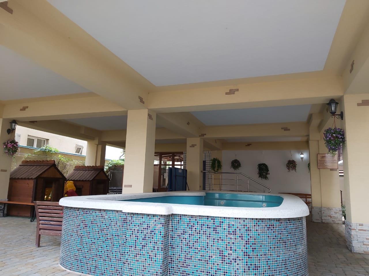 Отдыхали с супругой в Кабардинке, брали двуспальный номер в Династии. Понравились нам условия, кровать просторная с хорошими подушками. Вещи мы разместили в плотяном шкафу. В номере была своя уборная. За окнами удобные сушилки для одежды. На территории есть небольшой бассейн. Для глажки одежды условия созданы, но в коридоре.