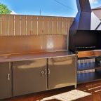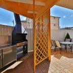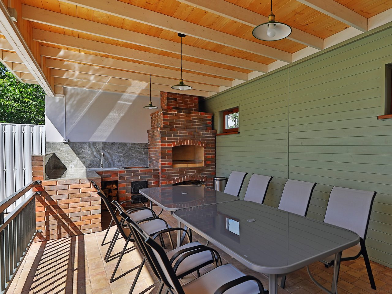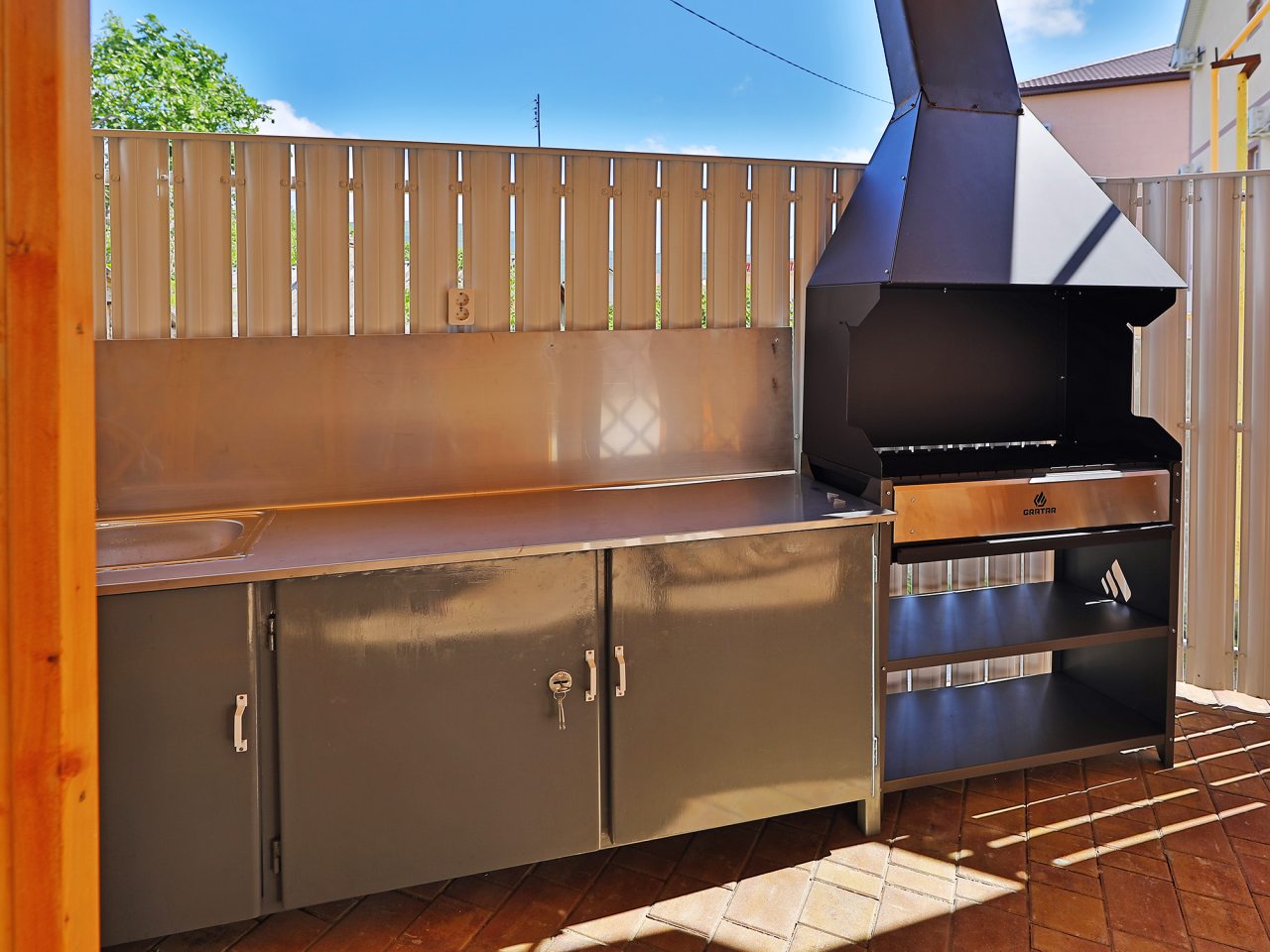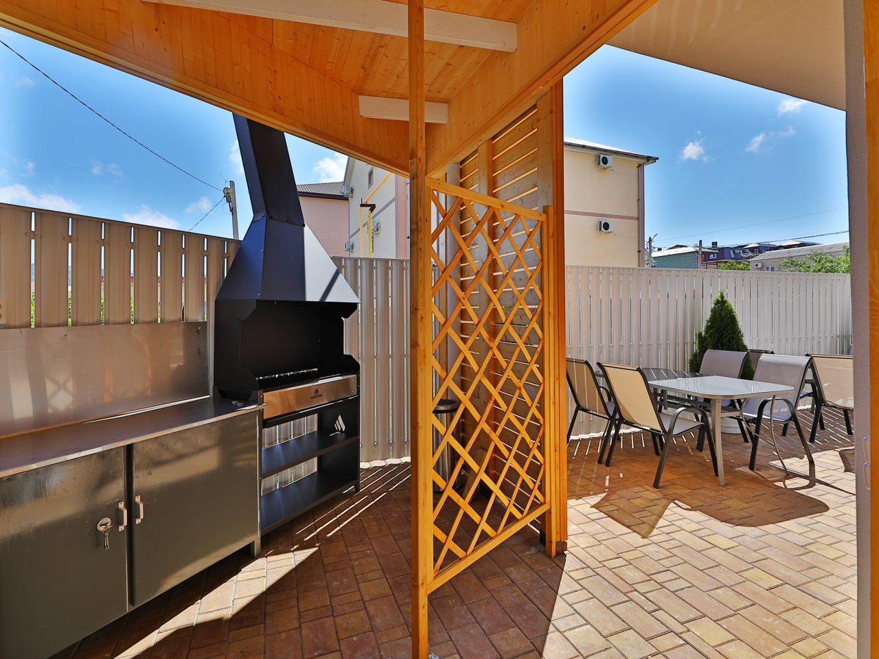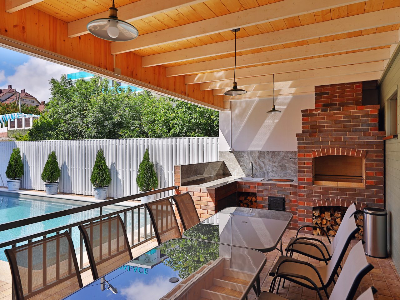 Общая кухня оборудована бытовой техникой и удобной обеденной зоной. Во внутреннем дворе дома предусмотрена мангальная зона и столики под навесом.