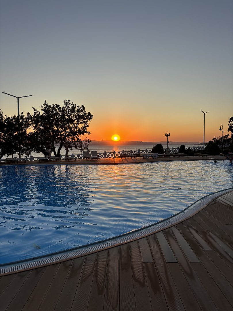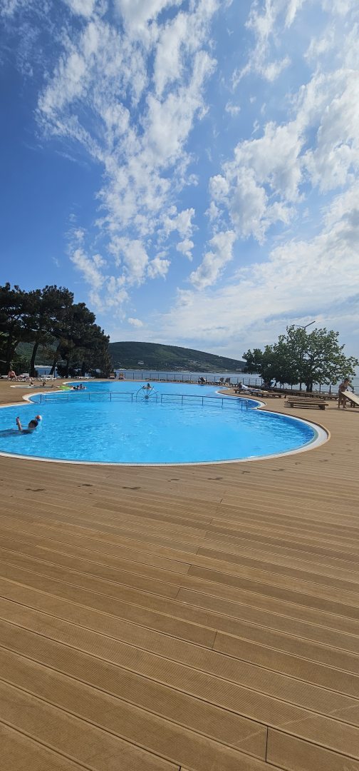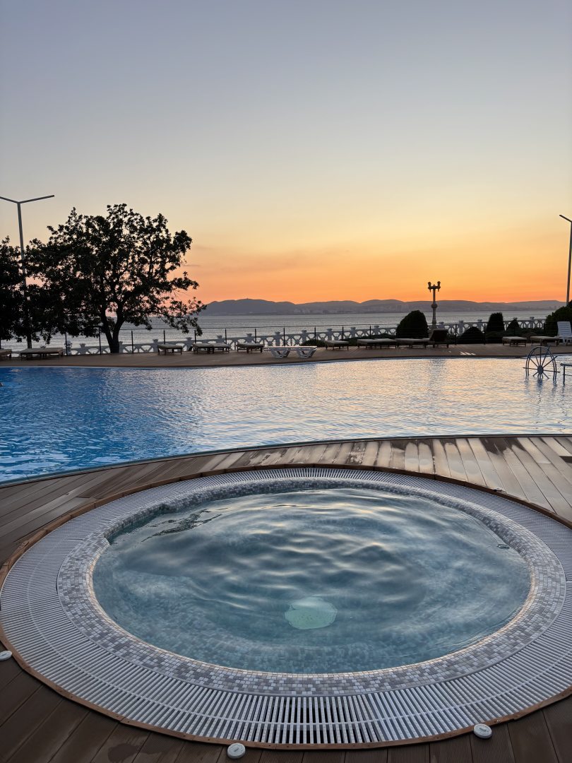 Пансионат просто супер. Огромная территория прямо на берегу, свой пляж с чистейшей водой, огромный теплый бассейн с джакузи. Нет проблем с шезлонгами - есть свободные всегда. Отель недавно после реставрации, территория очень ухоженная. Питание брали завтраки - очень достойное. Всего даже не попробовали. На территории несколько кафешек с пивом и снеками с пиццей. Цены вполне адекватные. С удовольствием приедем еще.