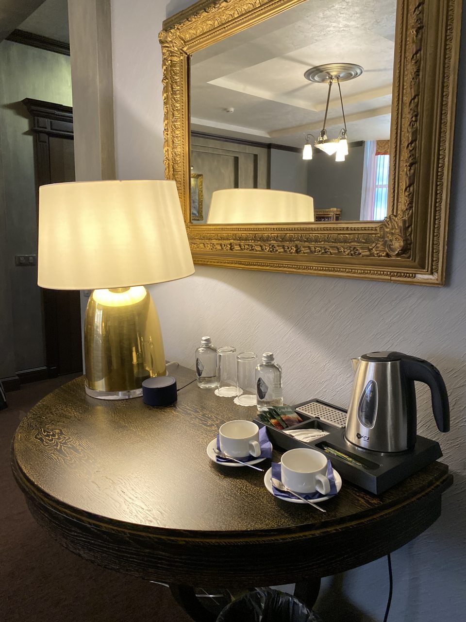 Расположение отеля, питание, обслуживание и уборка на высшем уровне, В номере есть чайник, чашки, сахар, чай, кофе, бутылочки с водой, Есть стол, на котором можно попить чай. Стул, почему-то один, но по просьбе предоставили второй. В ванной комнате предоставляются по три полотенца, фен, мыло, шампунь, гель, Уборка номера проводилась ежедневно, всё регулярно пополнялось, и чайные принадлежности и мыльные. Шведский стол превосходный, на любой вкус, даже шампанское можно попробовать с утра, Проживать было комфортно.
