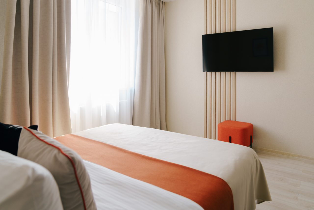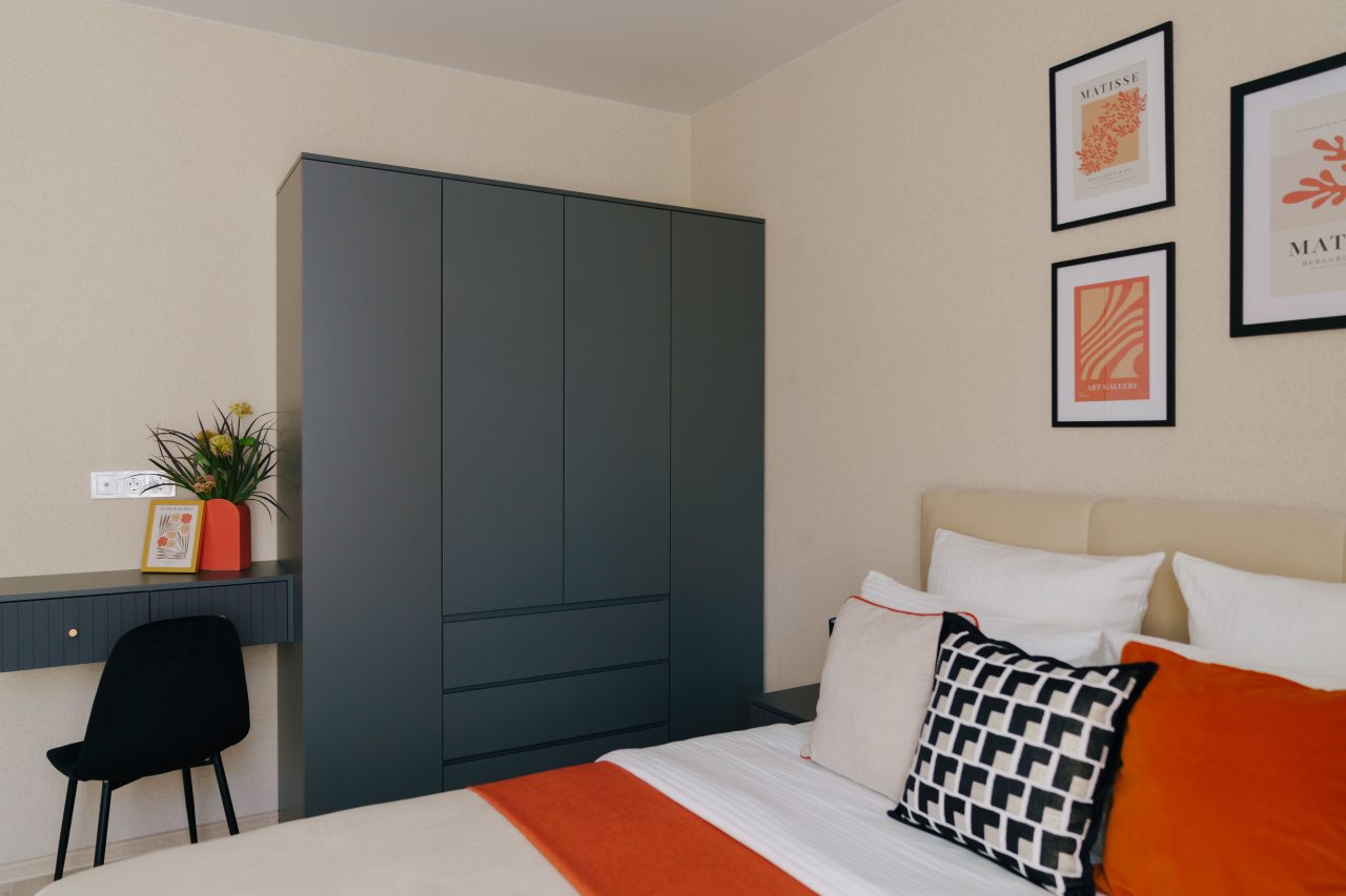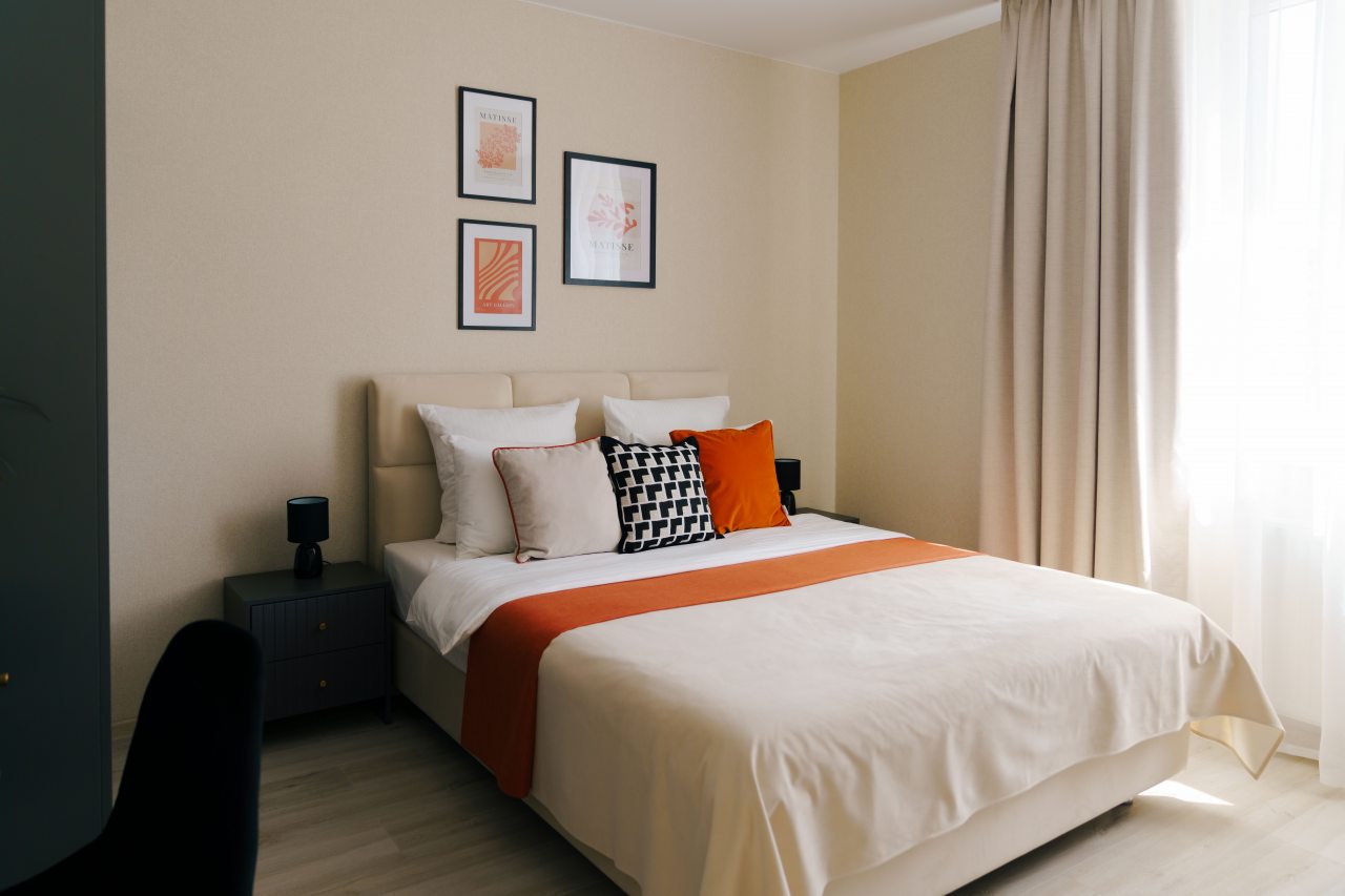 Комфортабельные апартаменты укомплектованы удобной двуспальной кроватью со свежим постельным бельем из 100% хлопка, прикроватной мебелью, шкафом, письменным столом, ЖК-телевизором и лоджией с уличной мебелью. Санузел оборудован современной сантехникой. Доступна точка высокоскоростного интернета.