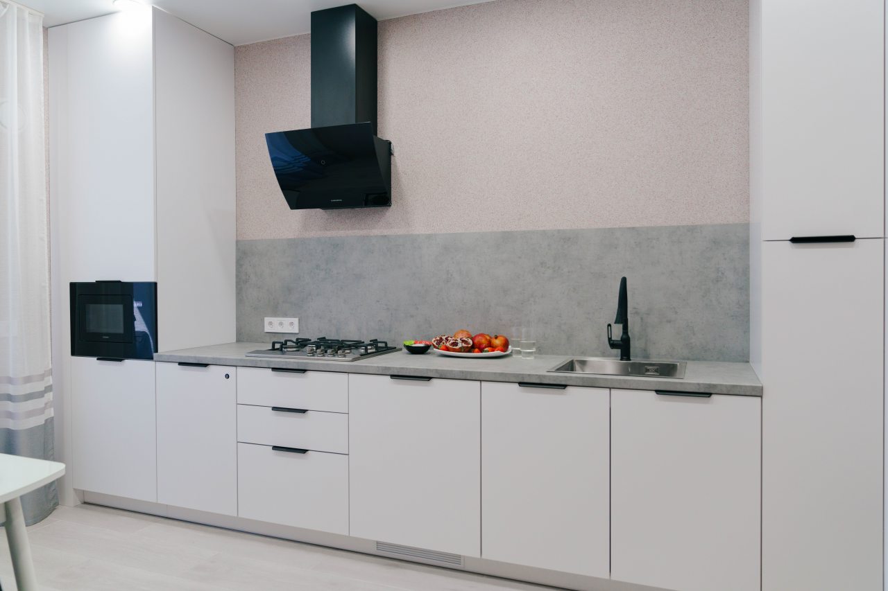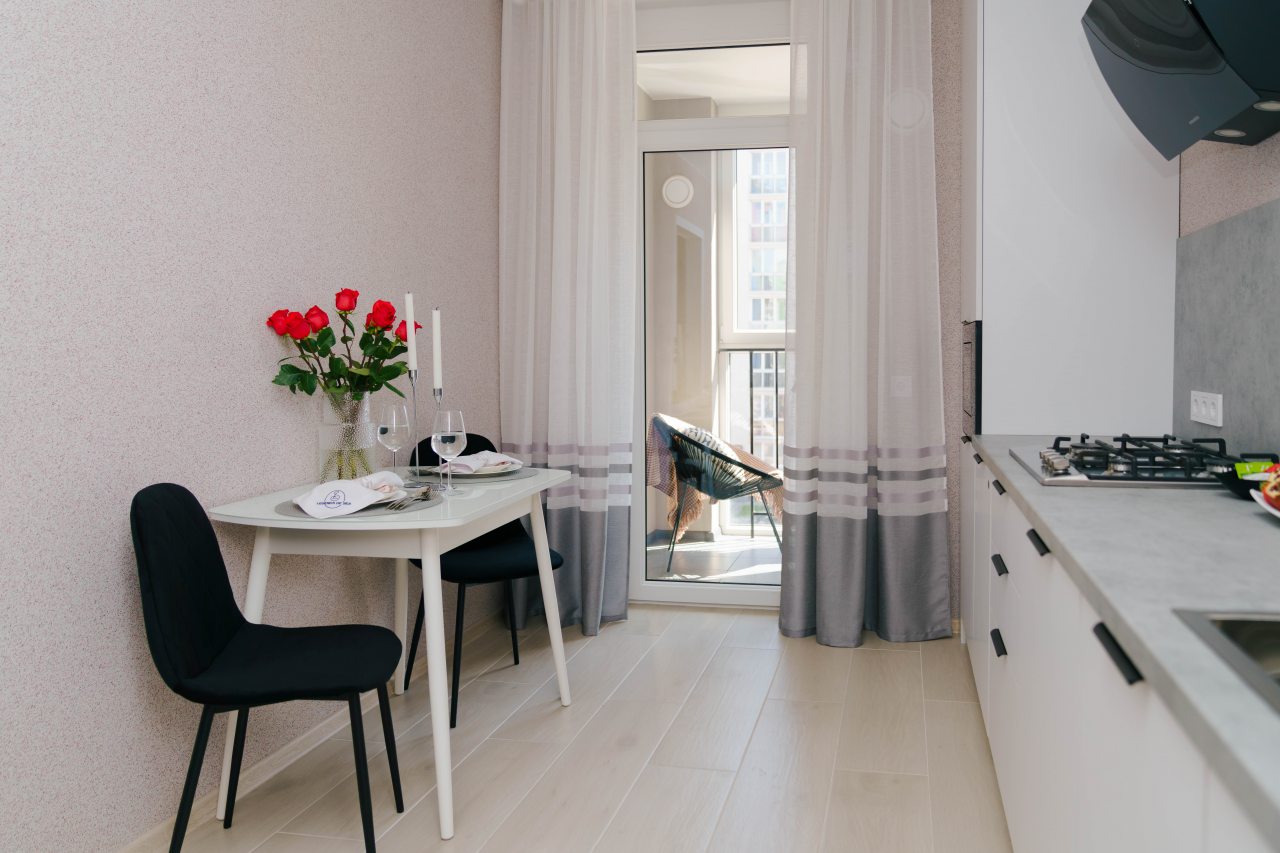 Кухня оснащена комплектом белоснежного гарнитура, газовой плитой, вытяжкой, электрочайником и набором посуды. В доступности большой выбор кафе на любой вкус.