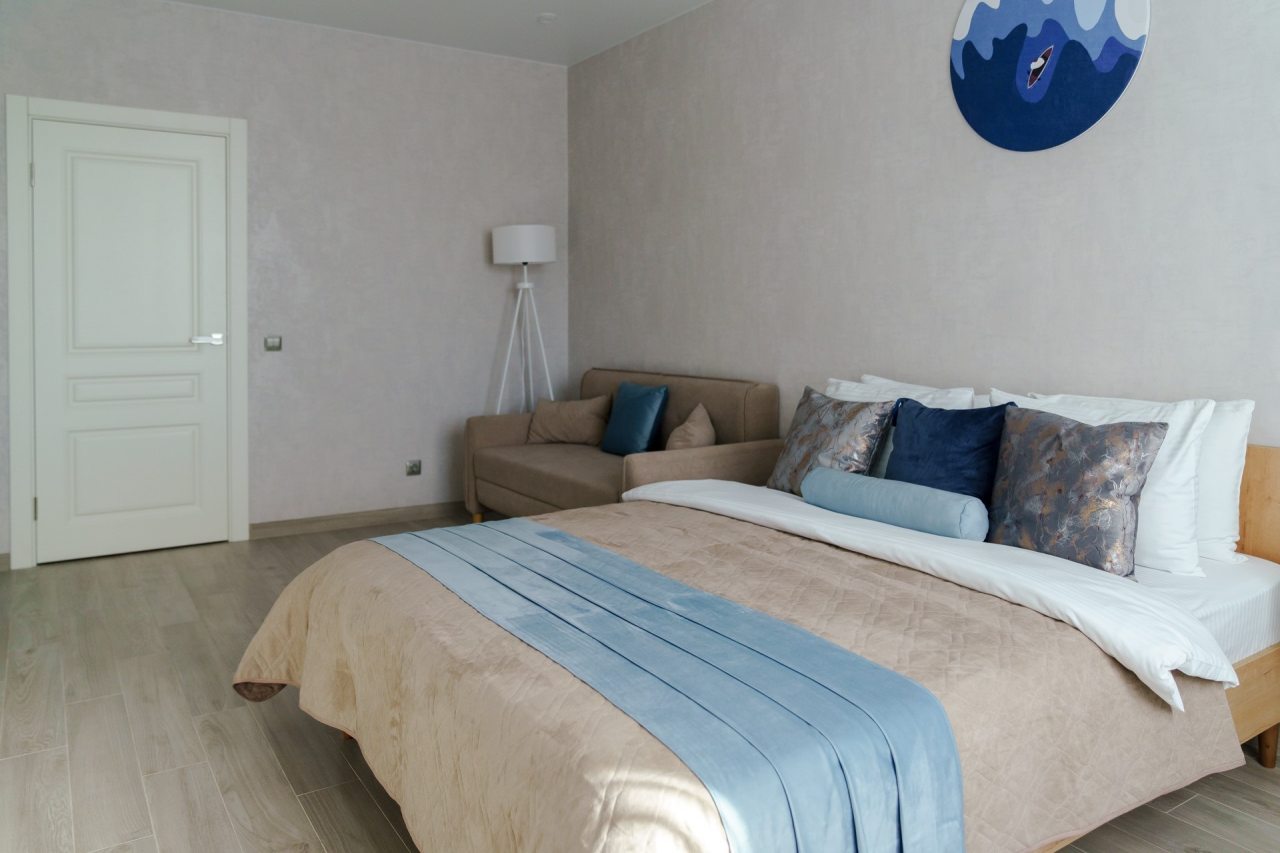 Для размещения гостям города предлагается отличная квартира, которая оборудована всем необходимым для прекрасного отдыха: двуспальной кроватью, свежим бельём, диваном, гладильными принадлежностями, Wi-Fi, ЖК-телевизором, шкафом для хранения вещей, зеркалом, туалетным столиком для удобных сборов, плотными шторами для качественного сна. Санузел оборудован необходимой сантехникой, набором полотенец, зеркалом, стиральной машиной, средствами личной гигиены.
