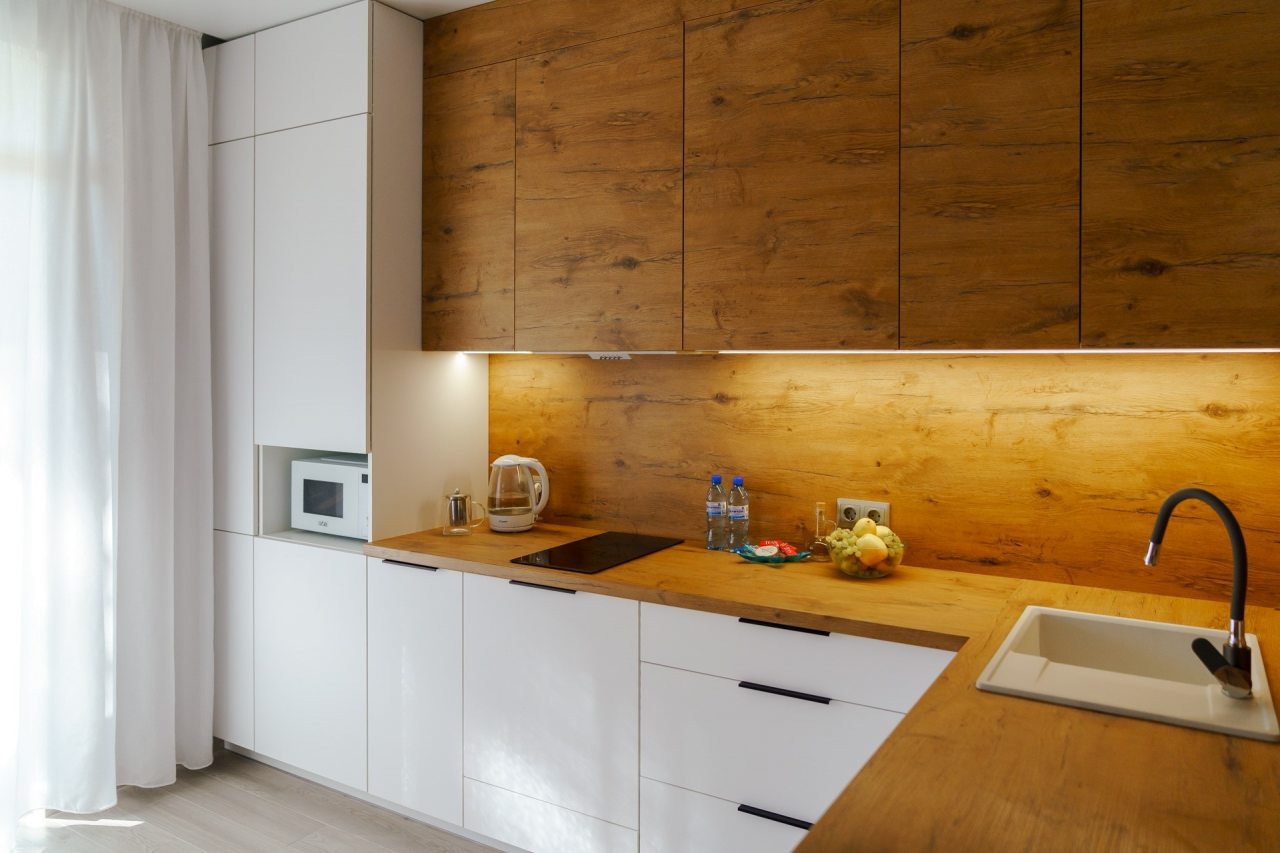 Кухня светлая, оснащена холодильником, СВЧ-печью, конфоркой, чайником, обеденным столом со стульями, приборами. Перекусит можно в кафе «Шеф-гриль».