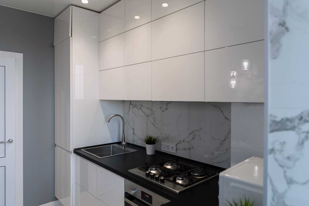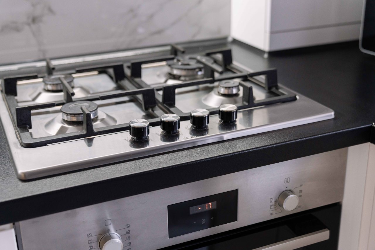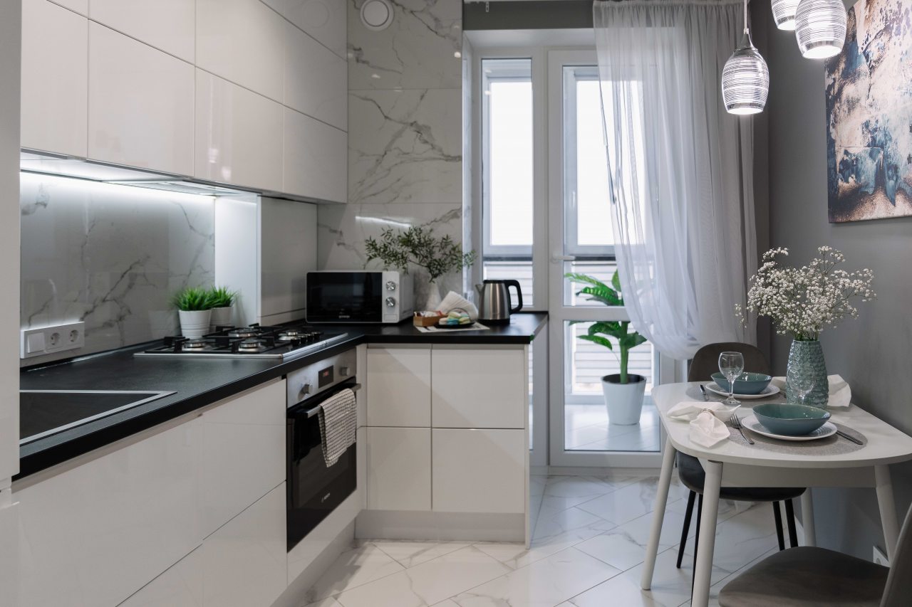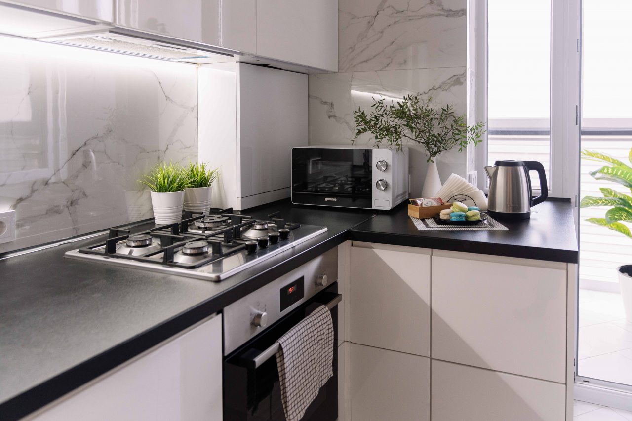 На кухне установлен обеденный стол и бытовая техника для организации питания: электрический чайник, микроволновая печь, газовая плита и духовой шкаф.