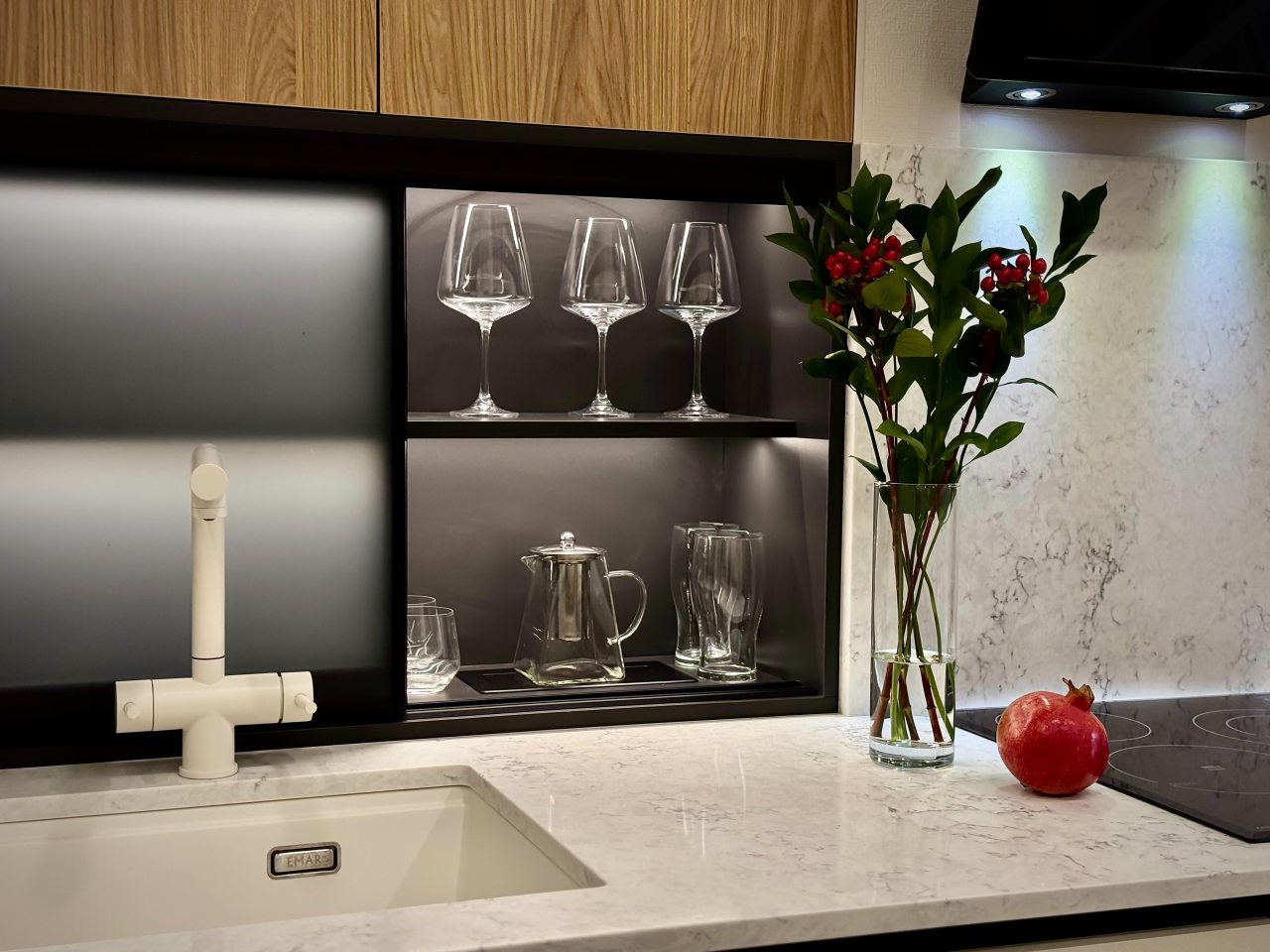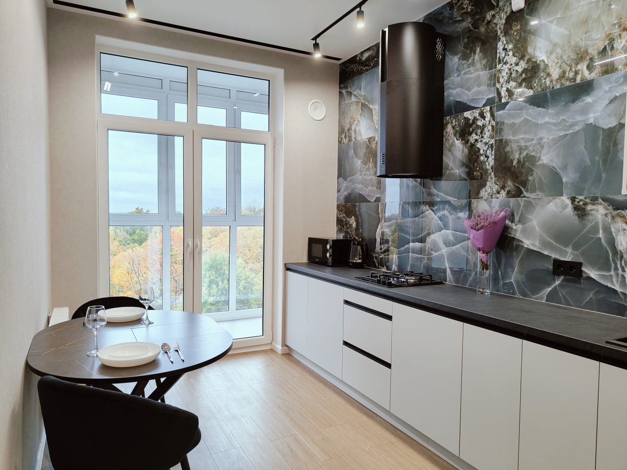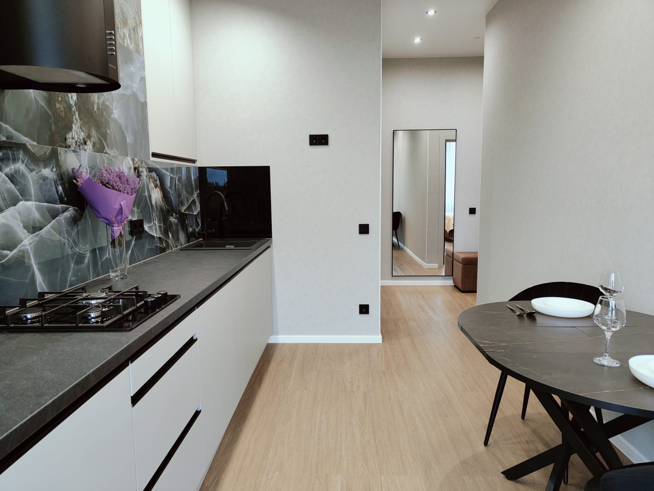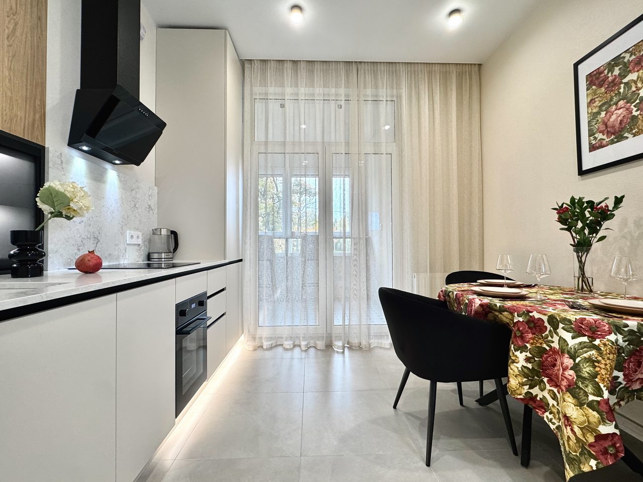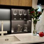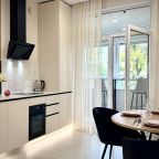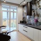 Стильная кухня укомплектована гарнитуром, варочной панелью, вытяжкой, электрочайником, духовым шкафом, холодильником. Пообедать можно в одном из ближайших кафе.