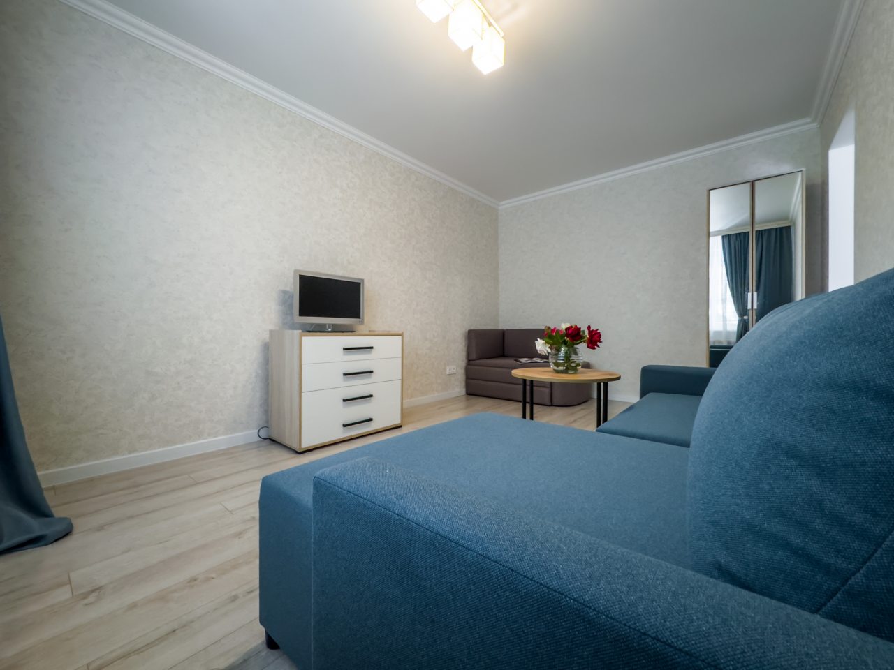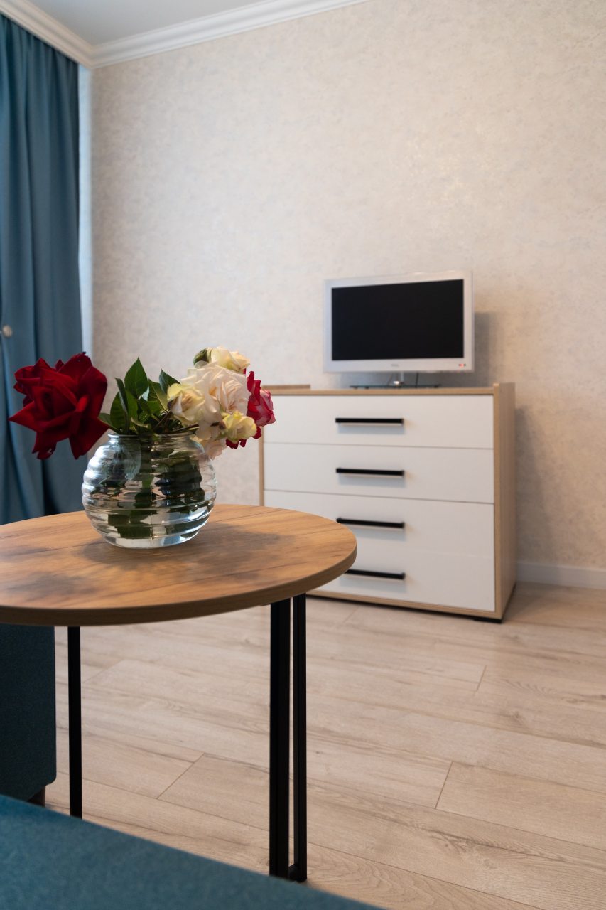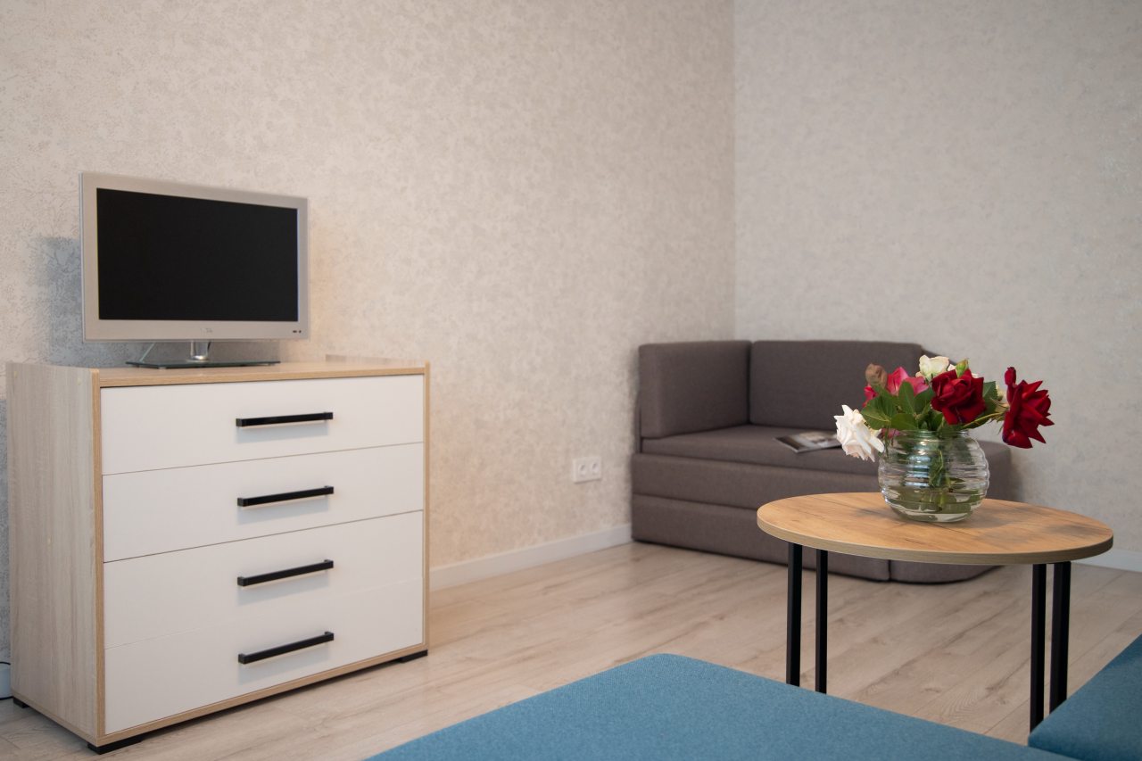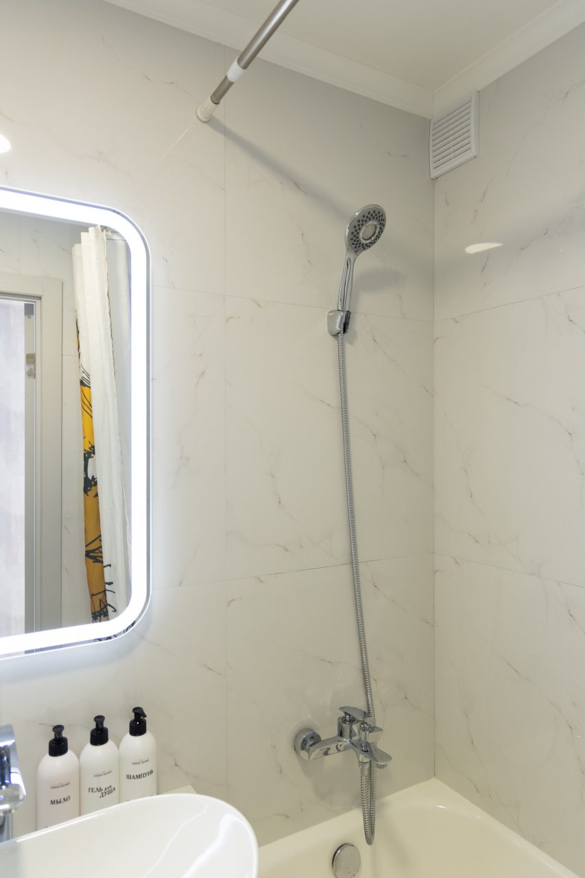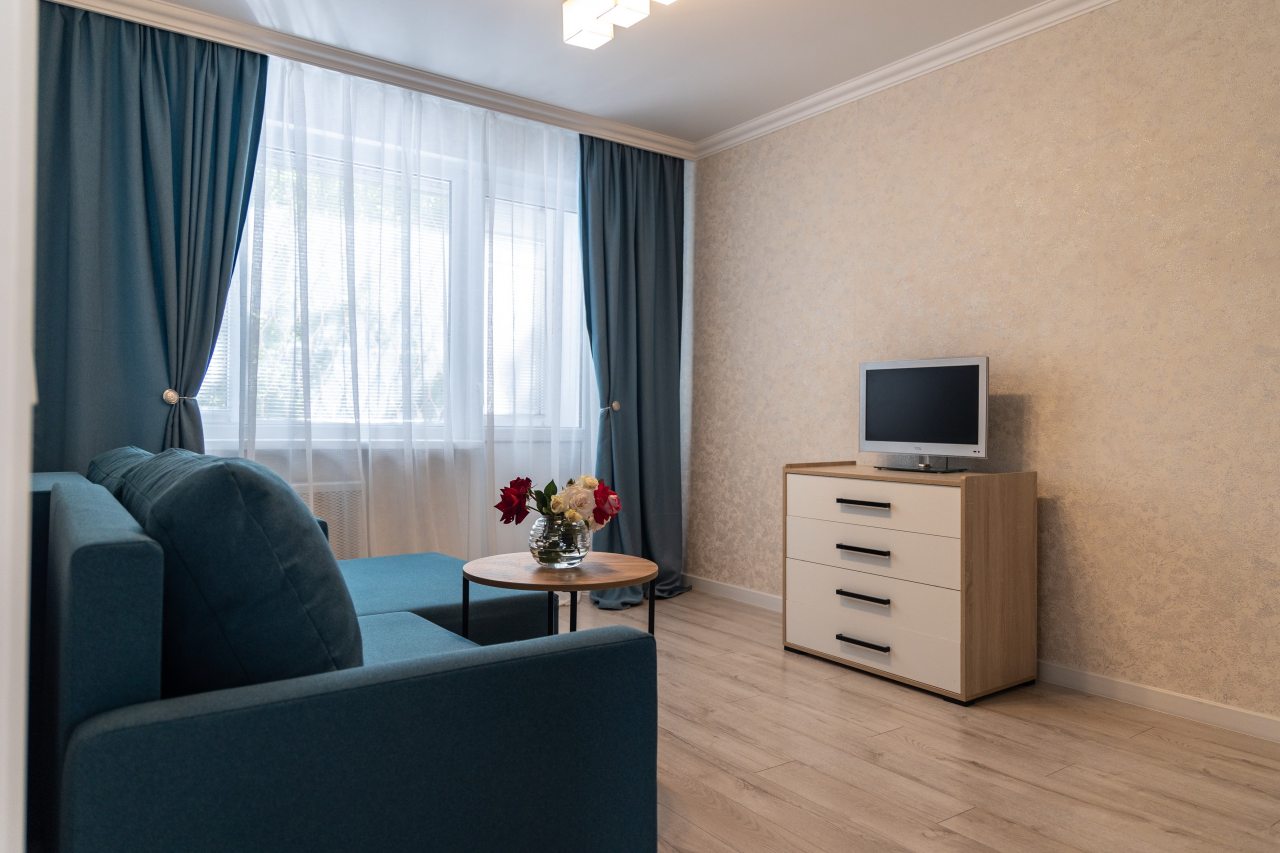Светлая квартира с современным ремонтом укомплектована удобными спальными местами, шкафом и комодом для хранения личных вещей, затемненными шторами, вешалками для верхней одежды, телевизором и собственной ванной комнатой. Санузел оборудован современной сантехникой, зеркалом с подсветкой и стиральной машиной.