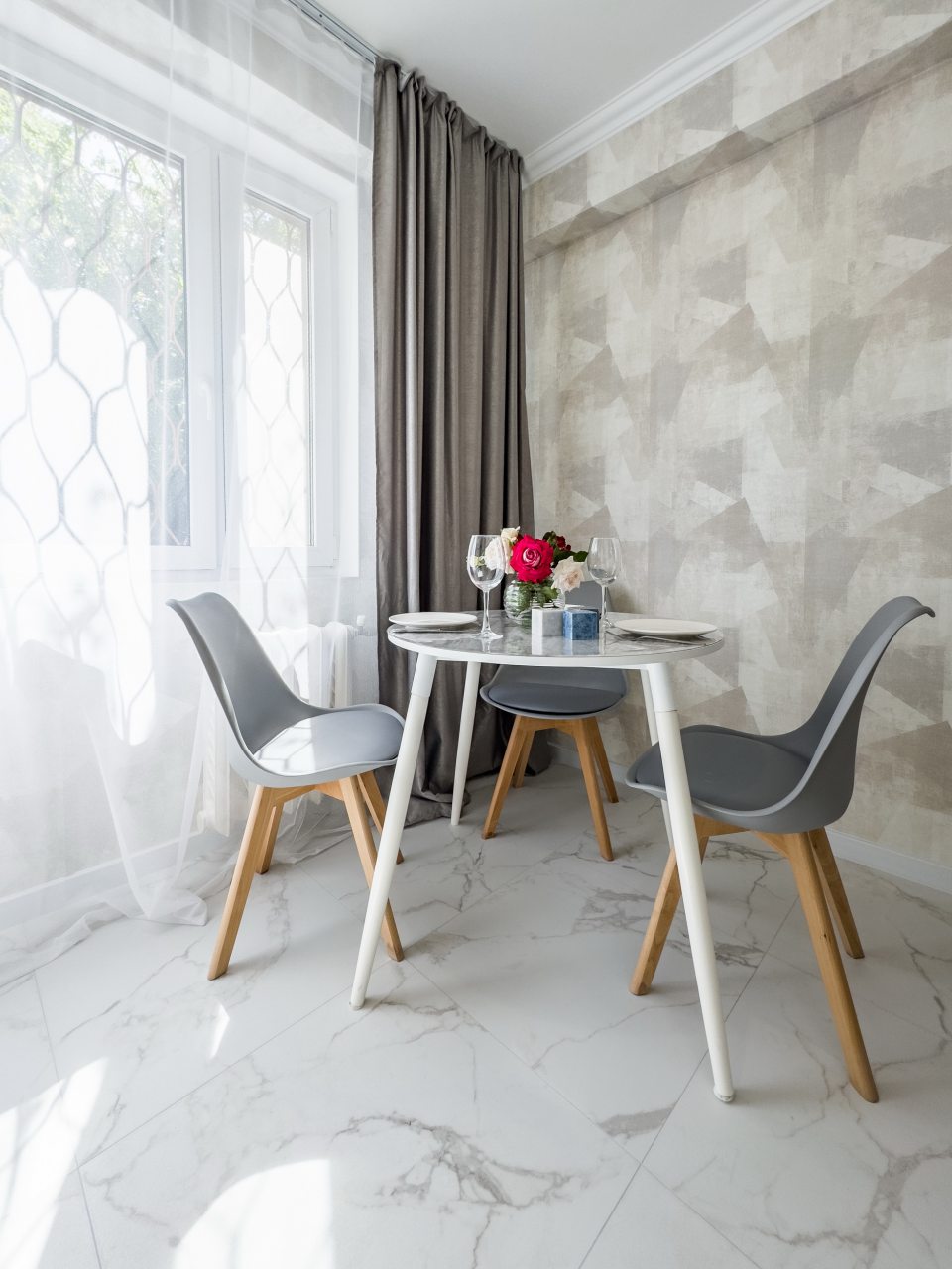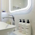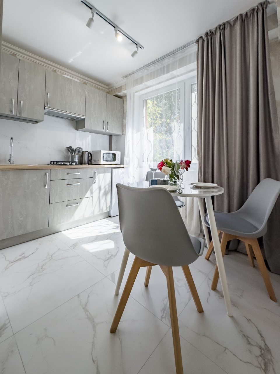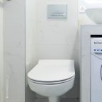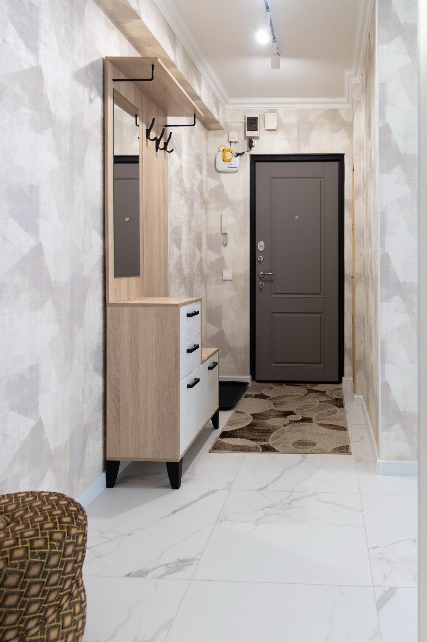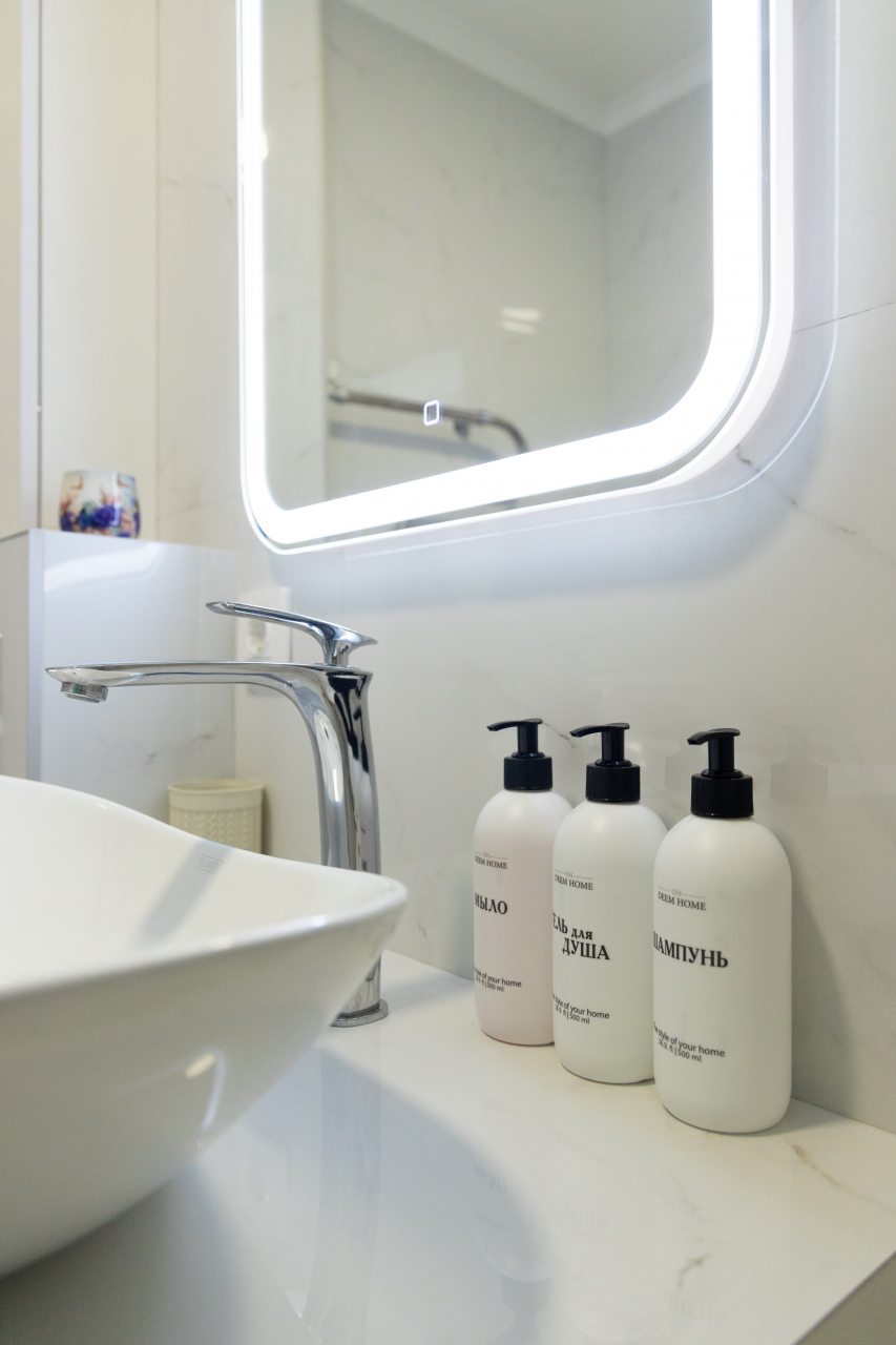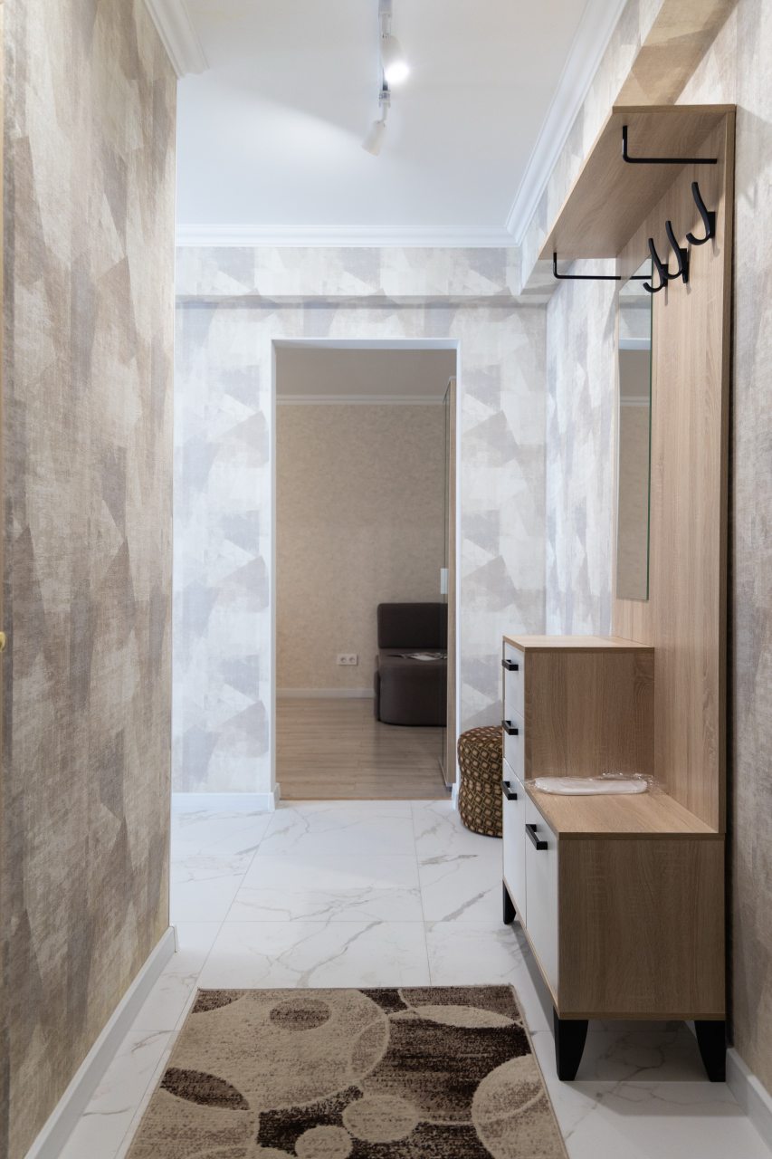 Светлая квартира с современным ремонтом укомплектована удобными спальными местами, шкафом и комодом для хранения личных вещей, затемненными шторами, вешалками для верхней одежды, телевизором и собственной ванной комнатой. Санузел оборудован современной сантехникой, зеркалом с подсветкой и стиральной машиной.