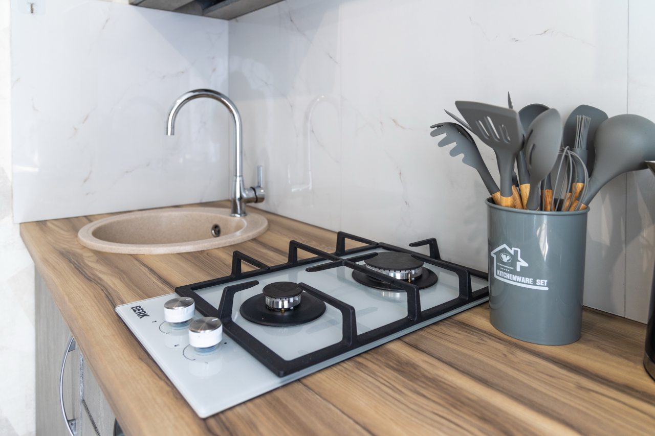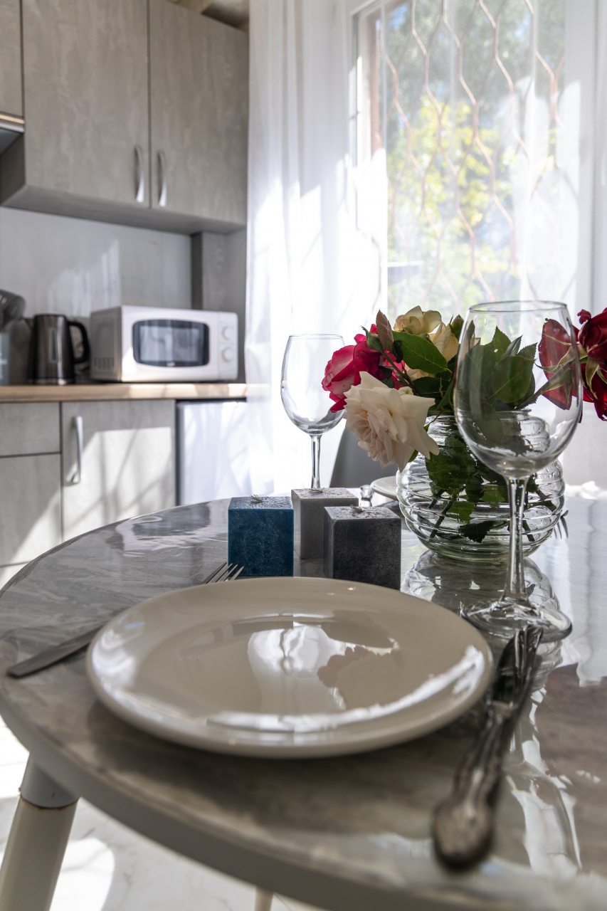 Кухня оснащена комплектом гарнитура, обеденным столом и бытовой техникой, например: холодильником, электрочайником, газовой плитой, микроволновой печью и др. Пообедать можно в одном из множества кафе неподалеку.