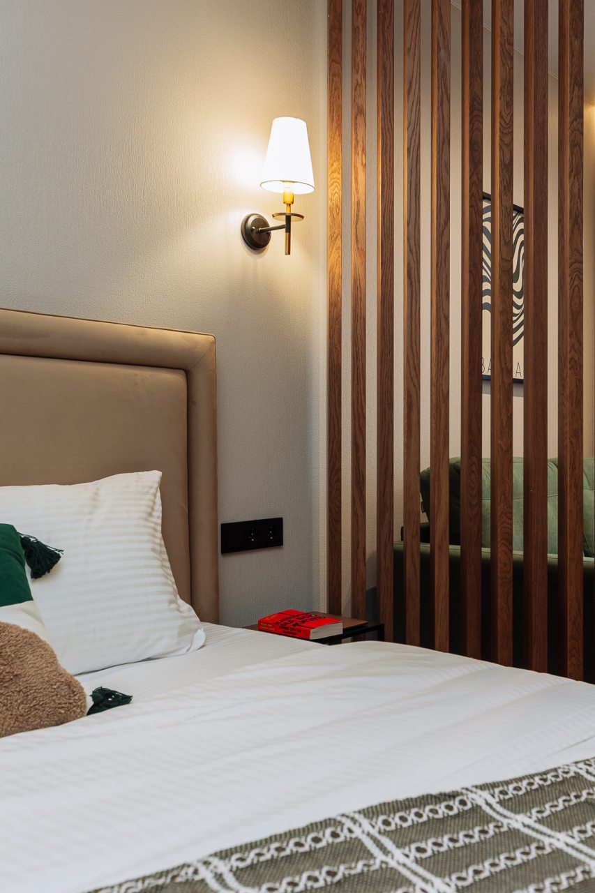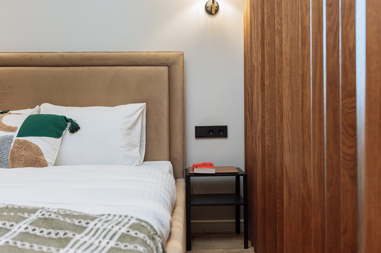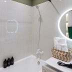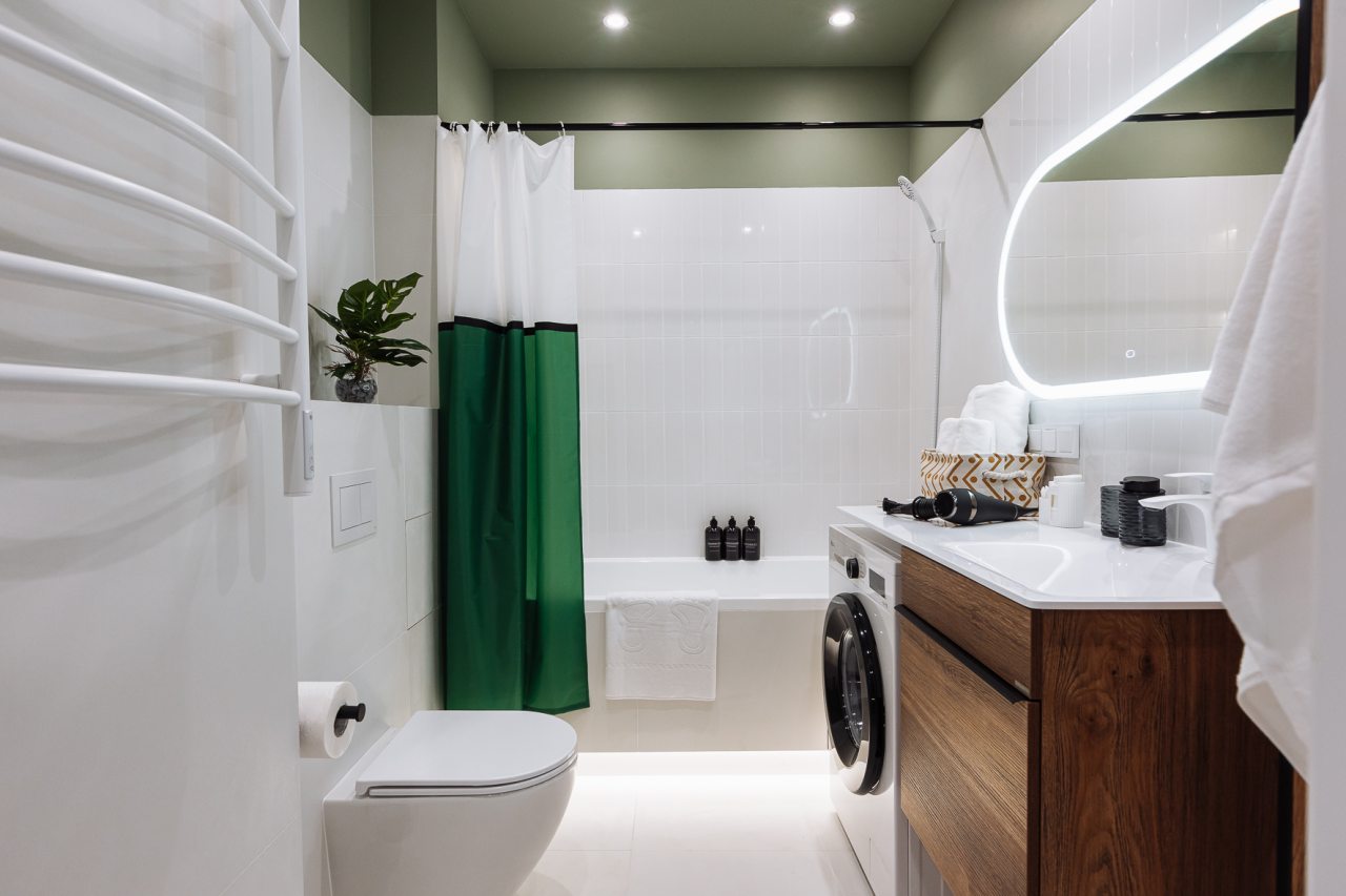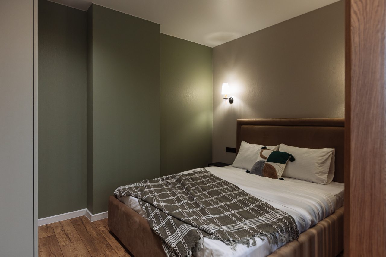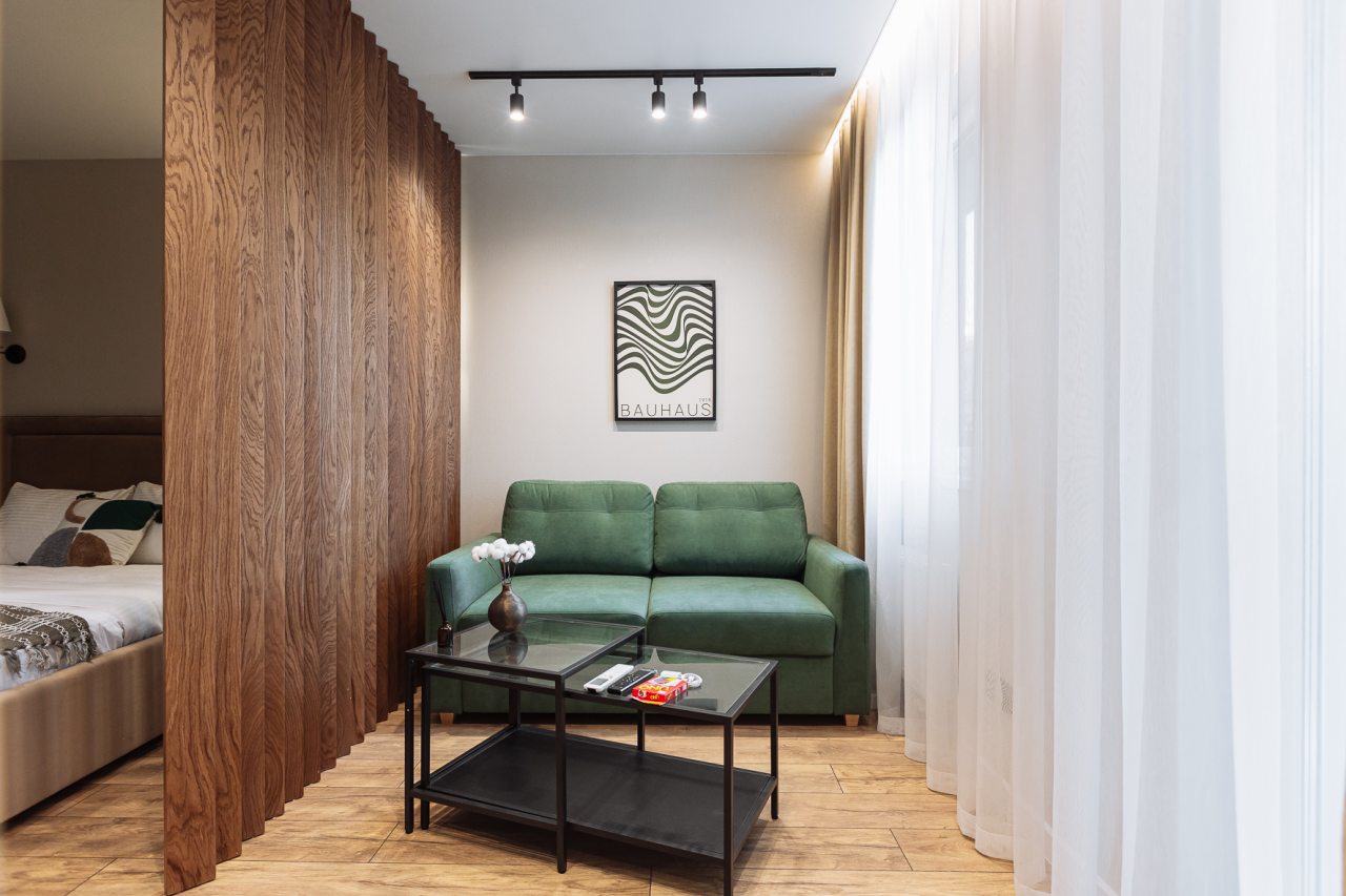 Стильные апартаменты с современным ремонтом укомплектованы удобными спальными местами, розетками возле кровати, кондиционером, телевизором с плоским экраном, шкафом, вешалками для верхней одежды и балконом с видом на внутренний двор. Санузел оборудован комплектом качественной сантехники, средствами личной гигиены, феном и стиральной машиной. Доступна точка высокоскоростного интернета.