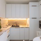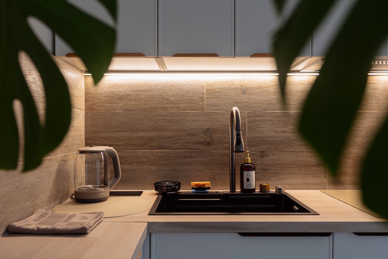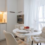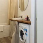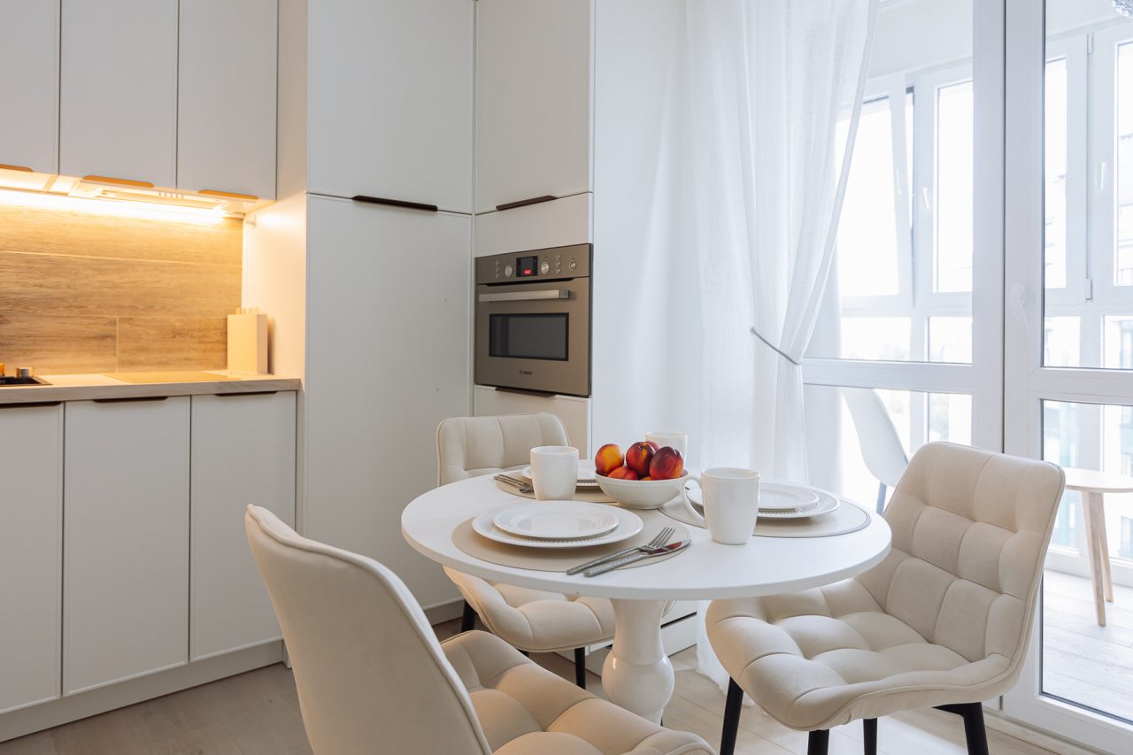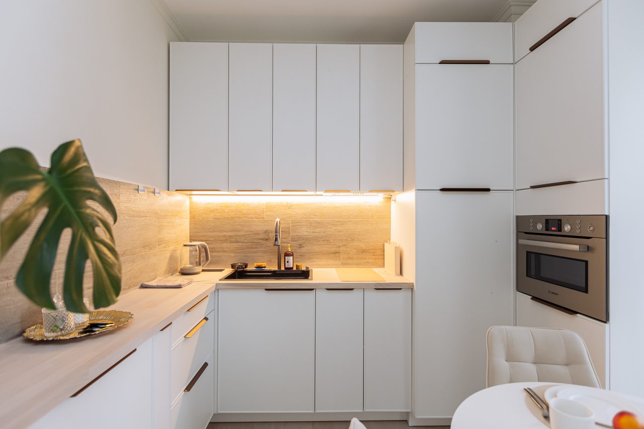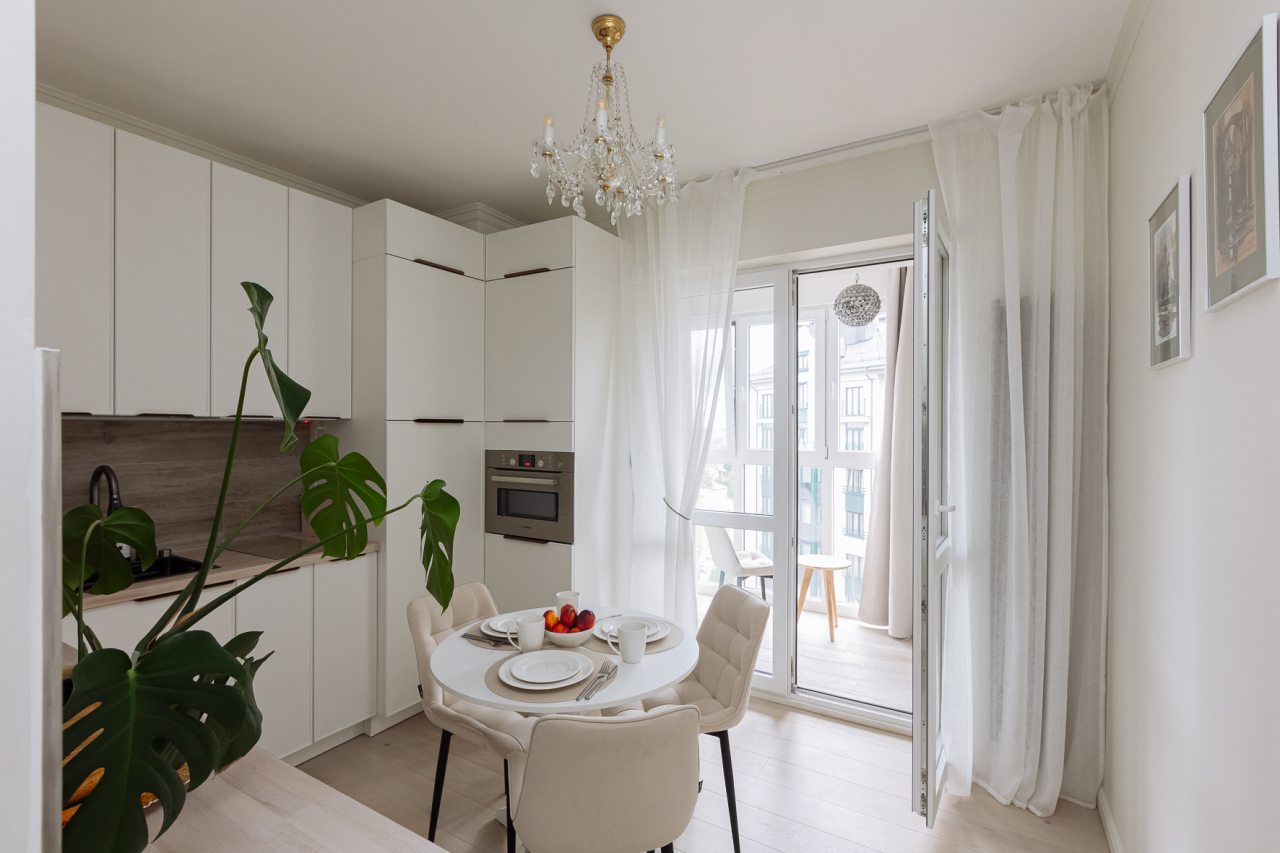 Светлая кухня оснащена: варочной панелью, электрочайником, духовым шкафом и посудой. Неподалеку имеются различные заведения питания, где можно перекусить: пекарня, кафе, кондитерская.