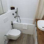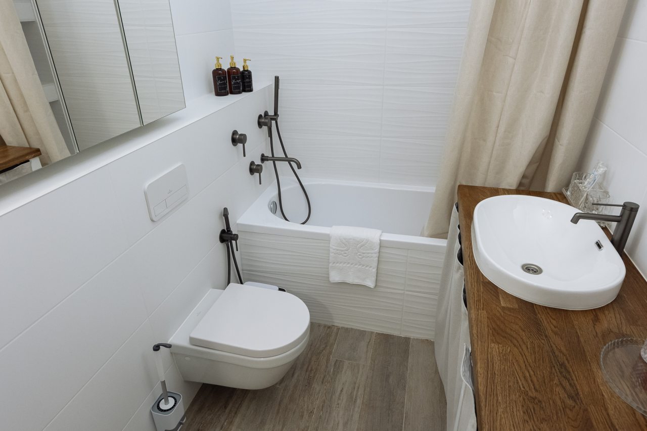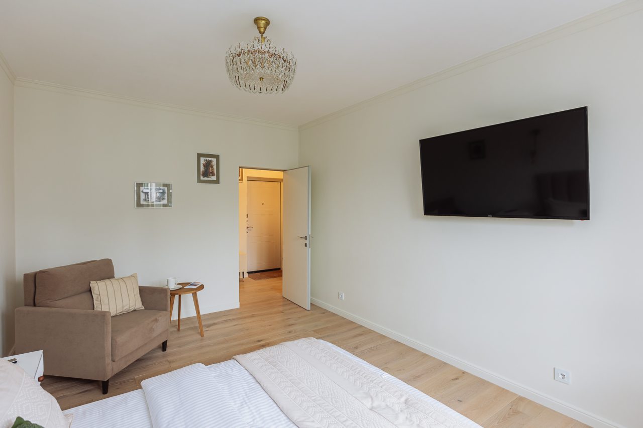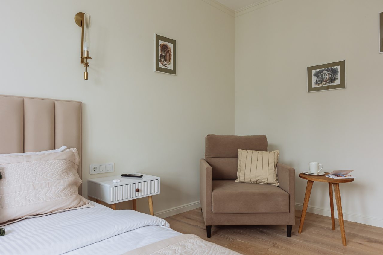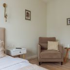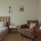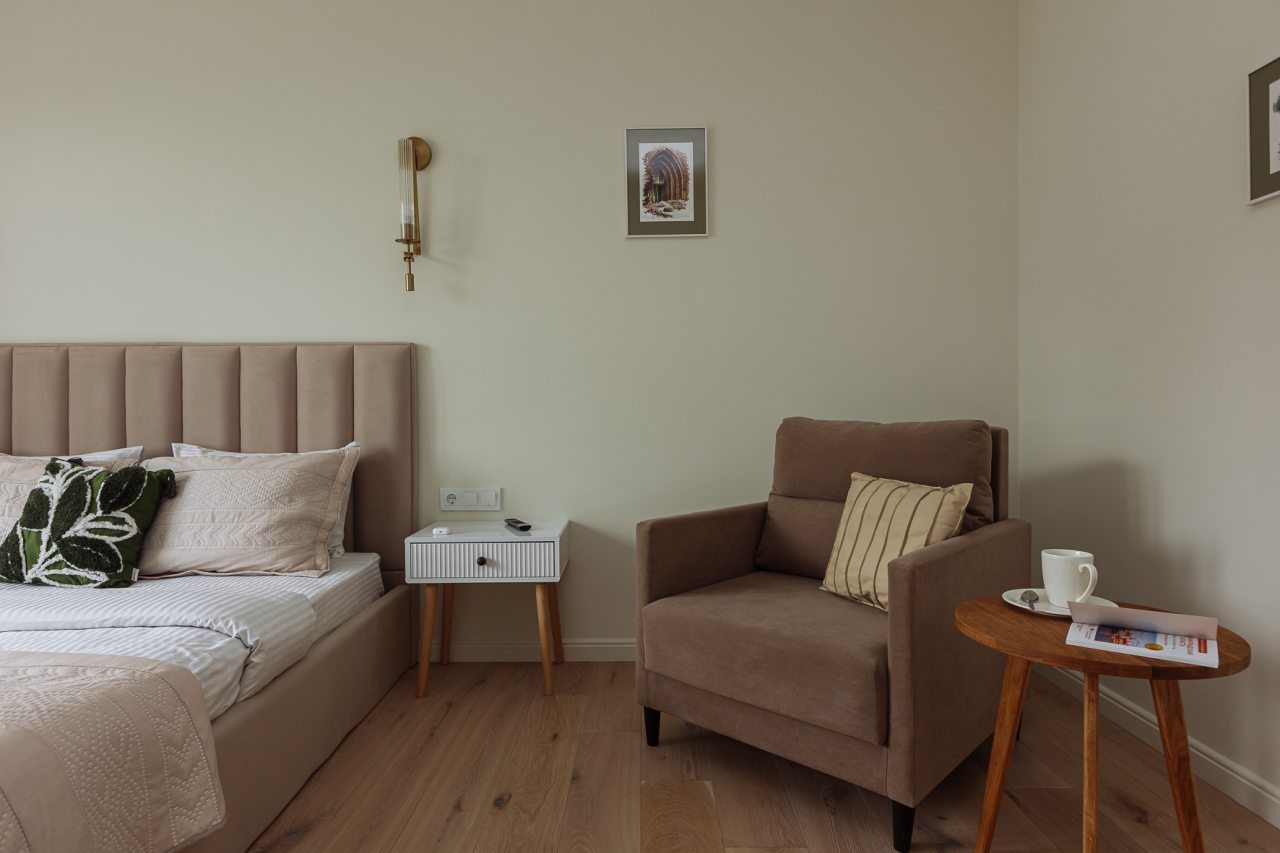 К размещению отдыхающих представлены уютные апартаменты в приятной цветовой гамме и нежных оттенках. Они укомплектованы необходимой мебелью и техникой для качественного отдыха: двуспальная кровать с набором свежего постельного белья, прикроватные тумбочки, мягкое кресло, телевизор для просмотра передач и уютная зона отдыха у окна. В ванной комнате имеются средства гигиены.