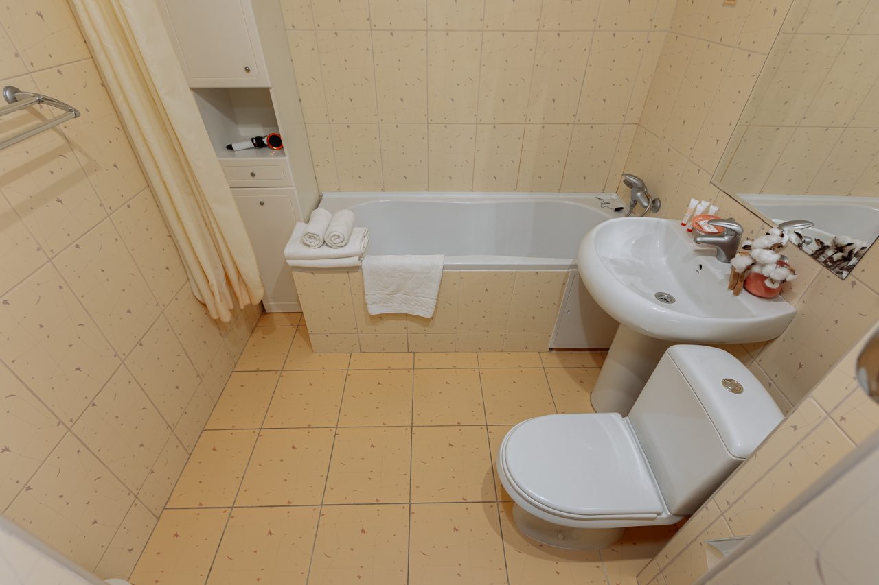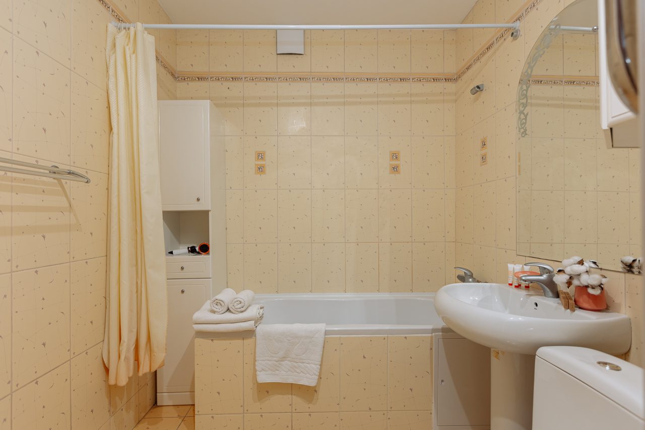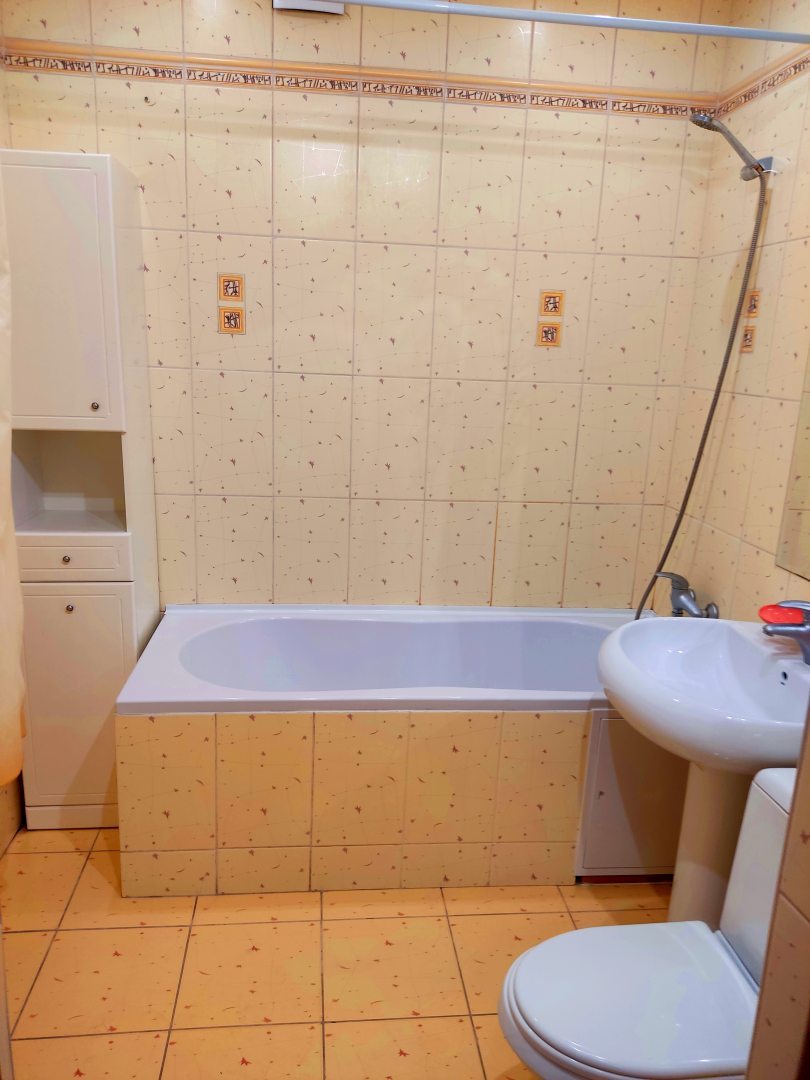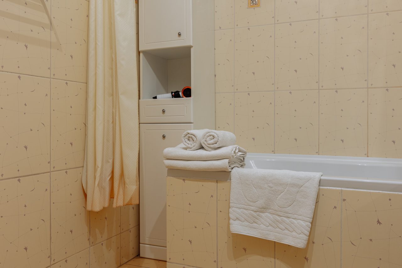 Остановиться предлагается в полностью оснащенной двухкомнатной квартире. В спальне выход на балкон, двуспальная кровать, вместительный шкаф, а в гостевой зоне большой диван и телевизор. В ванной приготовлен комплект полотенец, косметических средств и стоит стиральная машина.