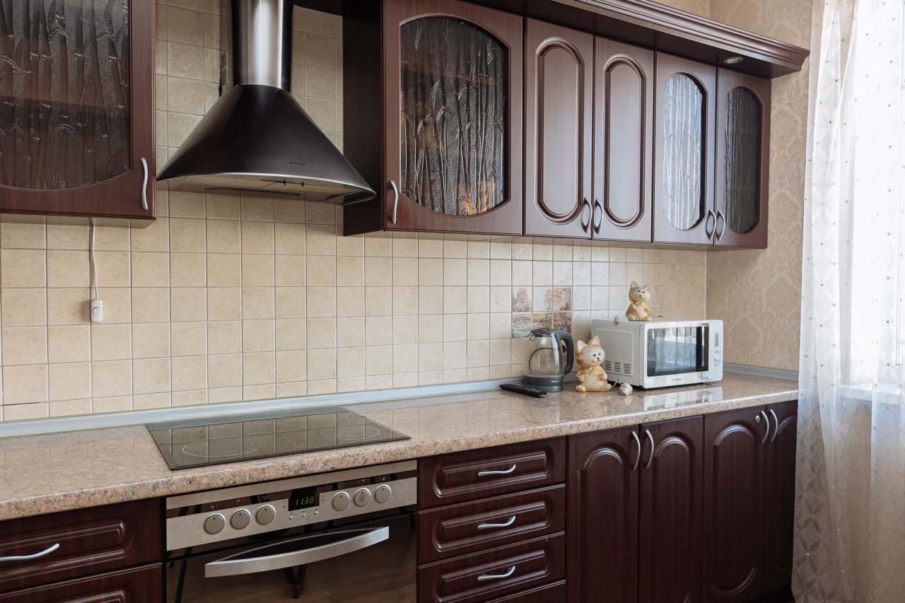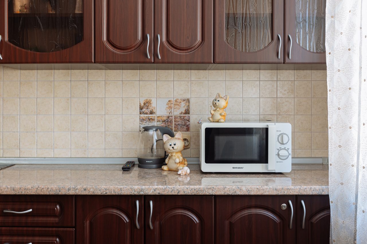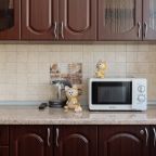 Квартира 2-х комнатная. Кухня большая. Есть детская кроватка, детский стул, . Ванная комната чистая. Есть фен, зубная паста и щётки, мыло, шампунь, туалетная бумага. На кухне СВЧ, чайник, холодильник, плита индукционная, кастрюли, сковородки, ножи вилки, Терка, открывашки, стаканы, чашки, тарелки.