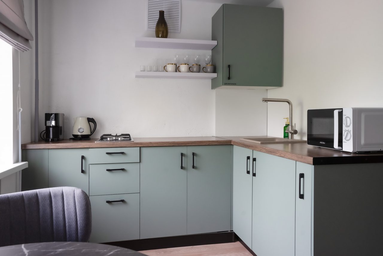 На кухне можно найти полный набор бытовой техники, посуду и столовые приборы. В здании дома работает популярный ресторан немецкой кухни, бар, различные магазины.