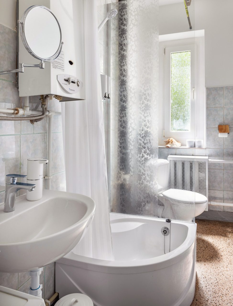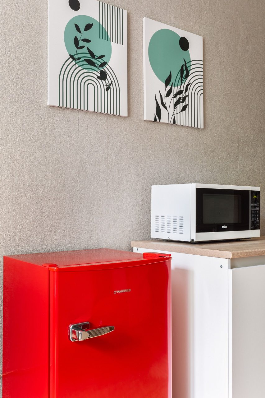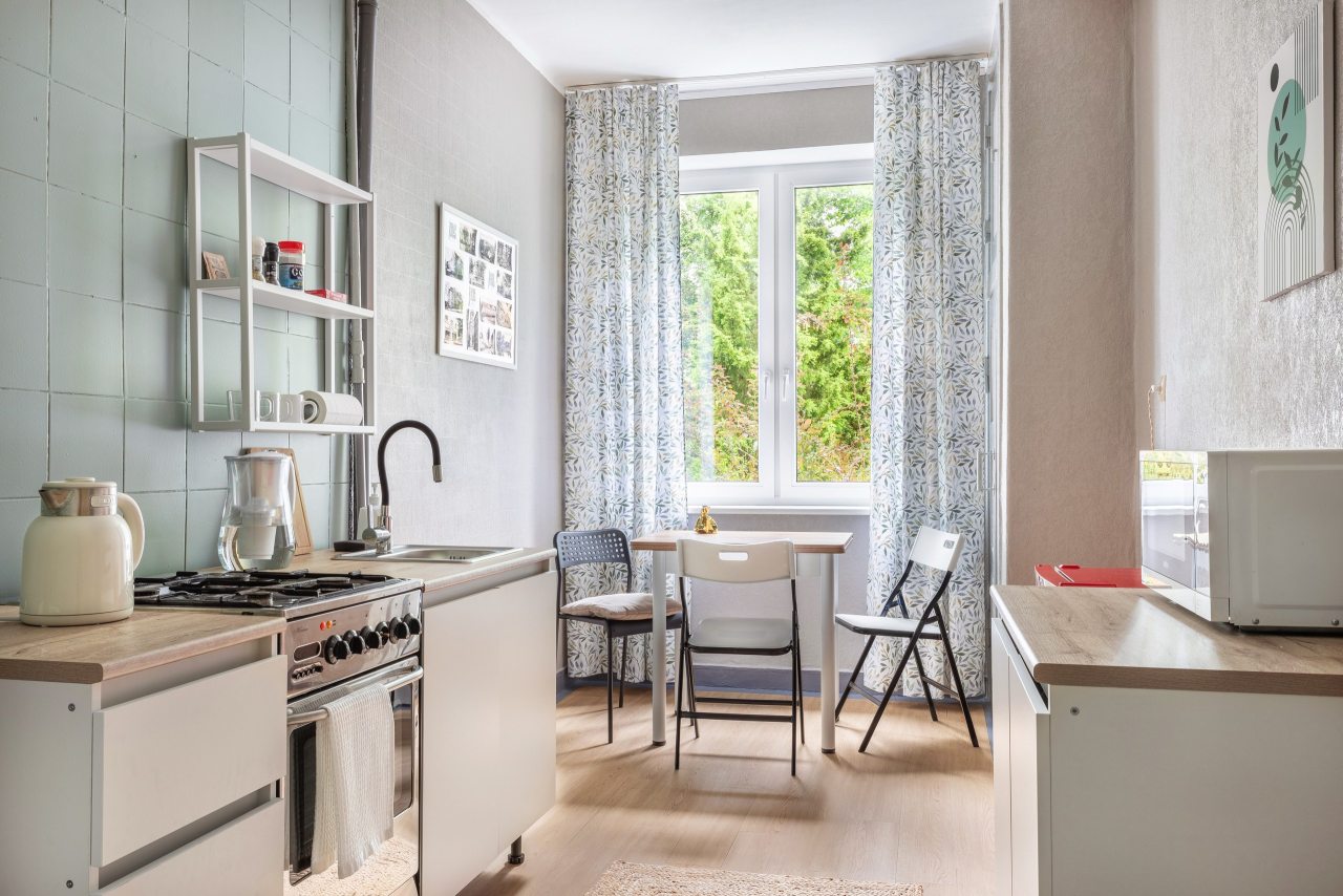 Светлая кухня оборудована микроволновой печью, чайником, газовой плитой, духовым шкафом, набором посуды, холодильником. Пообедать можно в одном из множества кафе неподалеку.