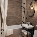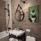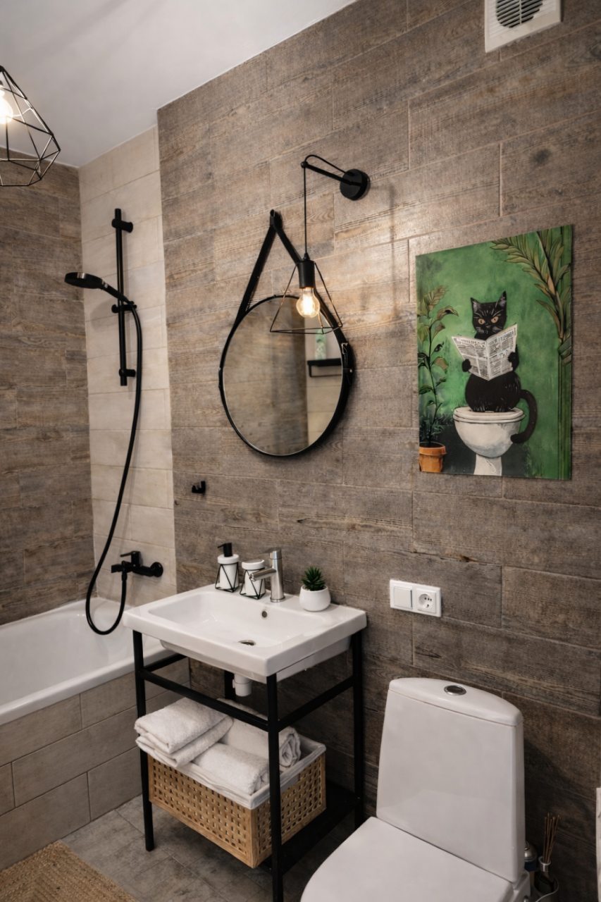 Чтобы отдых прошёл с комфортом, в апартаментах есть всё необходимое мебельное и техническое оснащение: двуспальная кровать с комплектом свежего постельного белья, диван, телевизор, светильники, шкаф, рабочий стол. Поддерживать связь с близкими людьми поможет скоростной Wi-Fi. Санузел оснащён сантехникой со стиральной машиной, средствами гигиены и набором полотенец.