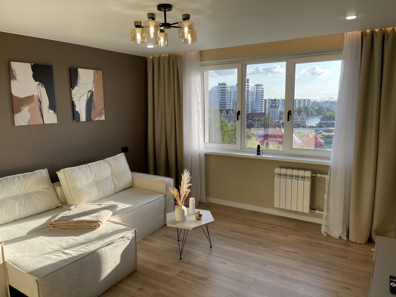 «Стильные видовые в самом сердце города» — это апартаменты, которые находятся в Калининграде, напротив живописной реки Преголя и Синагоги.