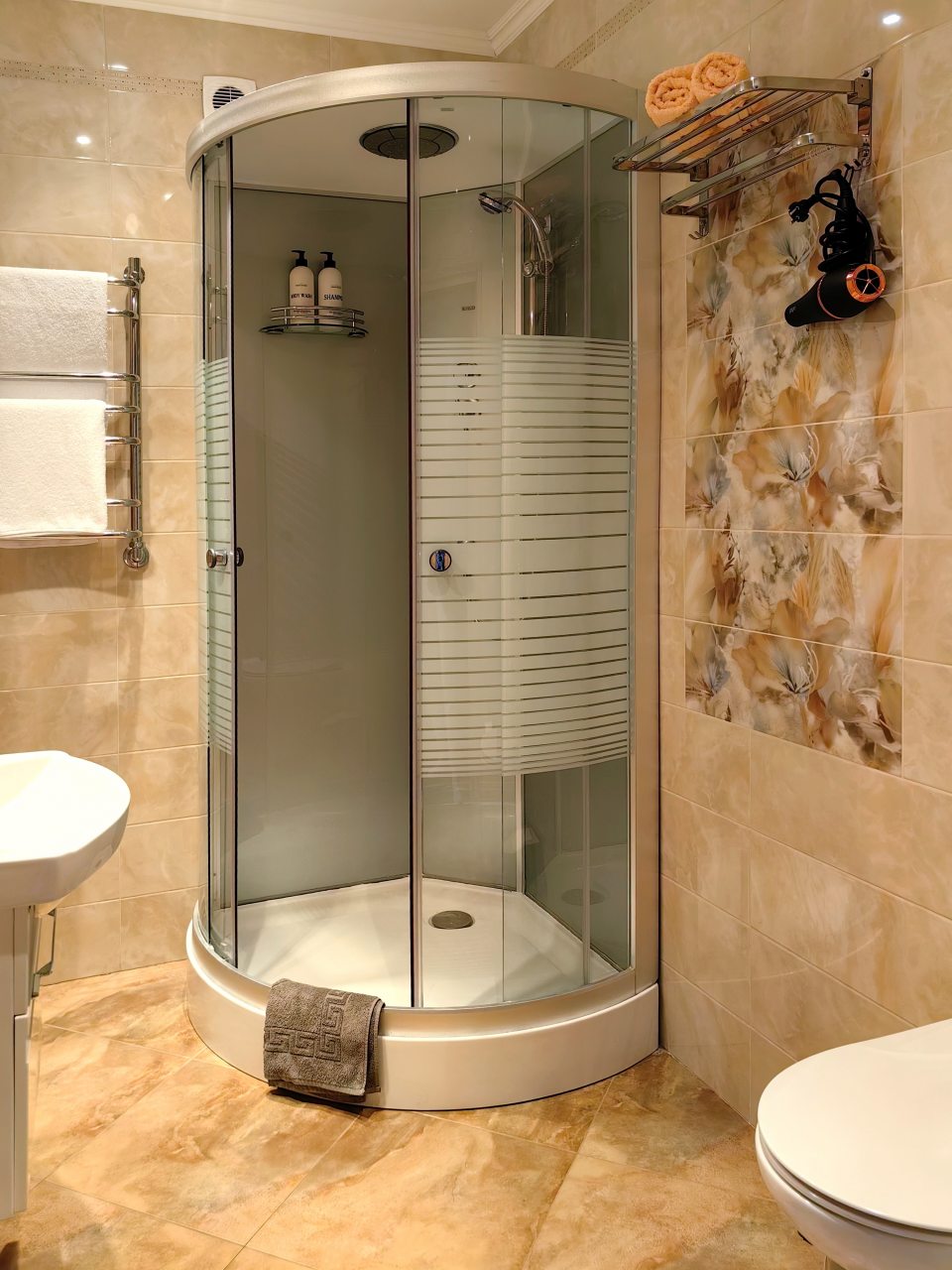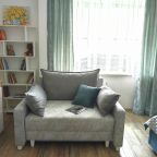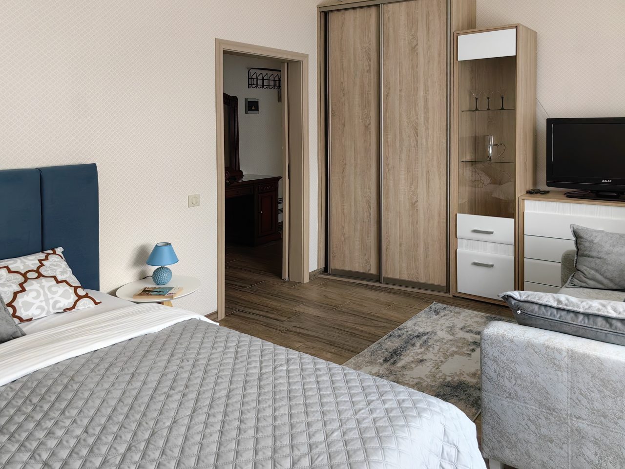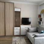 Комфортабельные апартаменты выполнены в современном дизайне и укомплектованы удобной мебелью и техникой: мягкий и большой диван, несколько кресел, шкаф для книг, комод и шкаф для хранения личных вещей, телевизор. В санузле имеется душевая кабина, полотенца и гигиенические средства.