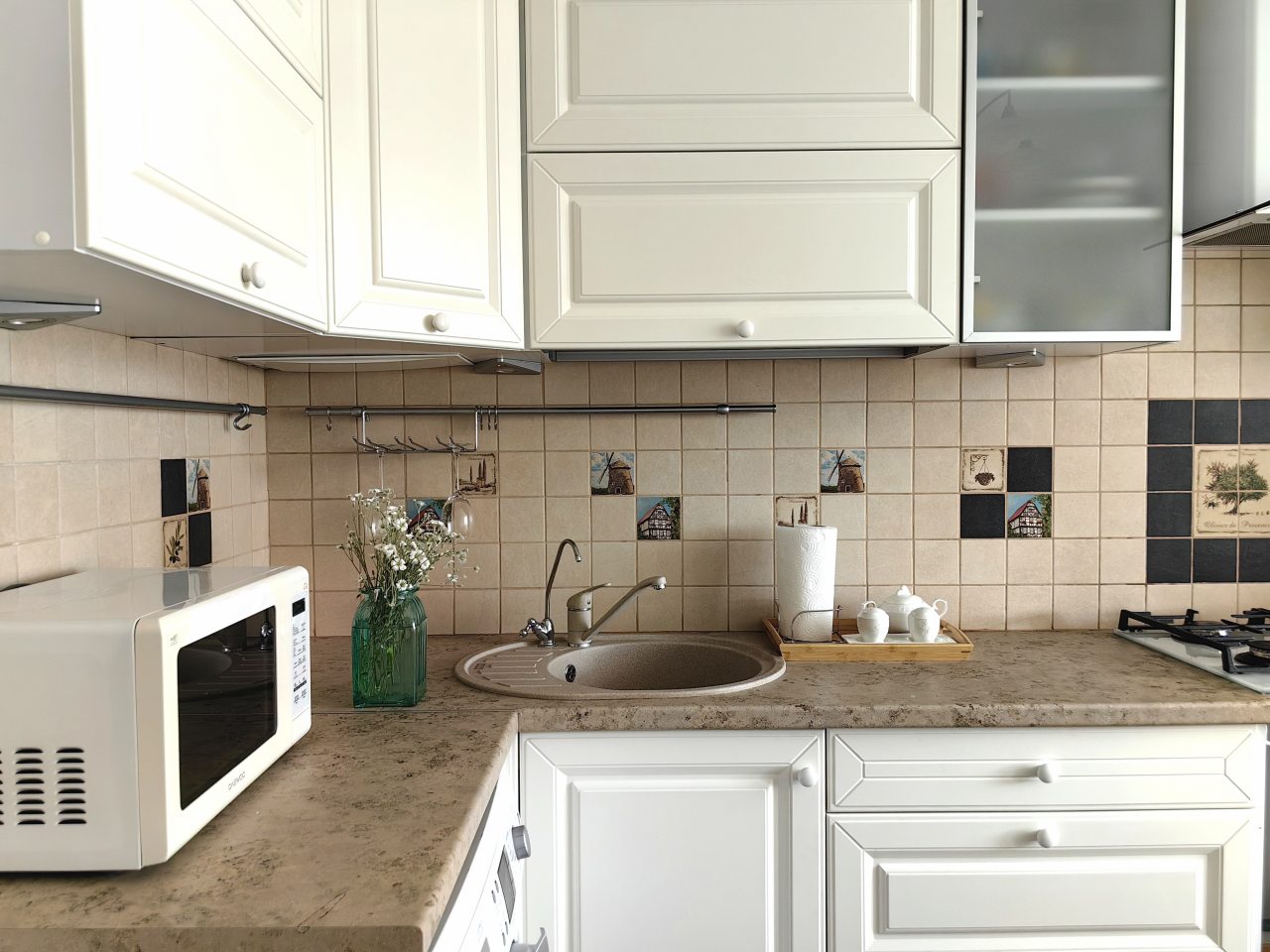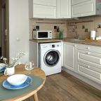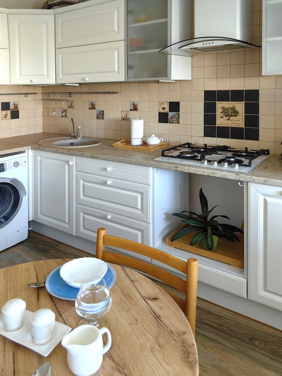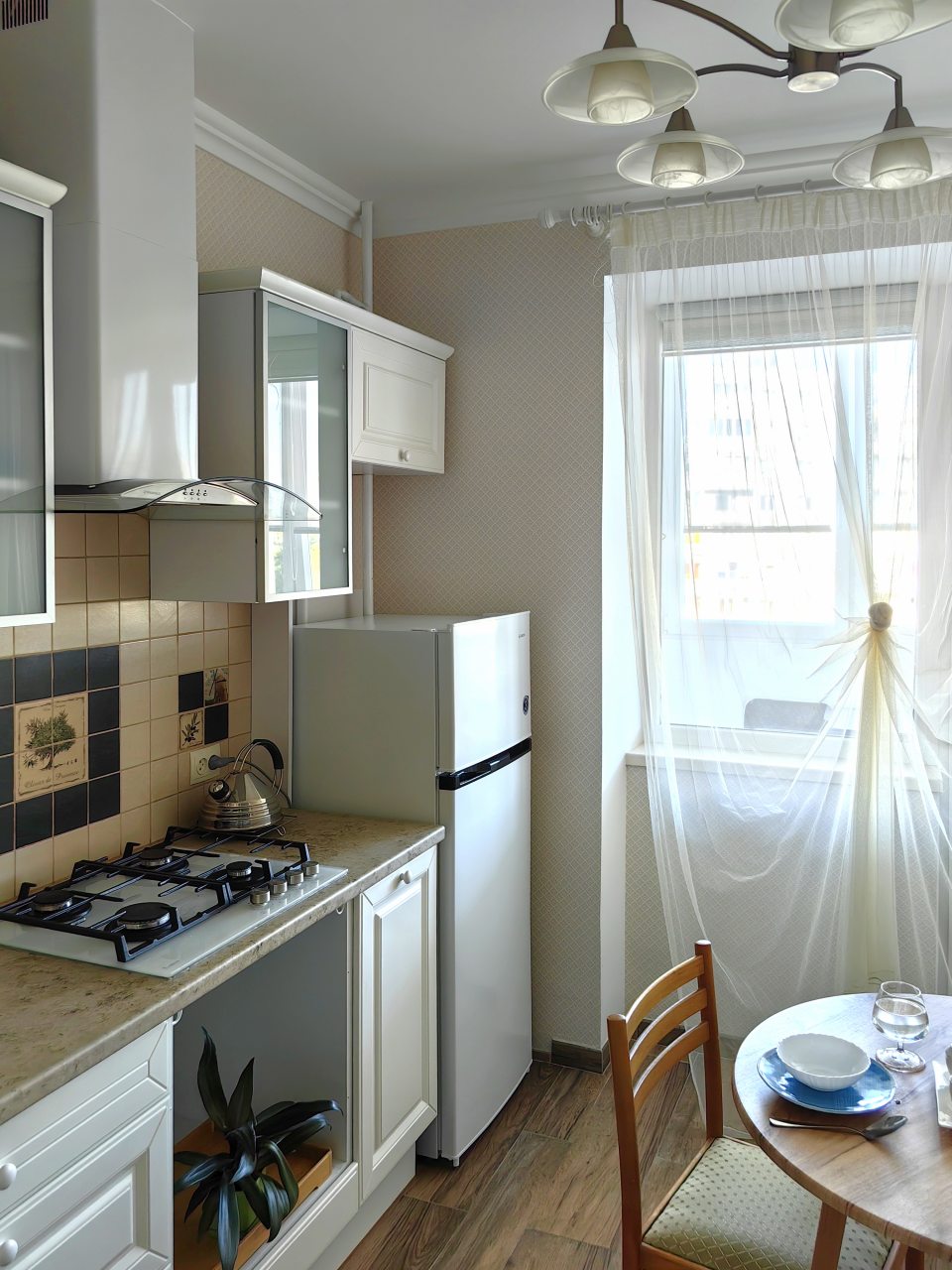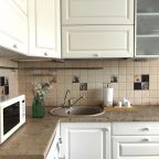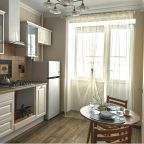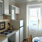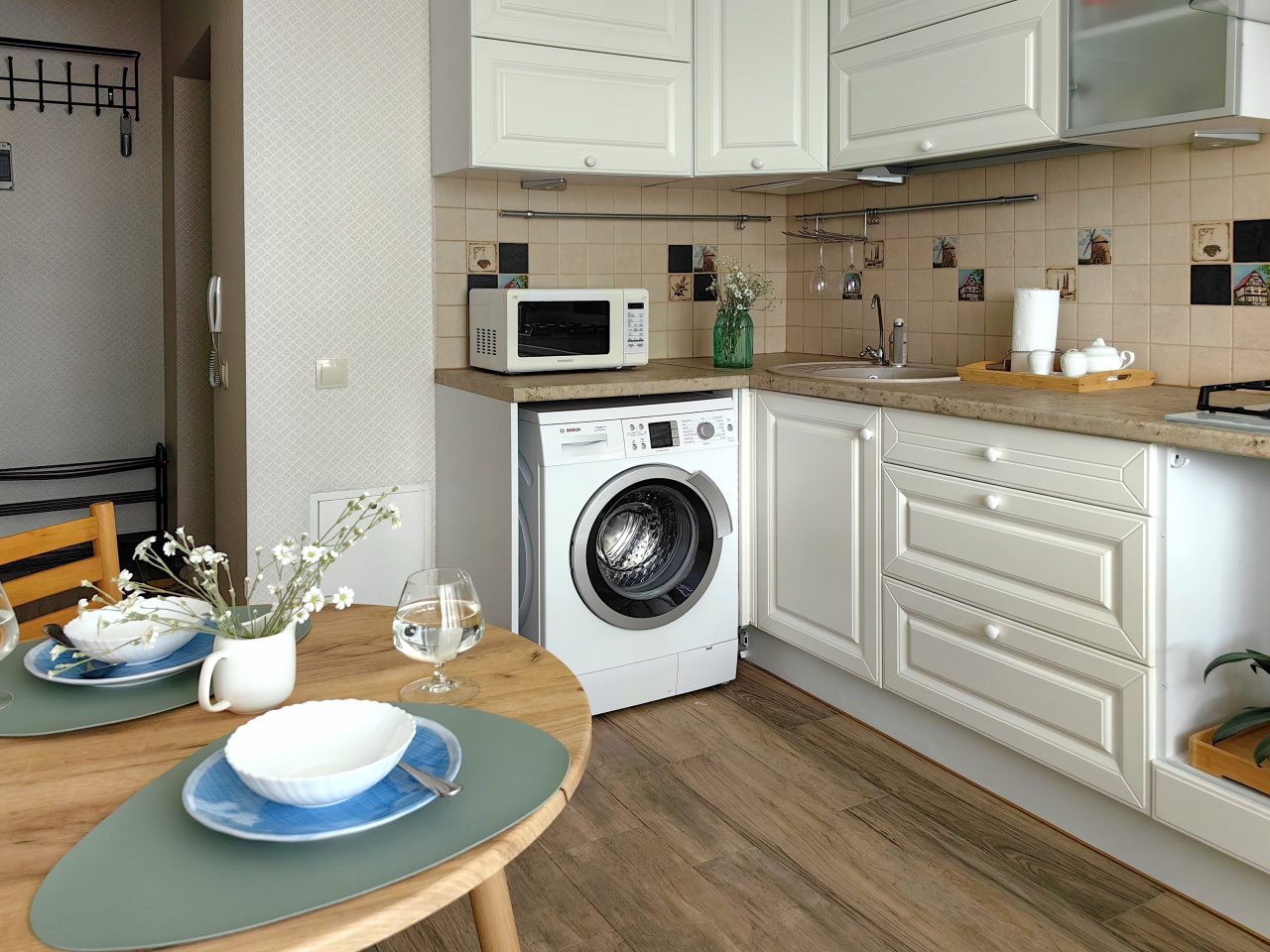 Светлый кухонный гарнитур оснащен стиральной машинкой и бытовой техникой, благодаря которой каждый гость сможет приготовить блюда и напитки. Есть круглый стол и стулья, набор посуды. Для вкусных и сытных обедов вне апартаментов можно посетить заведения поблизости: сеть быстрого питания, рестораны «Табаско» и «Цотлер Крафт».