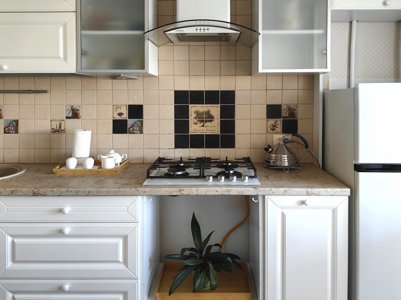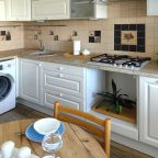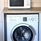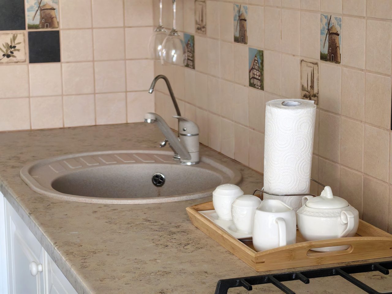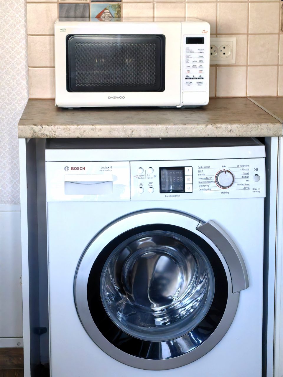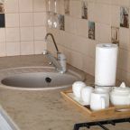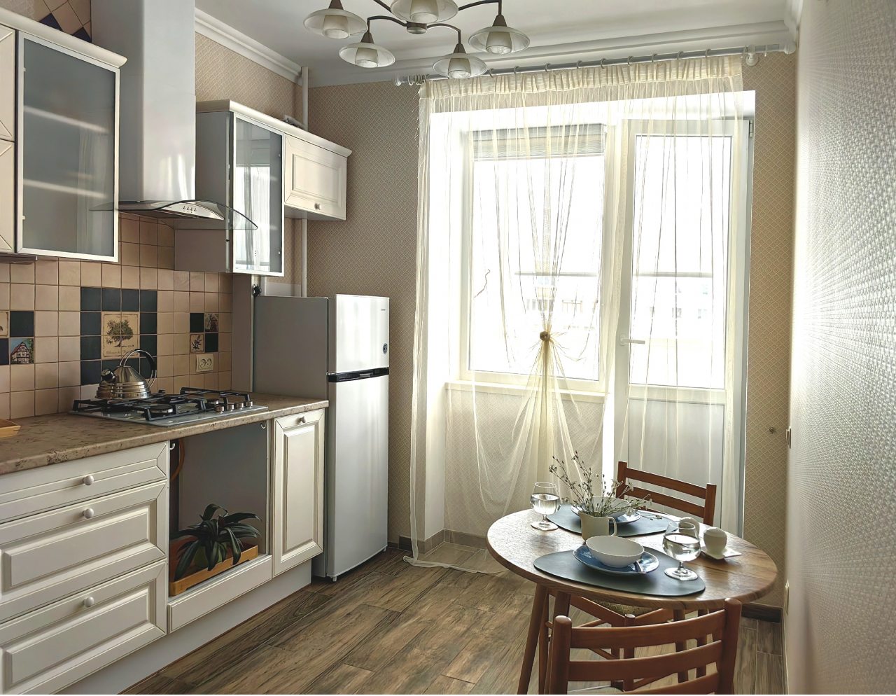 Светлый кухонный гарнитур оснащен стиральной машинкой и бытовой техникой, благодаря которой каждый гость сможет приготовить блюда и напитки. Есть круглый стол и стулья, набор посуды. Для вкусных и сытных обедов вне апартаментов можно посетить заведения поблизости: сеть быстрого питания, рестораны «Табаско» и «Цотлер Крафт».