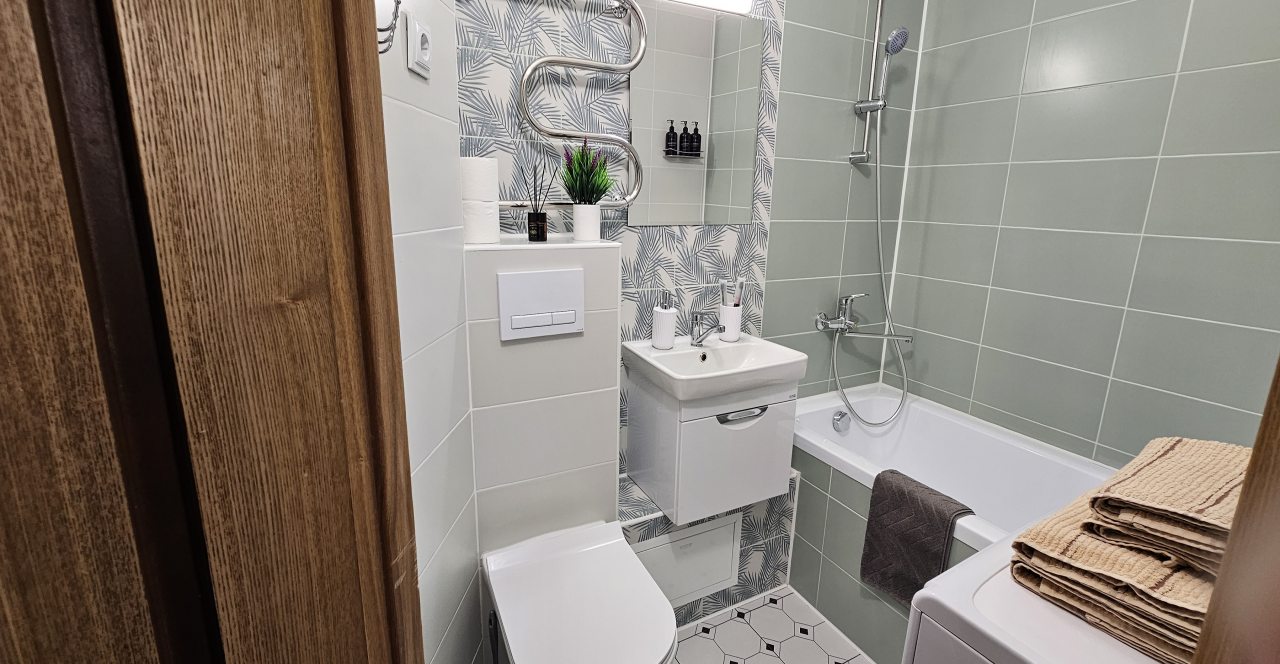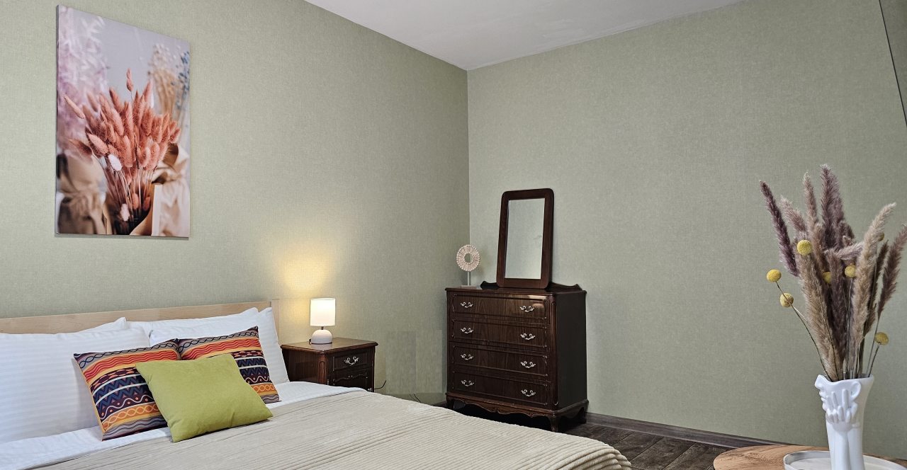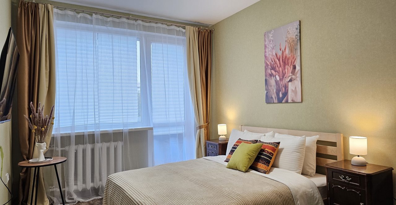 Для размещения представлены апартаменты с ремонтом в современном стиле. Они укомплектованы мебелью и техникой для приятного времяпровождения: кровать с набором свежего постельного белья, прикроватные тумбочки, телевизор для просмотра любимых телеканалов. В ванной комнате имеется необходимая сантехника. При желании гости могут воспользоваться сушилкой для вещей и гладильными принадлежностями.