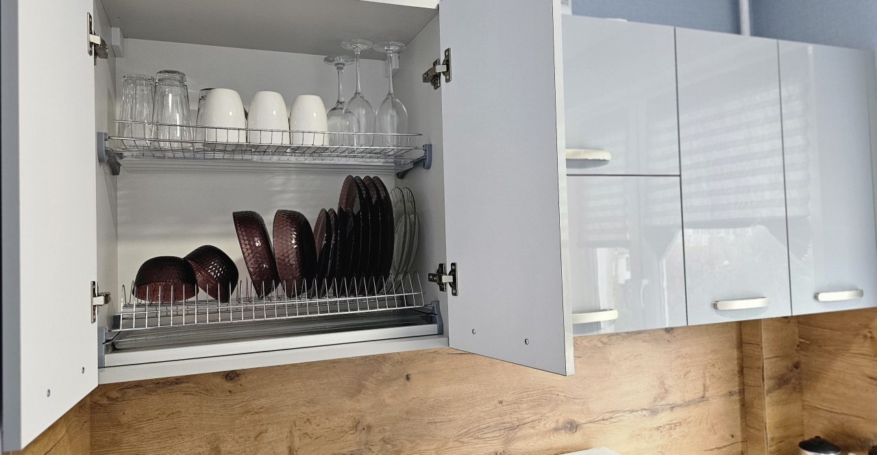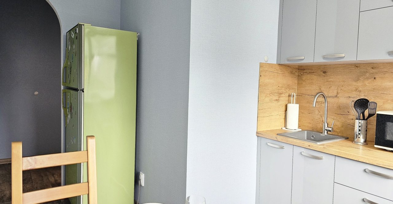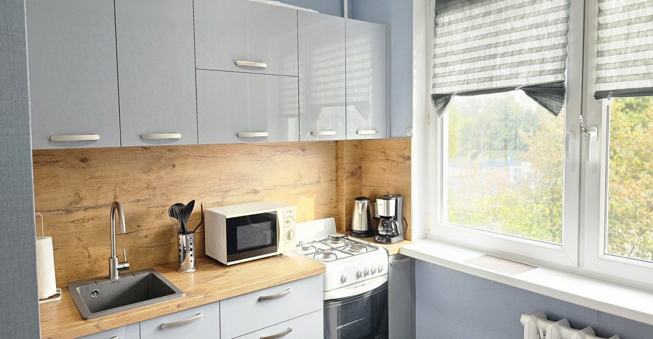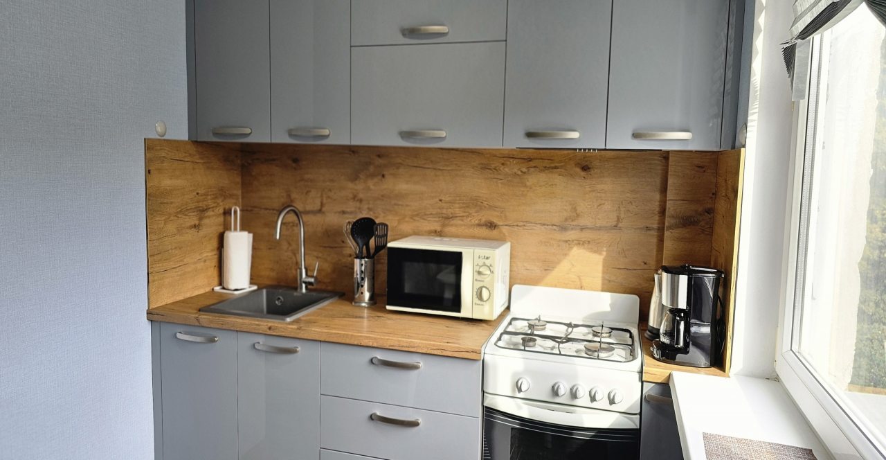 На небольшой кухне установлена техника для приготовления блюд: газовая плита, микроволновая печь, электрический чайник, а также посуда и кухонная утварь. Поблизости есть булочная, кафе и пекарня.