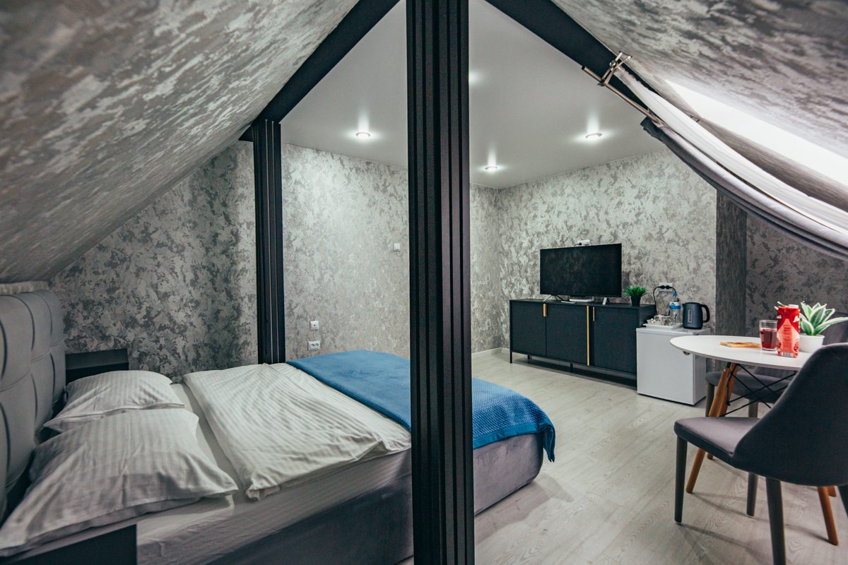 Гостям предлагается проживание в комфортабельных номерах с современным ремонтом, где есть двухместная кровать, диван, телевизор с онлайн-кинотеатром, собственный санузел. Предусмотрены банные принадлежности, тапочки.