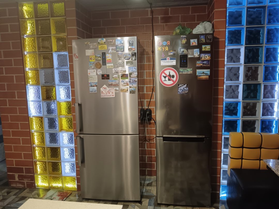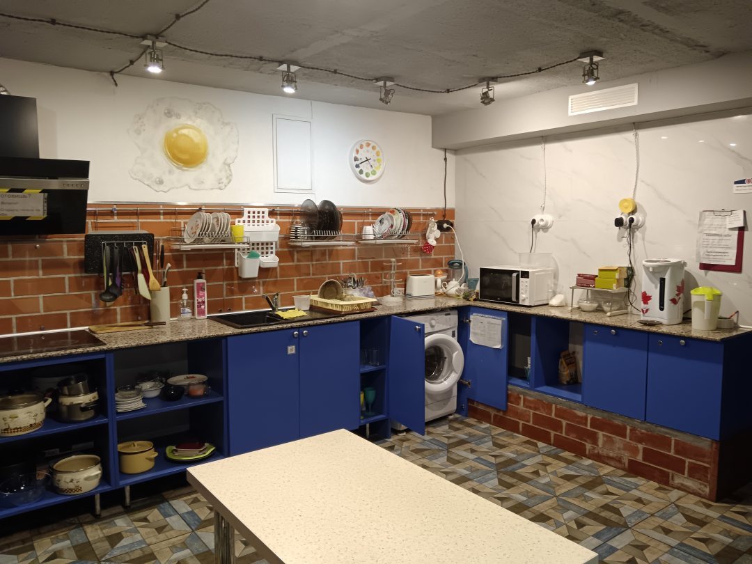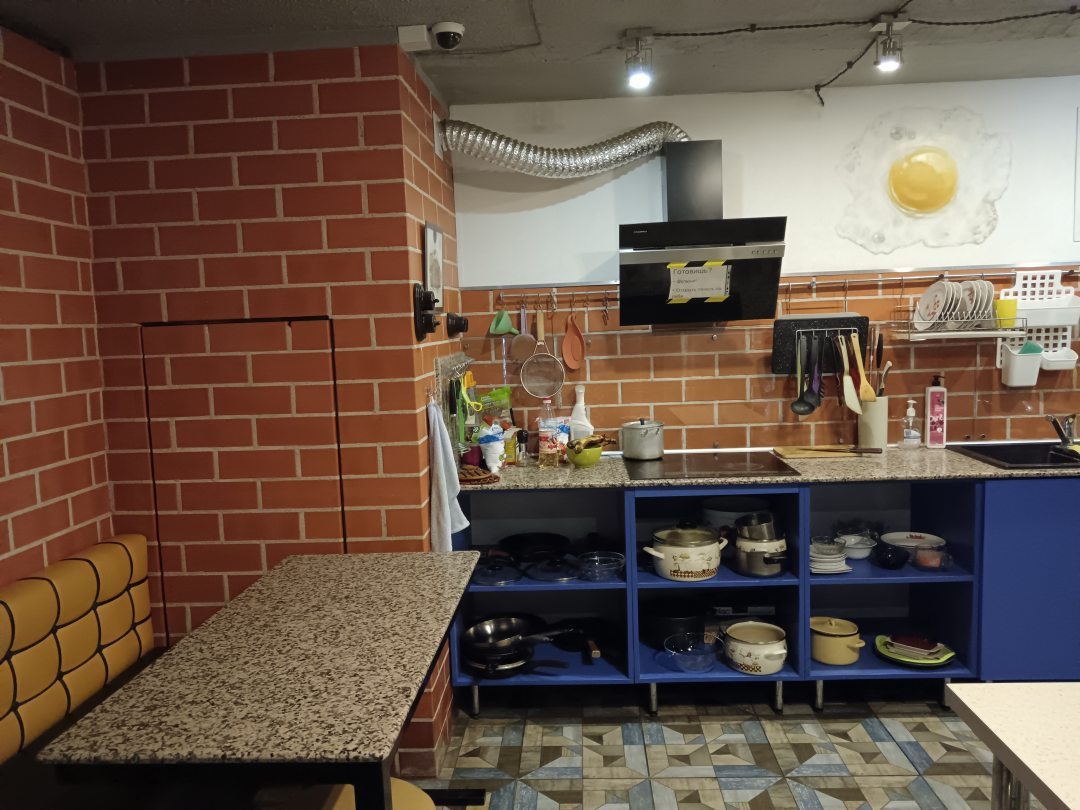 Питание гостей организовано на общей кухне, которая вмещает в себя современную бытовую технику, кухонные принадлежности и посуду, а также, обеденный уголок.