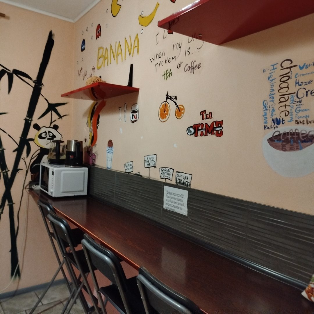 Спокойный и красивый район. На несколько номеров миникухня с холодильником, газовой плитой на 2 конфорки, микроволновка, два чайника, есть посуда, столовые приборы и кастрюли - сковородки. При сильных холодах в номере тепло. По задумке просто здорово. Соотношение цены и качества хорошее.