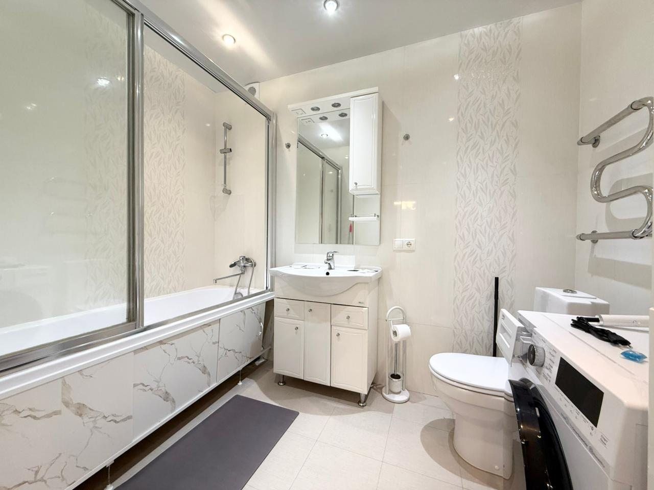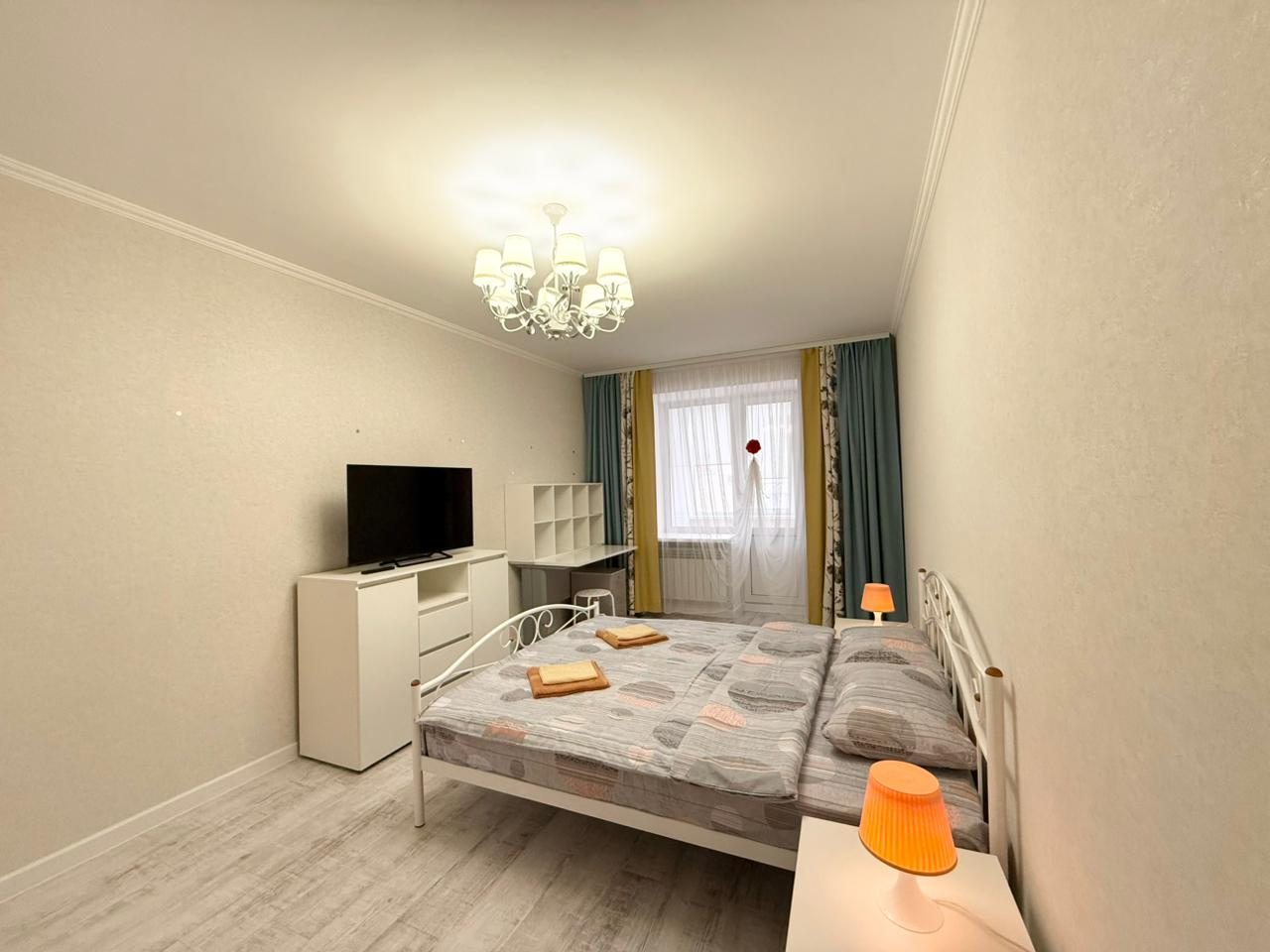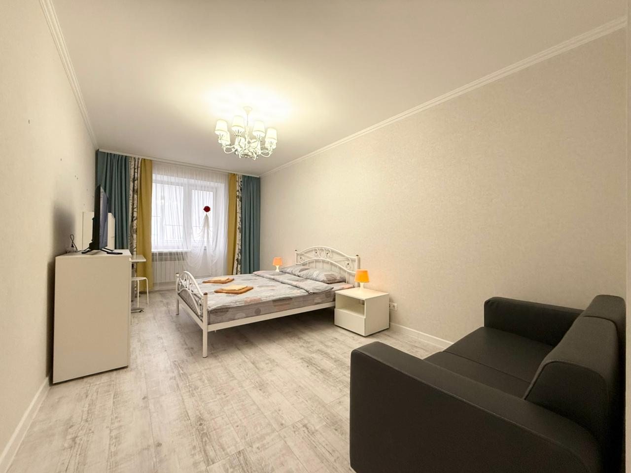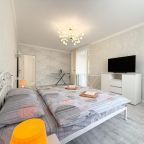 На просторной площади 87 квадратных метров имеется большая и удобная двуспальная кровать, кондиционер, прикроватные лампы, телевизор с комодом, гладильные принадлежности, вместительный шкаф, балкон, диван, а также ванная комната со стиральной машиной.